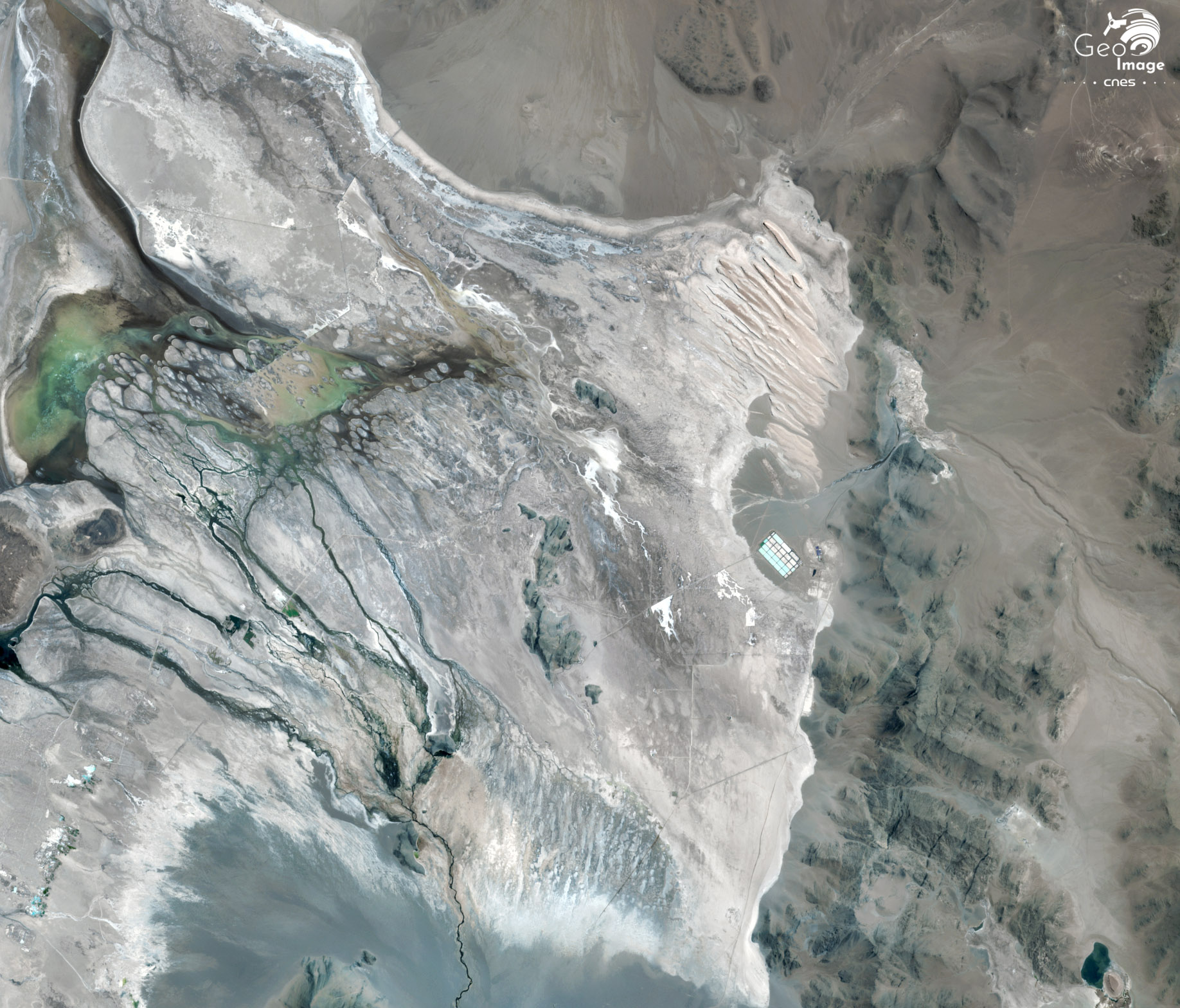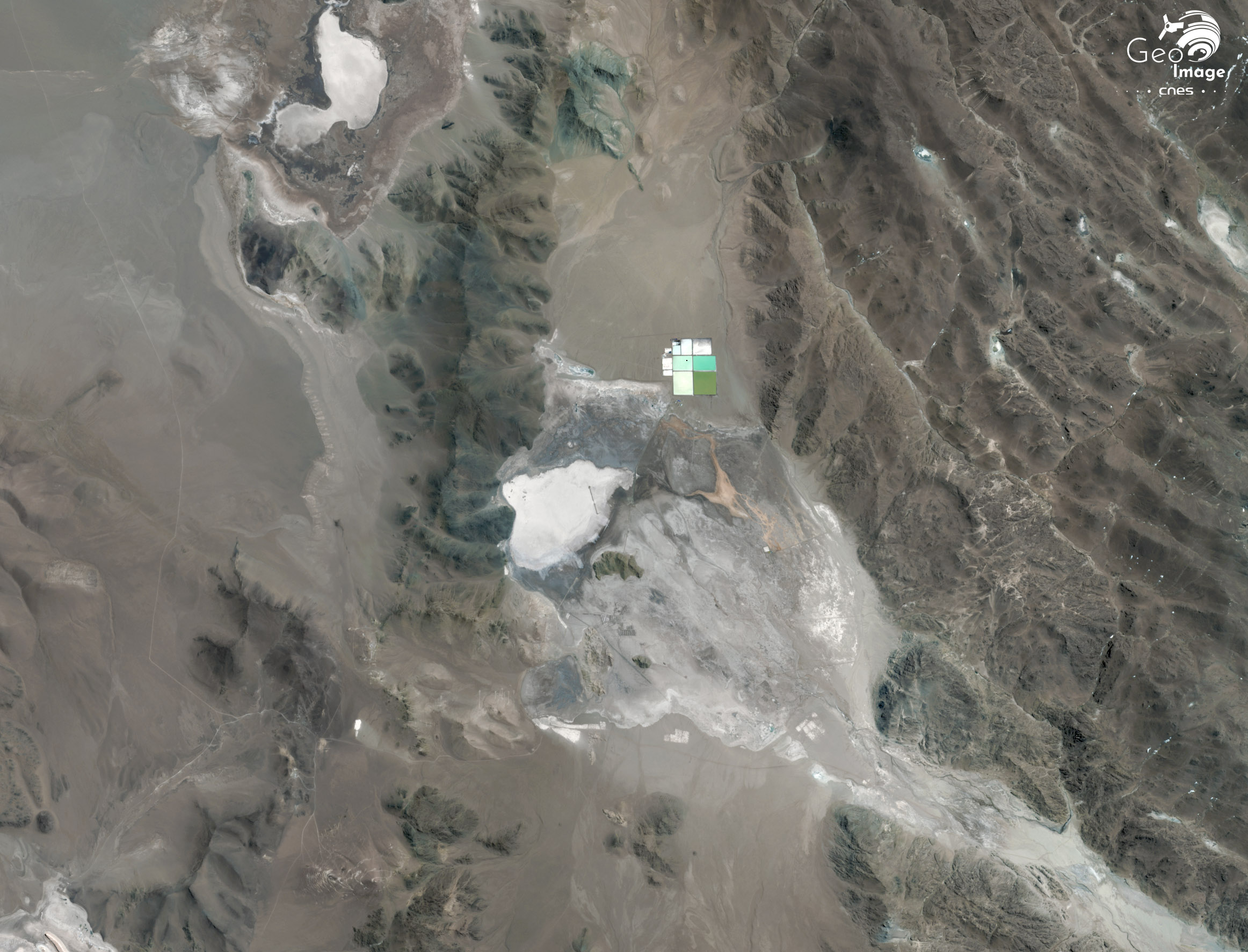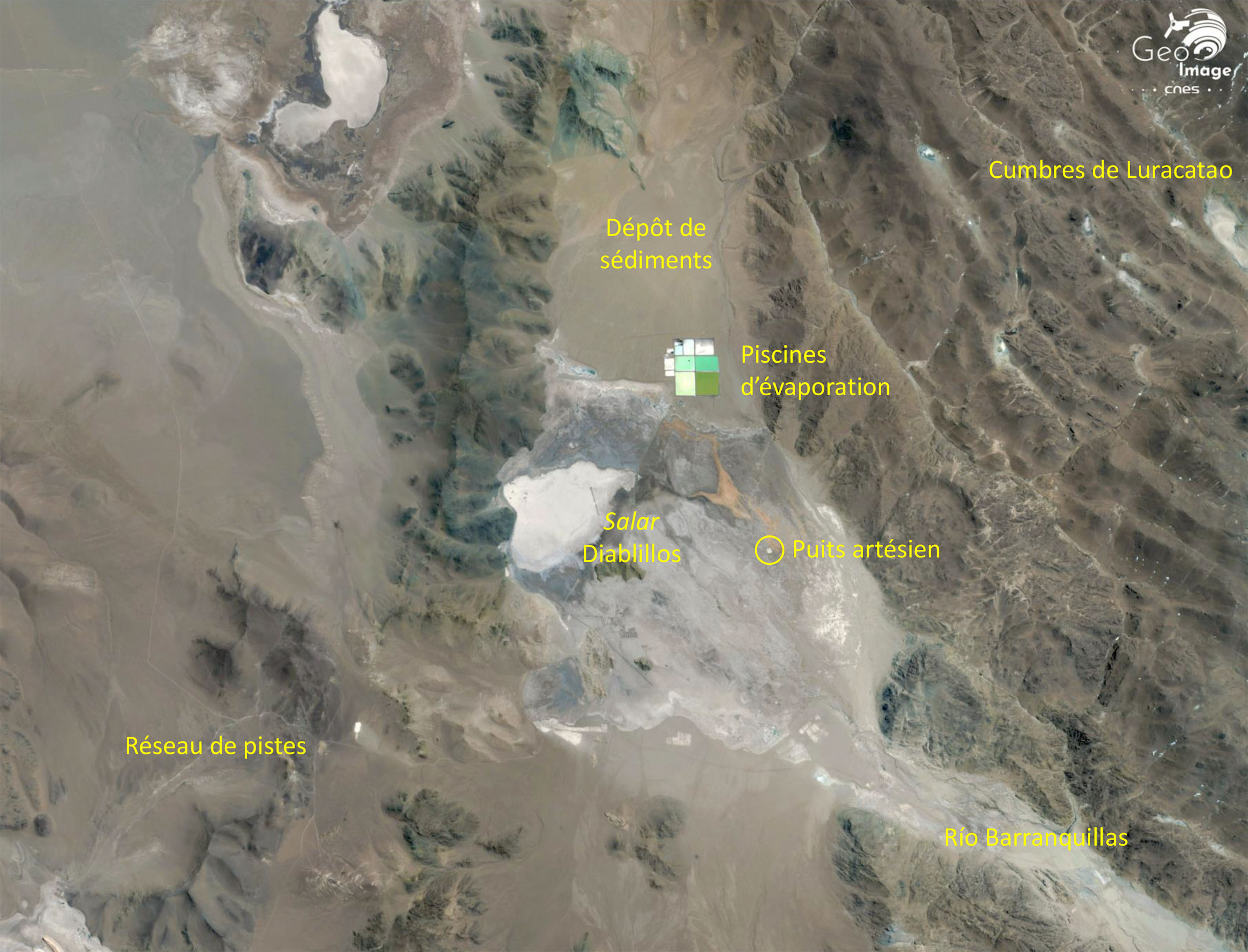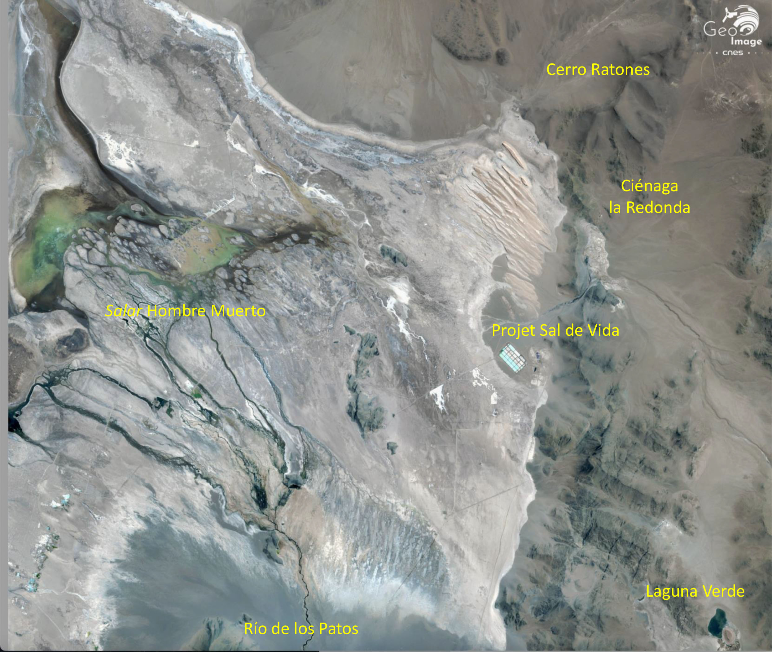 Sur l’image apparaît une trentaine de piscines d’évaporation, qui s’étend sur un peu moins de 20 hectares. Il s’agit pour le moment de piscines pilotes, de différentes tailles, utilisées durant la phase de faisabilité du projet. En vue de l’entrée en production, il est prévu la construction de 320 hectares de bassins d’évaporation et une usine de traitement du carbonate de lithium.