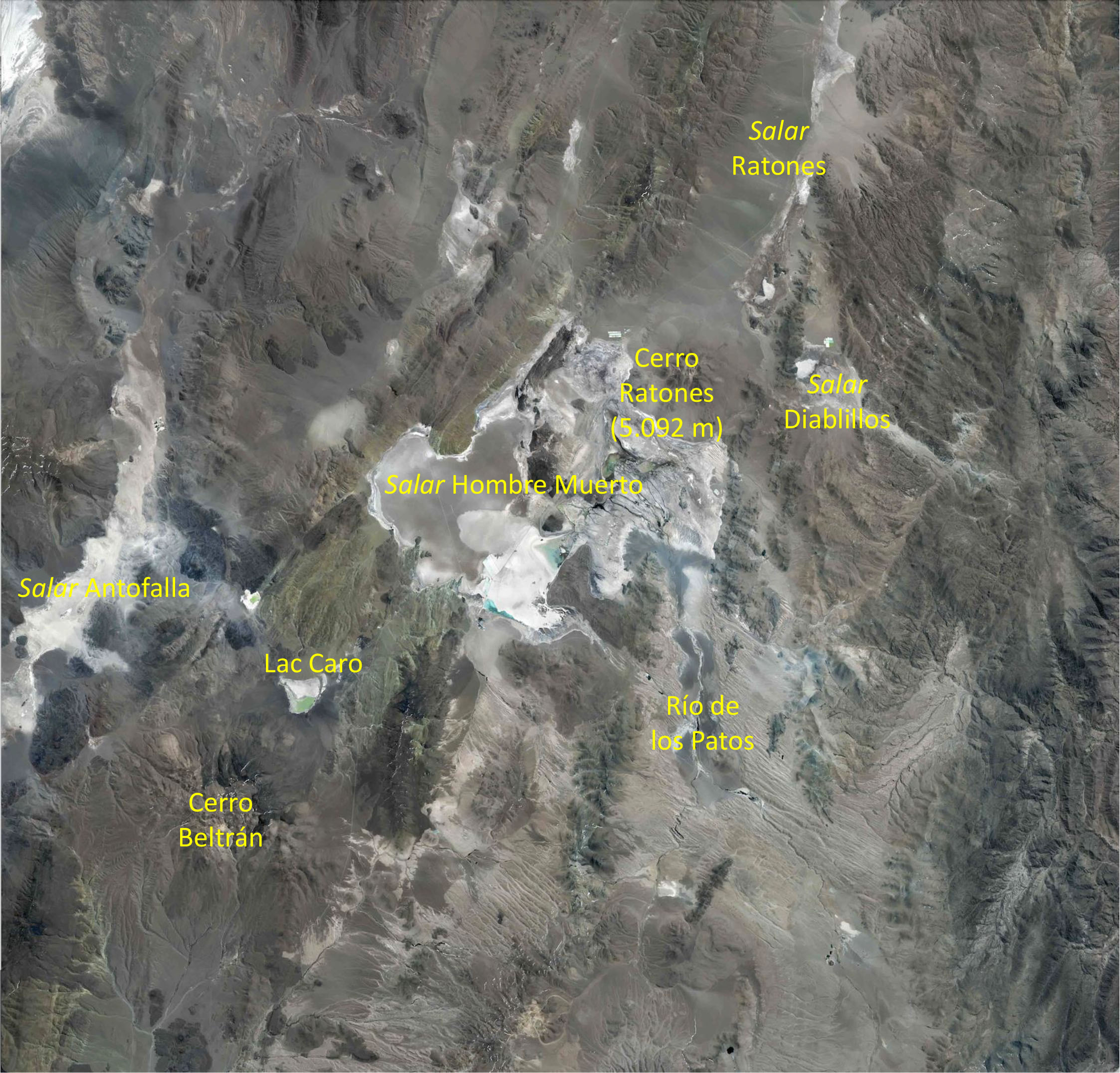 Situé à 4 100 mètres d’altitude, le salar Hombre Muerto s’étend sur une superficie de 565 km², à cheval entre les provinces de Salta, dans la partie supérieure de la photographie au Nord, et de Catamarca, dans la partie inférieure de la photographie, au Sud. Il est alimenté par le Río de los Patos, qui arrive par le Sud-Est et déverse ses eaux dans le bassin du salar, formant une sorte de delta.