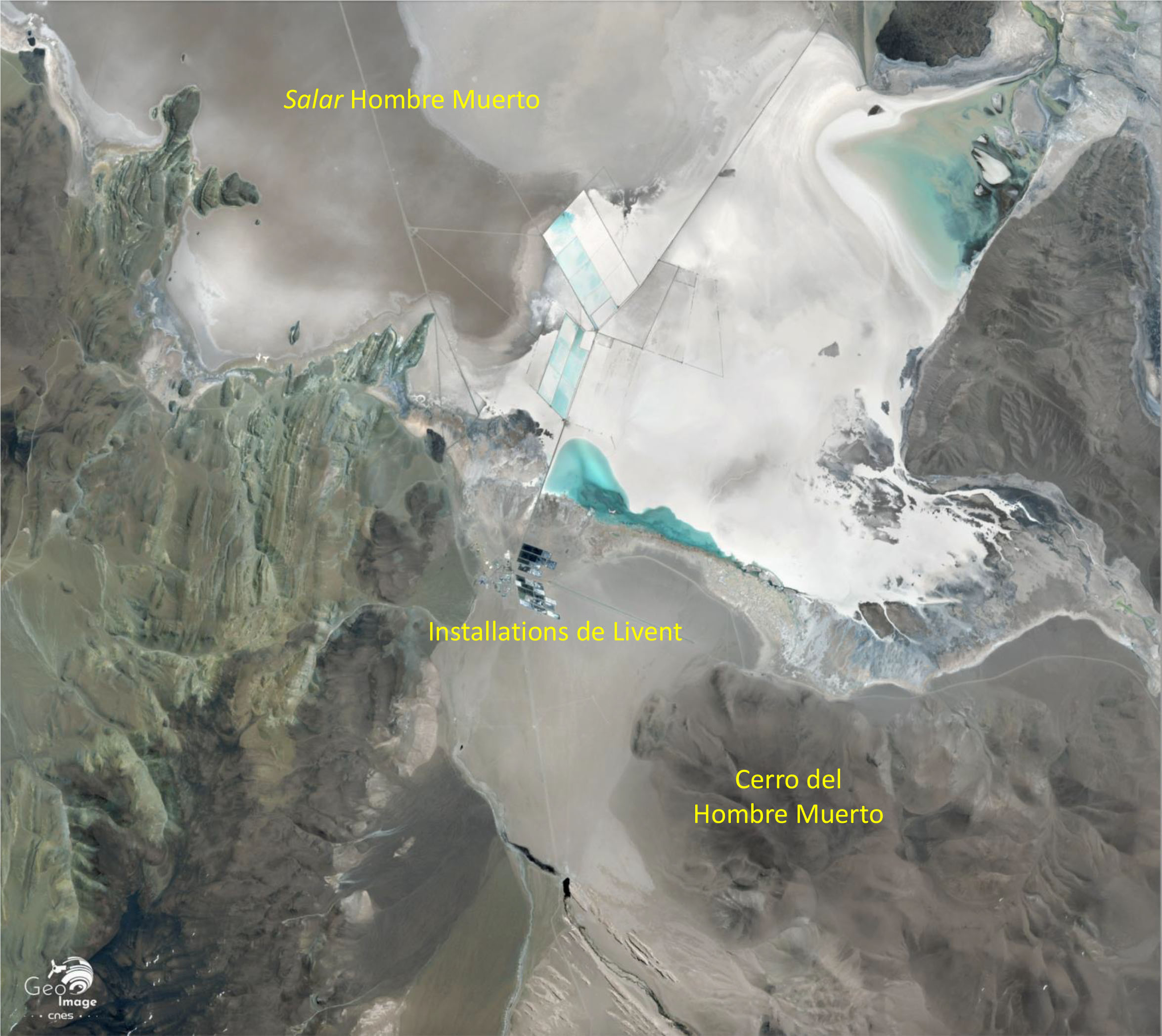 En Argentine, l’exploitation du lithium est effective à partir de 1998, lorsque l’entreprise étasunienne FMC (Food Machinery and Chemical Corporation) lance son activité industrielle sur le salar Hombre Muerto. Ce dernier est la principale structure géologique visible au centre de l’image. Sa couleur blanche est due aux concentrations de sels qui caractérisent les salares.