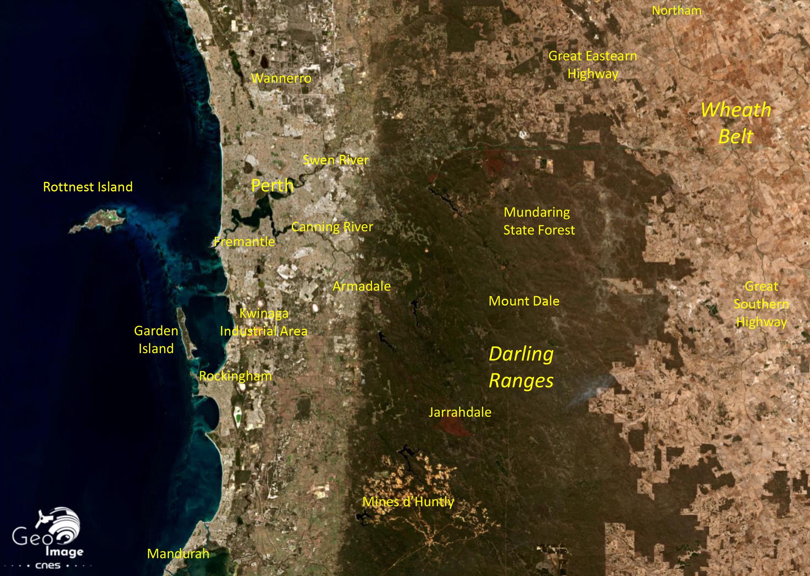 Par ailleurs, il s’agit de forêts très surveillées dans la mesure où les feux y sont fréquents. Les différentes couleurs du couvert forestier de l’image permettent de constater l’évolution différenciée de certaines parcelles forestières. La population est particulièrement vigilante aux feux de bush à proximité des communes périurbaines de l’est de l’agglomération de Perth (visible à l’ouest du zoom), de la même façon les routes, comme la Great Eastern Highway qui longent des forêts en traversant les Darling Range, sont autant de lieux d’observation pour les Australiens qui permettent de signaler d’éventuels départs de feu.