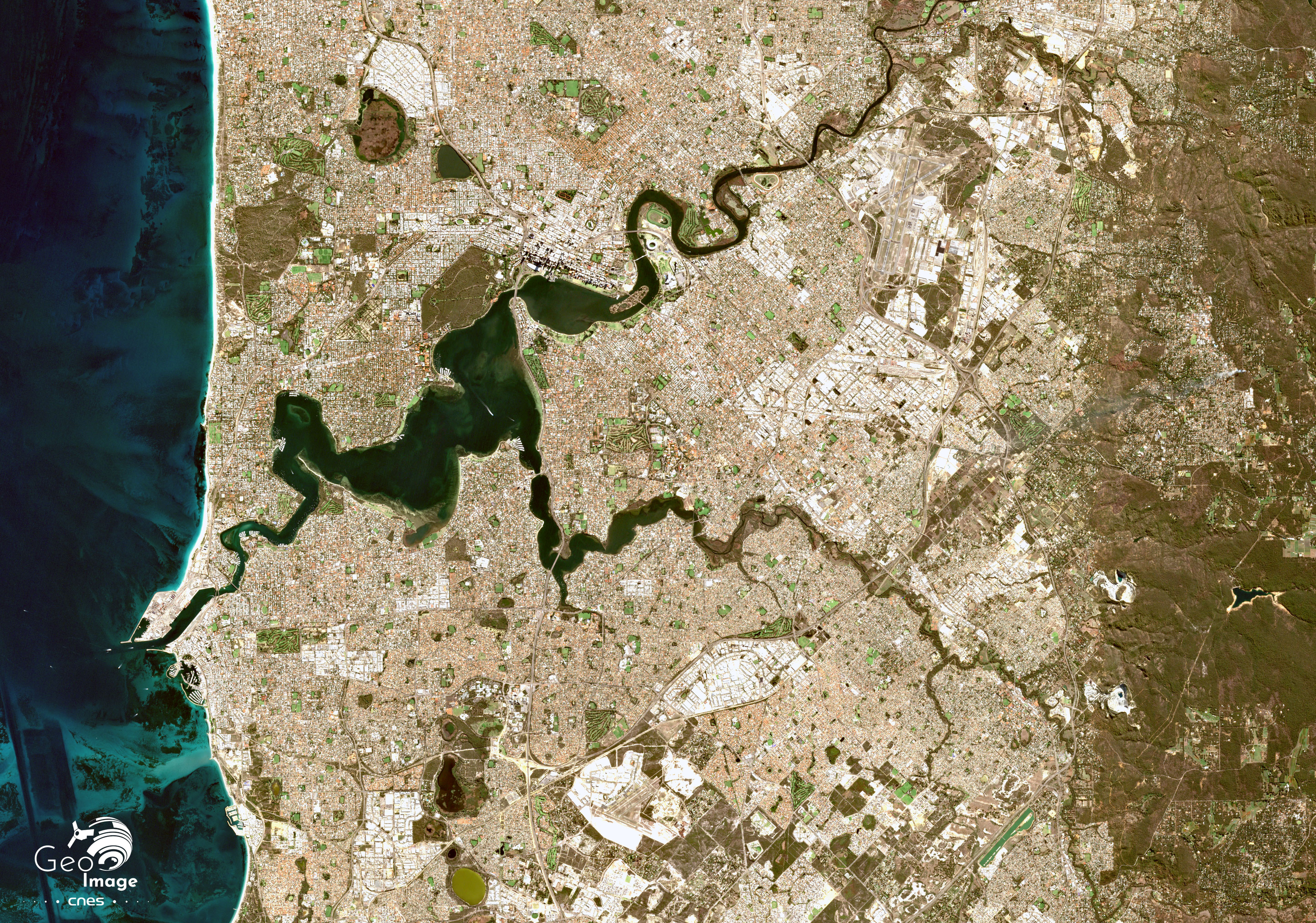La région est soumise au climat méditerranéen et est irriguée par de nombreux cours d’eau comme la Canning River et la Swan River autour desquels l’agglomération de Perth s’est bâtie. Il en va de même pour l’estuaire de la Swan River (au centre de l’image), interface autour duquel se sont développées des activités portuaires (à Fremantle), industrielles et récréatives (zoom 1). L’image satellite fait bien apparaître l’organisation spatiale de la région en trois bandes parallèles, orientées nord-sud.