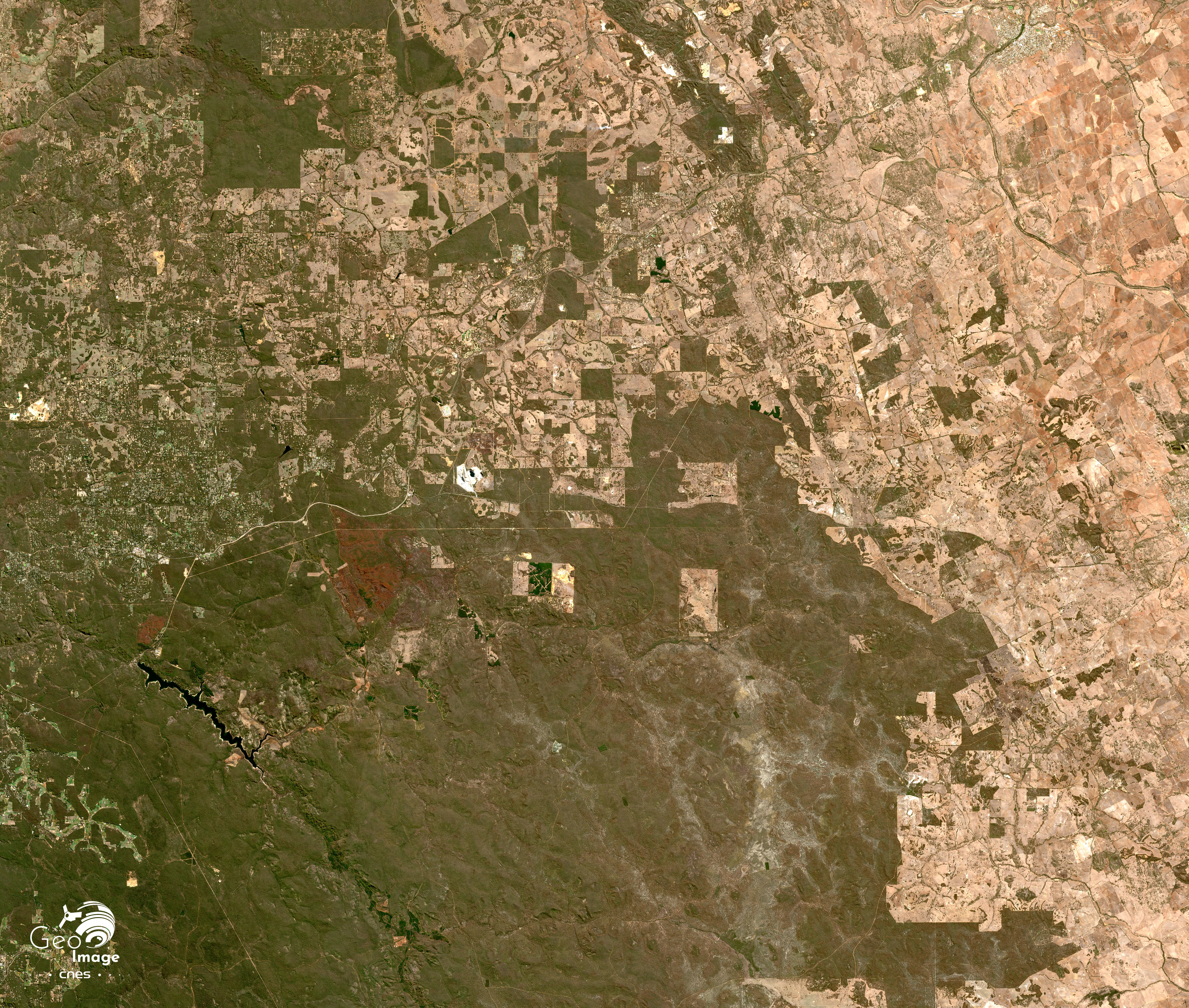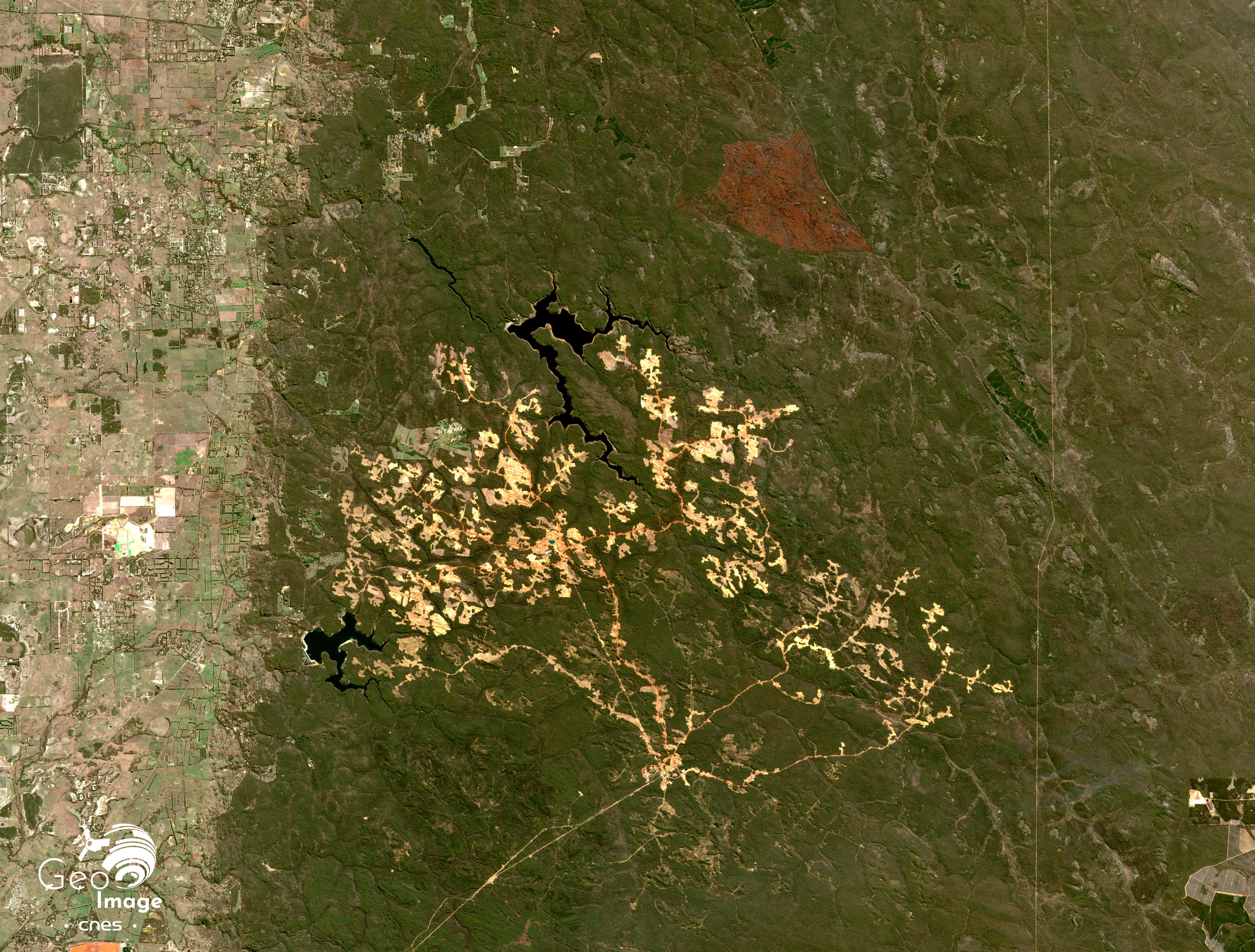 La question de la gestion de l’eau se pose. Les conflits d’usage potentiels autour de cette ressource nécessaire aux activités agricoles présentes à l’ouest de l’image mais aussi pour les villes du littoral et enfin pour le fonctionnement des mines illustrent cette préoccupation. Ainsi la retenue d’eau du barrage de Serpentine visible au centre du zoom, au nord de la mine d’Huntly, retient une partie importante de la Serpentine River qui ne s’écoule pas vers la plaine littorale. Il en va de même pour le North Dandalup Dam, à l’ouest de l’image. Dans la situation que donne à voir l’image satellite du zoom, c’est la mine d’Huntly qui utilise l’essentiel de l’eau de surface disponible.