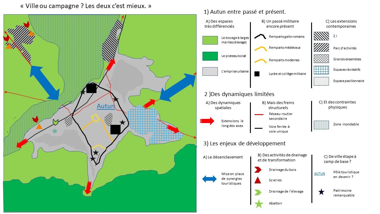 Autun comme beaucoup d’autres petits pôles urbains français ne sont pas forcément des territoires sans avenir. Ils ont suivi à peu près tous les mêmes évolutions territoriales et démographiques. De leurs capacités à mettre en œuvre des projets cohérents dépend leur avenir. Ainsi Autun, malgré de nombreuses difficultés mais aussi de réels atouts, essaie de trouver de nouveaux motifs d’espoir, à travers un ancrage territorial fort (filière bois et élevage) et d’une ouverture vers l’extérieur (tourisme). Ainsi les remparts du passé pourront tomber, voire être valorisés…