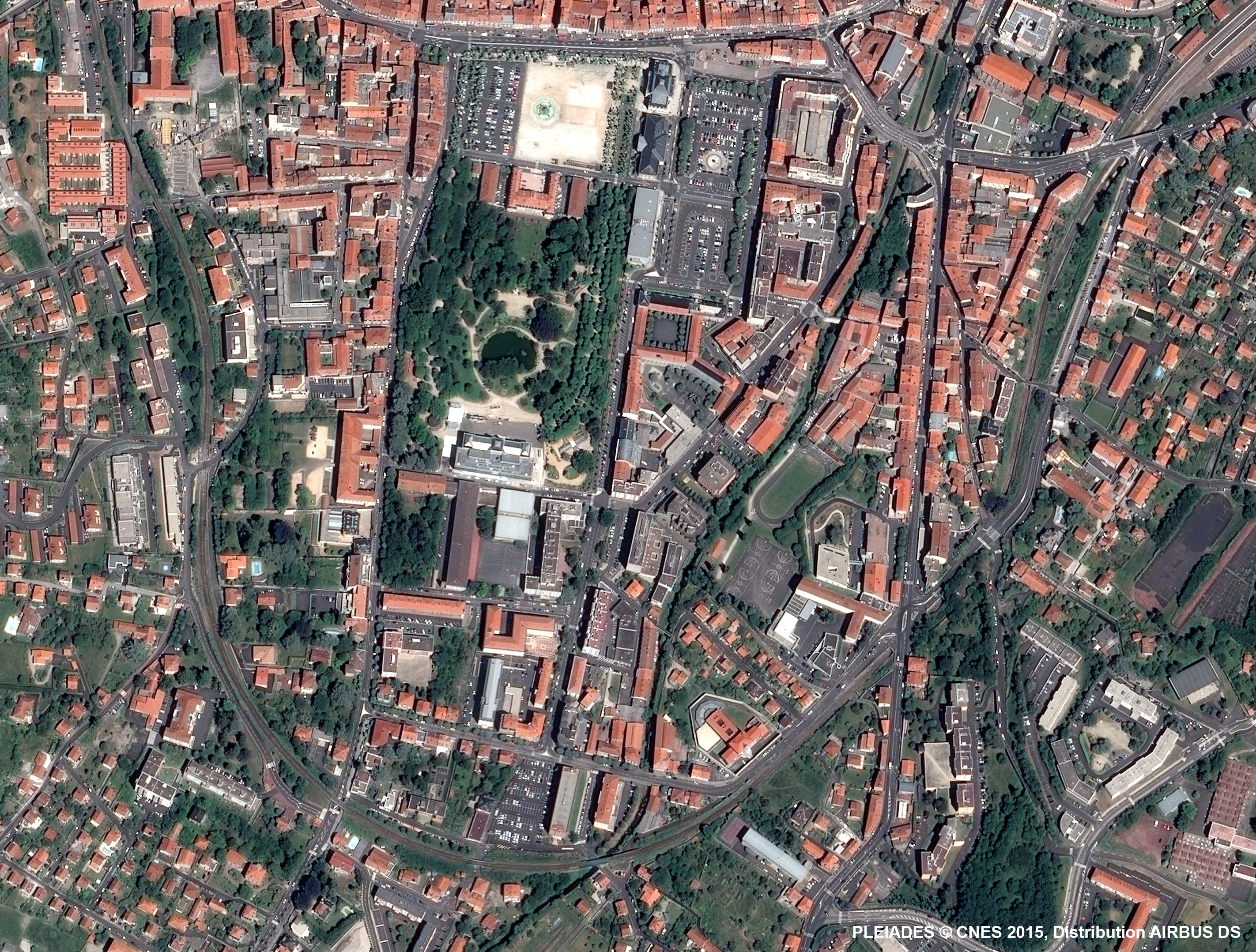 Par son organisation et ses fonctions, cette partie de la ville présente un contraste saisissant par rapport au centre ancien. Il s’organise autour d’un vaste polygone, occupant l’espace plat au fond du bassin et offrant de grands dégagements (places, jardin public) bordés de constructions majoritairement du XIXe siècle, et postérieures. Depuis la gare au nord-est de l’image, la voie ferrée dessine une boucle qui prend la direction de Clermont-Ferrand.