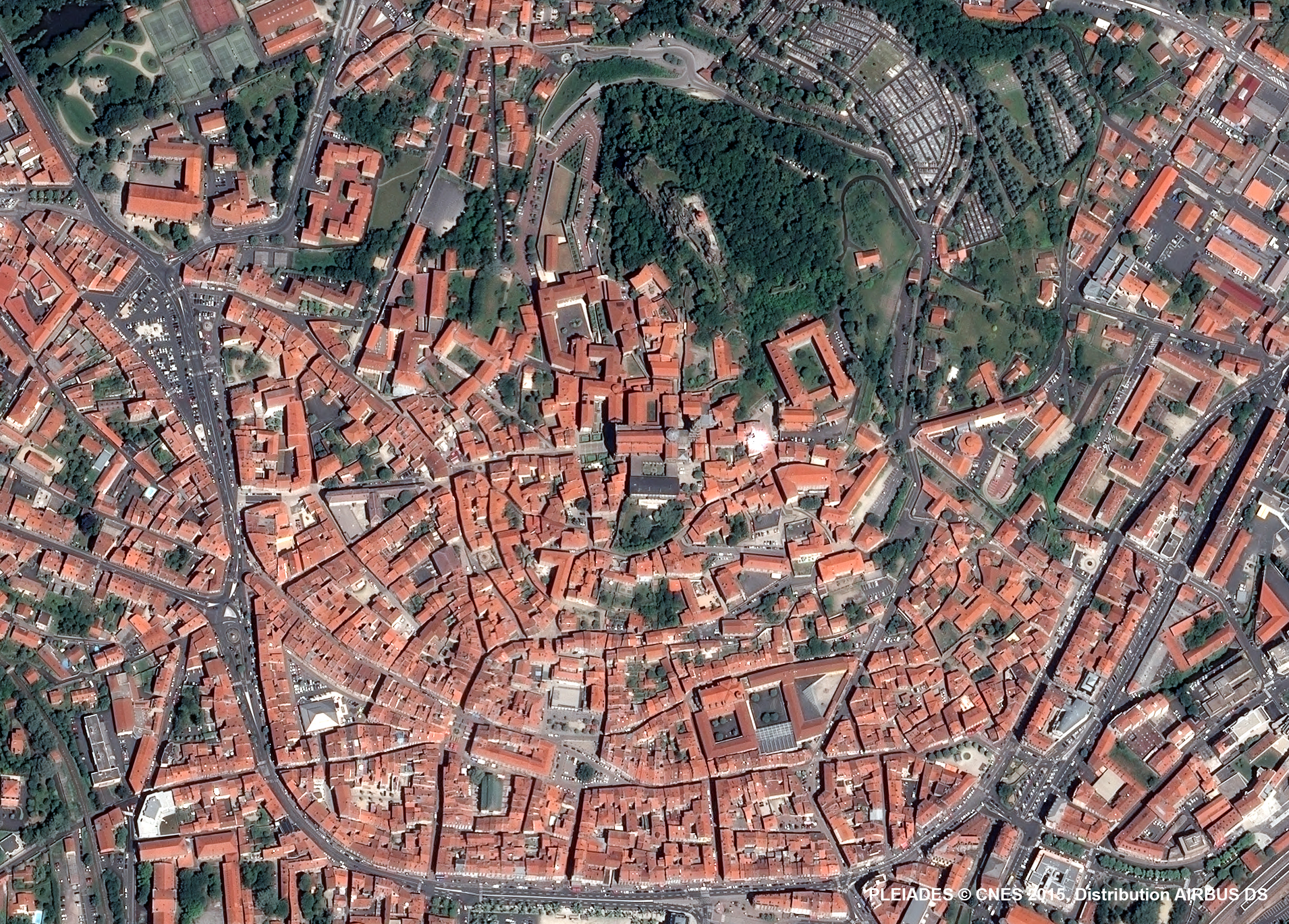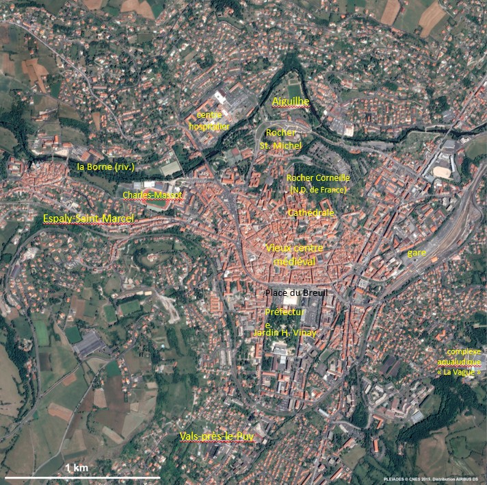 L’unité urbaine - formée par l’extension du bâti - compte ainsi neuf communes et regroupe près de 17 % de la population départementale. Sur l’image sont principalement visibles celle d’Aiguilhe, au nord (rive gauche de la Borne), qui comprend aussi la pointe sur la rive sud ; celle d’Espaly-Saint-Marcel, sur un assez large bord ouest de l’image, à partir des terrains de sport ; et le début de celle de Vals-près-le-Puy, au sud-est de l’image, au-delà de la voie ferrée.