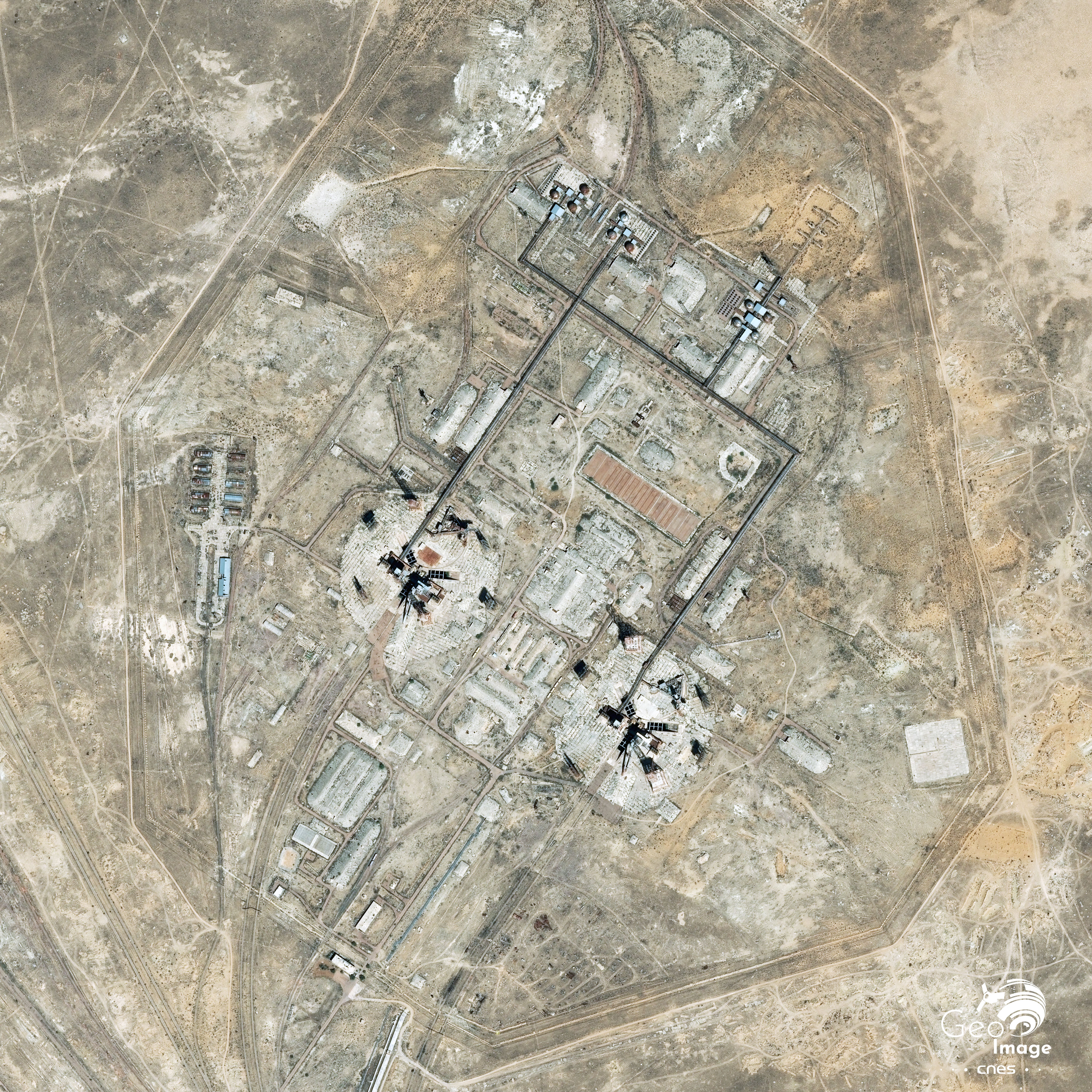 L’image présentée porte sur une toute petite portion du très vaste complexe de Baïkonour. Nous sommes ici dans la partie nord-est de celui-ci, à 45 km de la ville de Baïkonour et à 22 km du centre géographique du complexe.