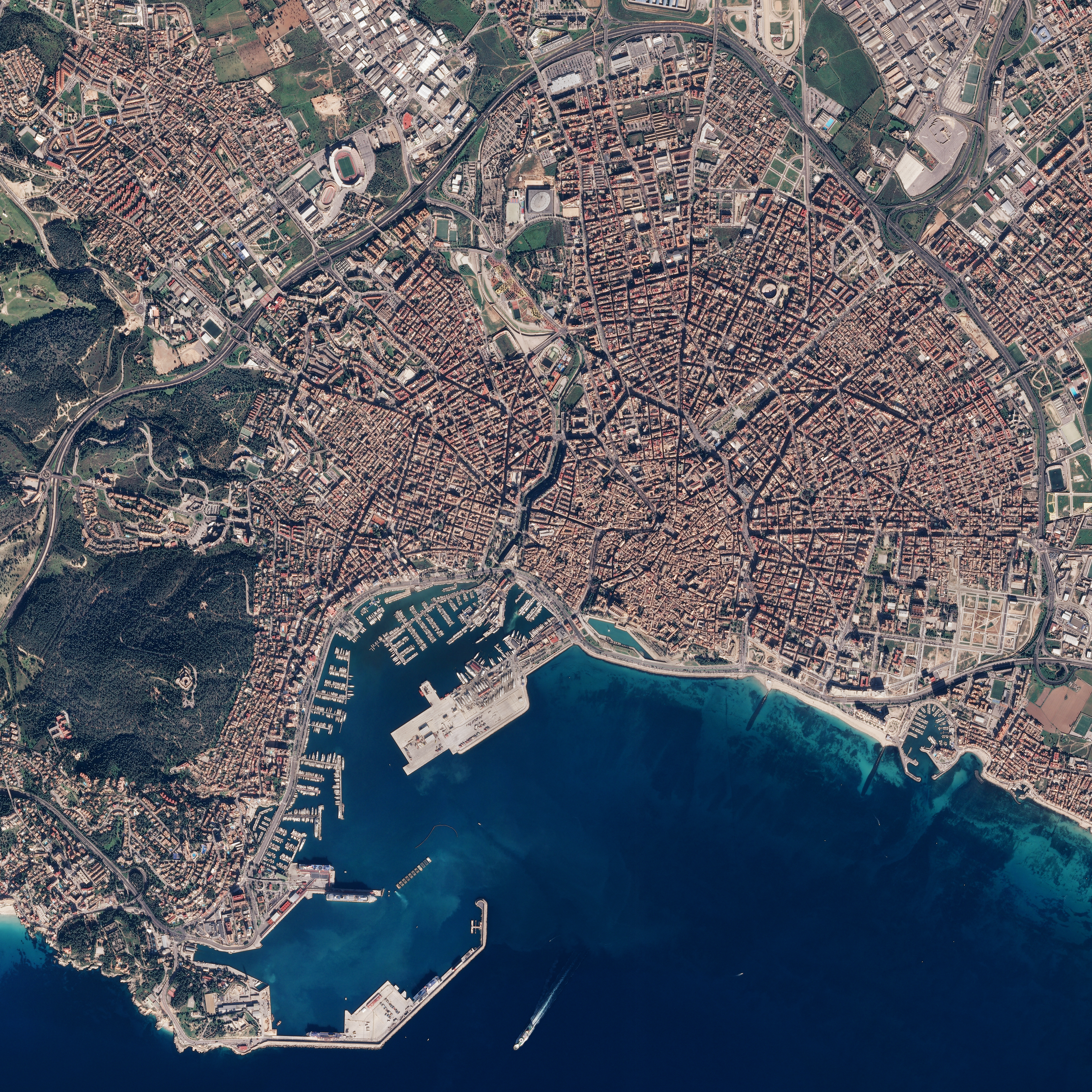 Ce zoom donne à voir la principale agglomération majorquine, Palma. La ville est organisée selon un plan radioconcentrique. Le cœur urbain date de l’époque médiévale et a conservé de cette époque différents monuments qui constituent des lieux de visite pour les touristes et croisiéristes, tels que la cathédrale ou le Palais royal de l'Almudaina, ancien alcazar réaménagé.