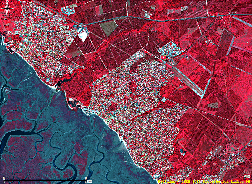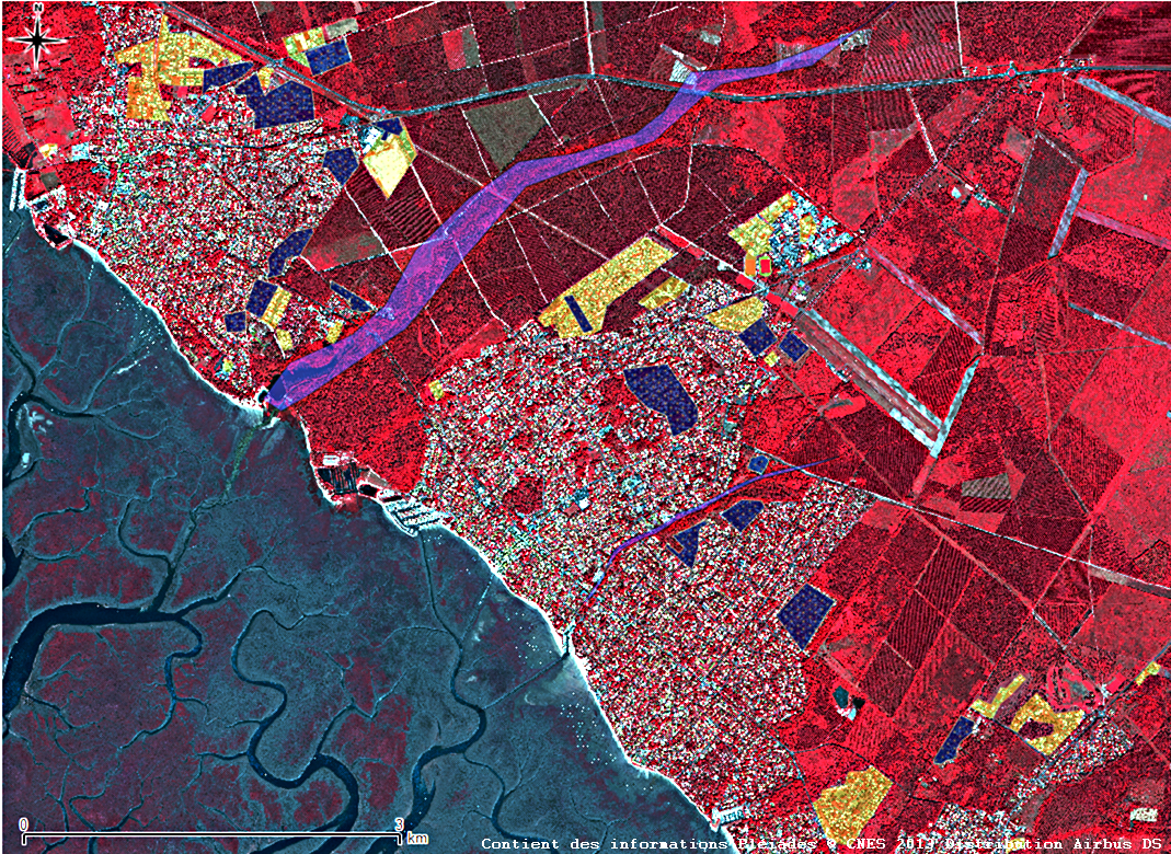 En superposant sous SIG les données des types d’occupations des sols issues d’une interprétation d’images satellites de 1990 (données Corine Land Cover) et les images satellites SPOT 5 de 2003 puis Pleiades 1A de 2013, on peut tracer de nouvelles couches cartographiques représentant les zones de poussées urbaines sur les milieux environnants : on représente :