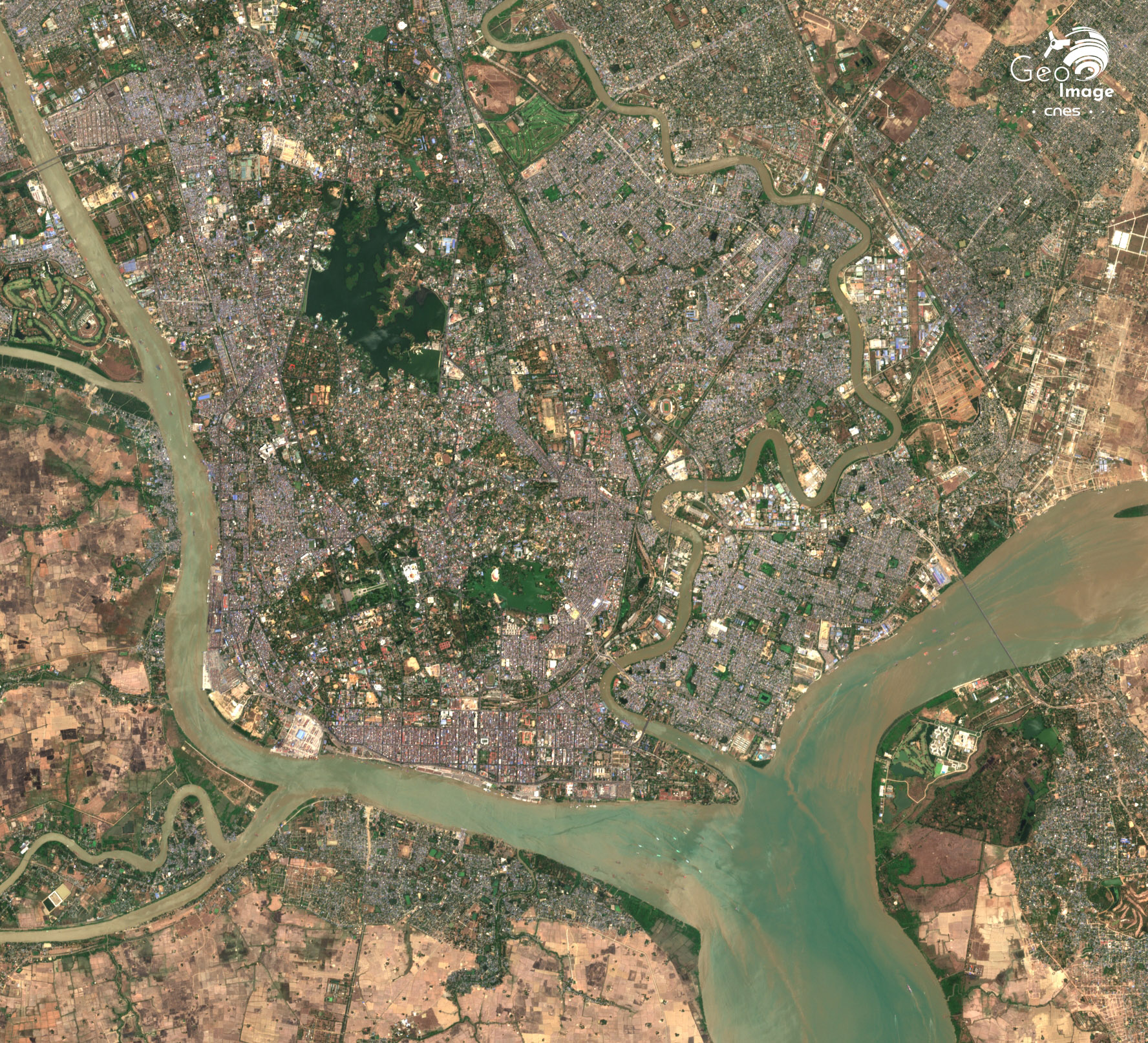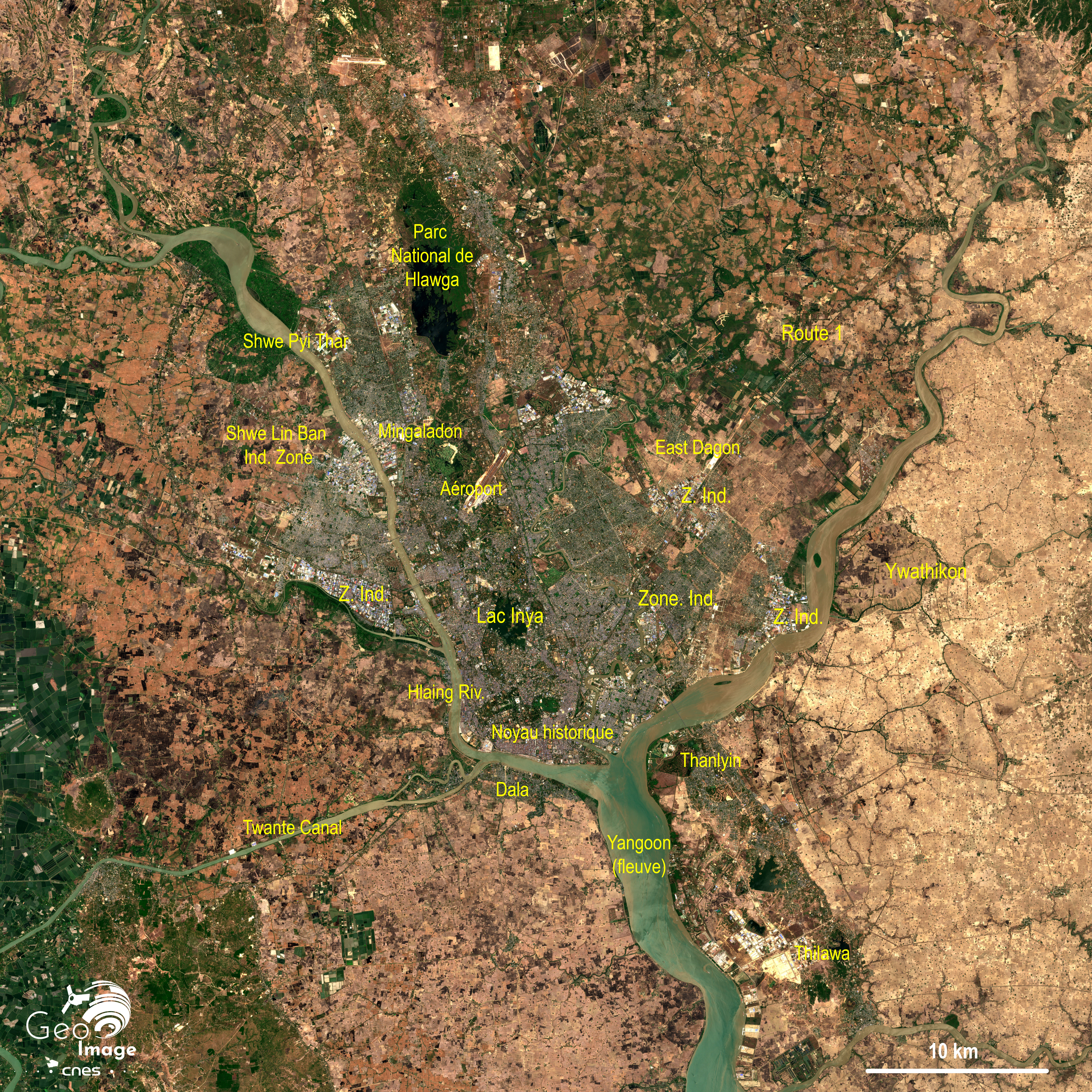 Comme le montre l’image, Rangoun, officiellement renommée Yangon en 1989, est construite sur un site de hautes terrasses insubmersibles à la confluence de deux axes fluviaux avec à l’ouest la rivière Hlaing et à l’est la rivière Bago. Elles donnent naissance à la Rivière Yangoon qui rejoint par un vaste estuaire le golfe du Martaban. A l’échelle régionale, la ville se situe dans la partie orientale du delta de l’Irrawaddy, le grand fleuve dont la vallée sert de colonne vertébrale à toute la Birmanie.