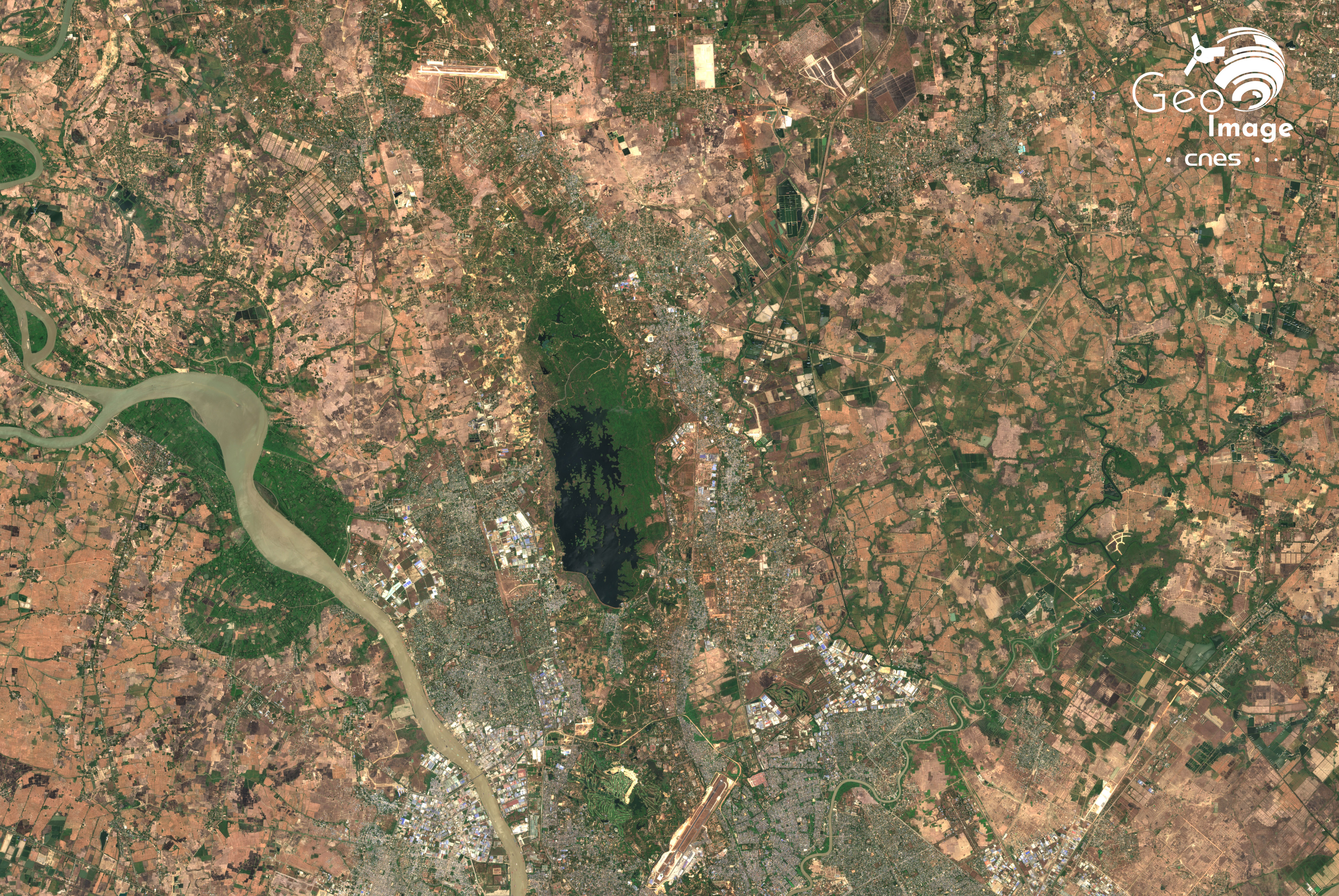 Image de la plus grande ville du Myanmar (ex-Birmanie), Yangon (anciennement nommé Rangoun). Cette image a été prise par le satellite Sentinel-2B le 28 avril 2019. Il s’agit d’une image en couleurs naturelles de résolution native à 10m.