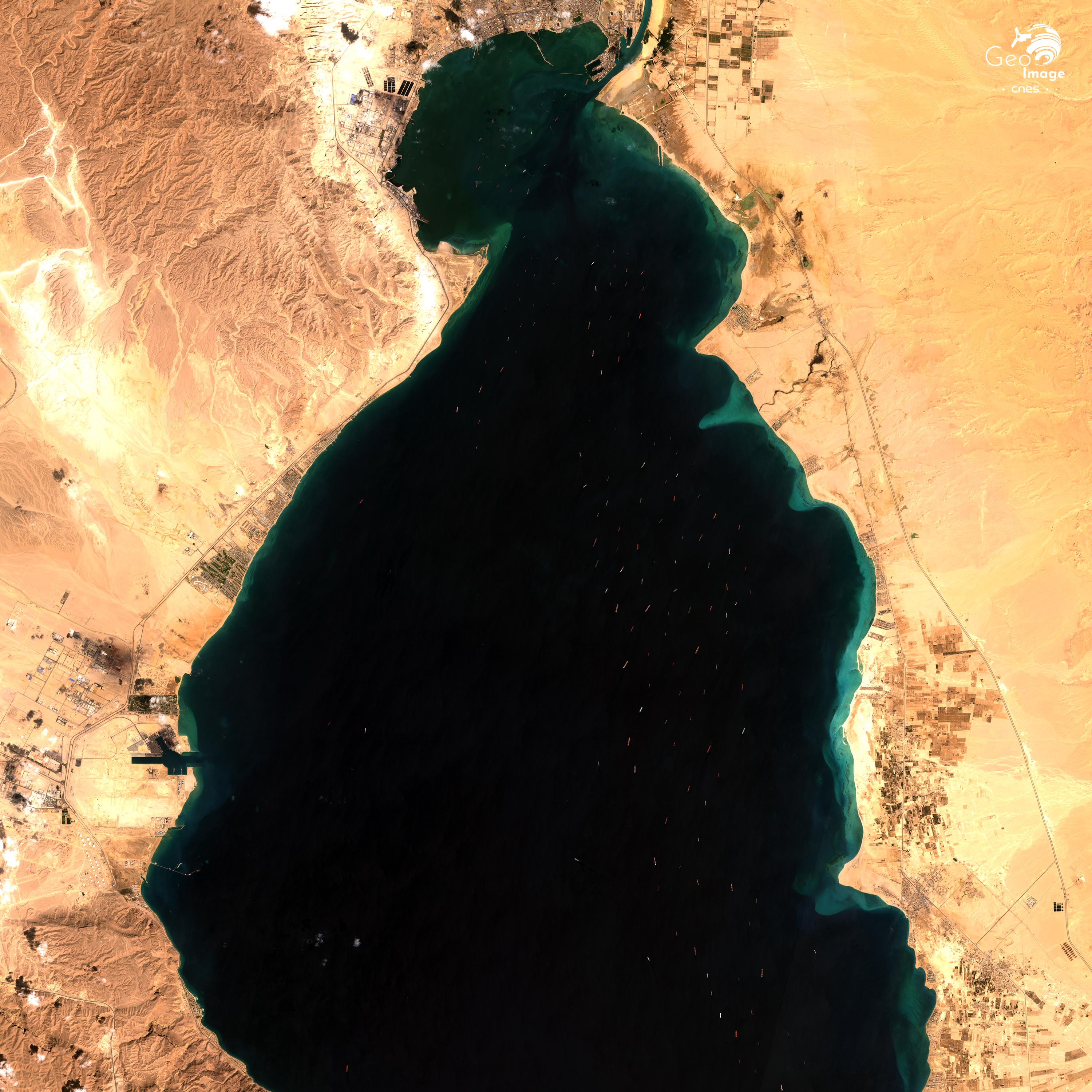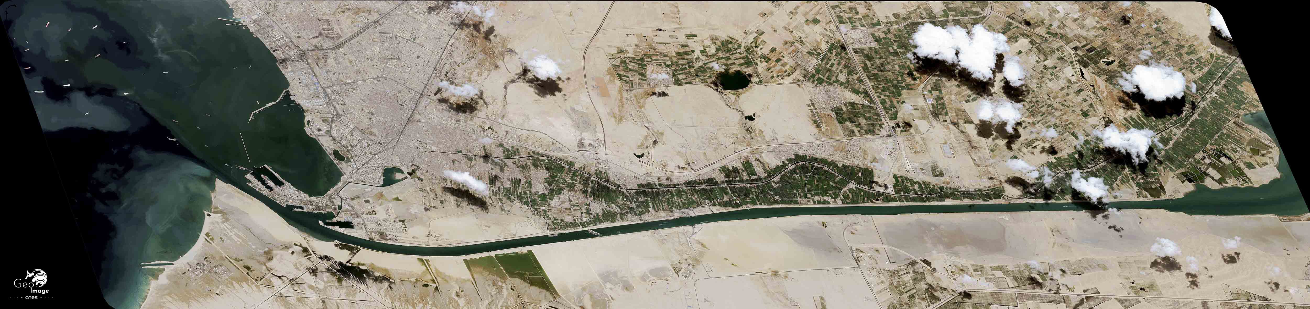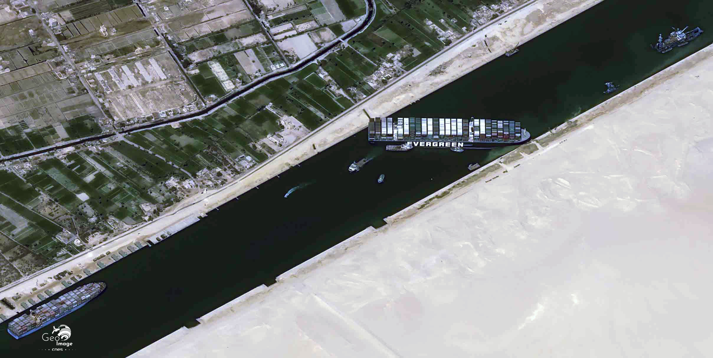 Dans la nuit du 23 au 24 mars mars 2021 le porte conteneur Ever Given, appartenant à la société de transport maritime Evergreen est déporté alors qu’il vient de franchir l’entrée Sud du canal de Suez. Il échoue sur le sable et se coince à l’intérieur de la berge, comme nous pouvons l’observer sur cette image satellite Pléiades en haute résolution, bloquant ainsi le trafic dans le canal pendant plusieurs près de six jours, malgré de multiples tentatives de remorquage.