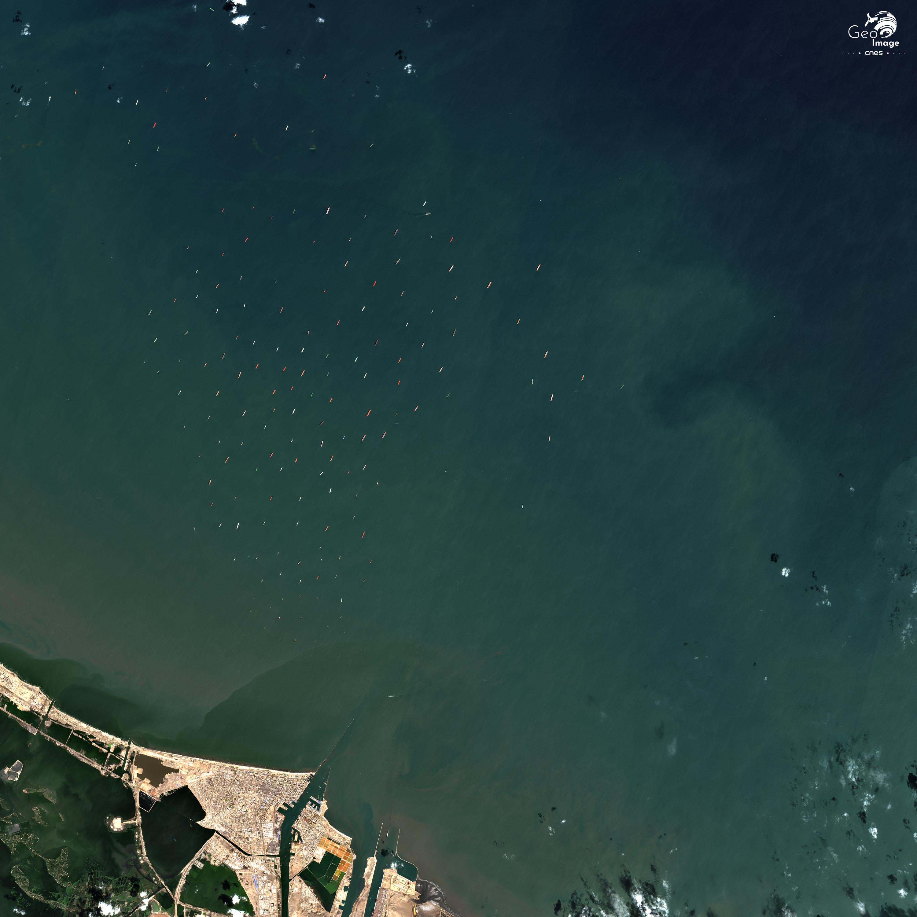 L’image satellite révèle à l’échelle régionale les conséquences désastreuses de la fermeture du canal pour le transport maritime mondial. Très rapidement le nombre de navires en attente aux entrées du canal a augmenté : au large de Port Saïd 29 navires sont bloqués le 24 mars, 79 le 26 mars.