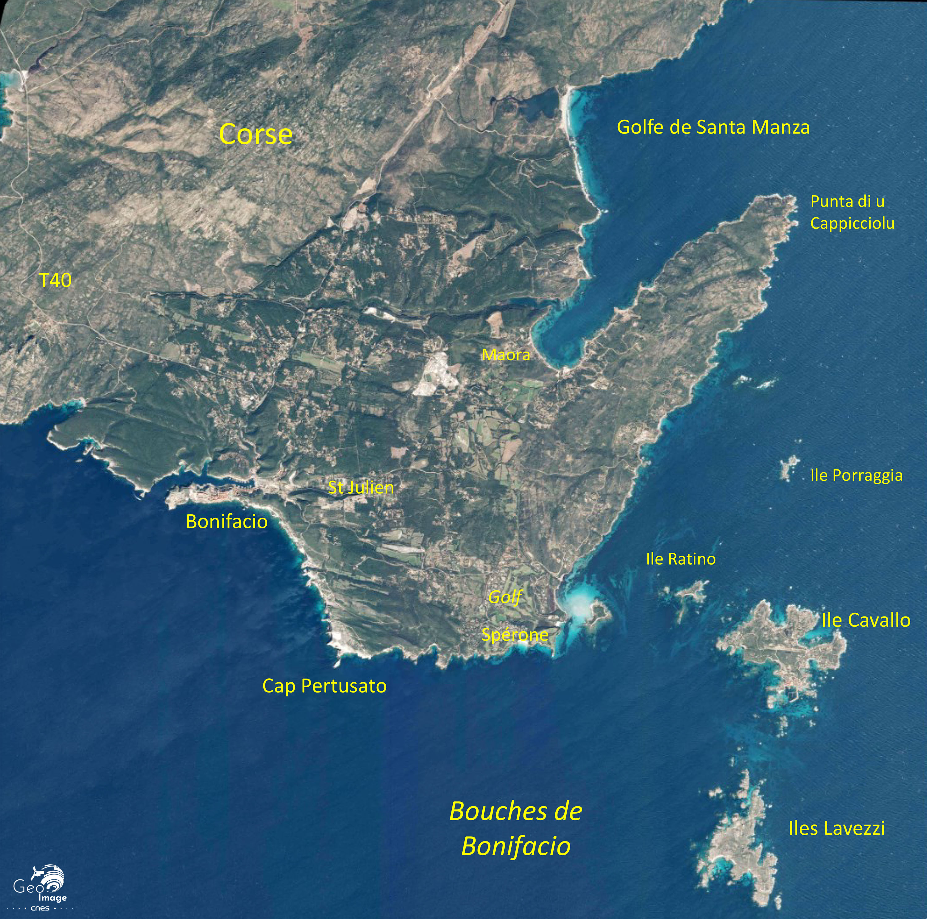 L'image est centrée sur la ville de Bonifacio, son goulet et ses falaises. Dans l'extrême sud de la Corse, cet espace est marqué par de fortes contraintes. Au nord, la route territoriale T10 part du fond de vallon puis entaille le plateau calcaire en direction de Porto Vecchio. A l'est, se trouve la vallée de Saint-Julien avec la départementale D58. Ces deux voies de communication correspondent aux axes d'extension de l'urbanisation au XXème siècle.
