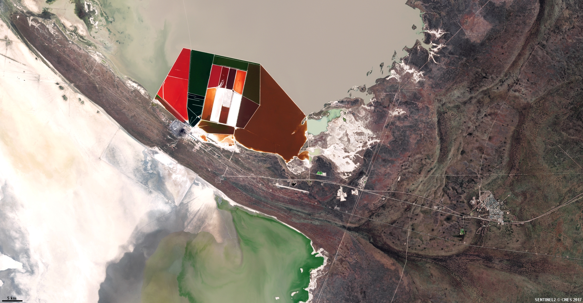 Au centre de l’image, un phénomène retient l’attention : la présence de vastes formes géométriques de couleurs rouges, orange ou brunes. On distingue bien au nord une série de bassins successifs aux formes géométriques et bordés de puissantes digues. Ce sont des tables d’évaporation; elles couvent une surface de 22 km2.