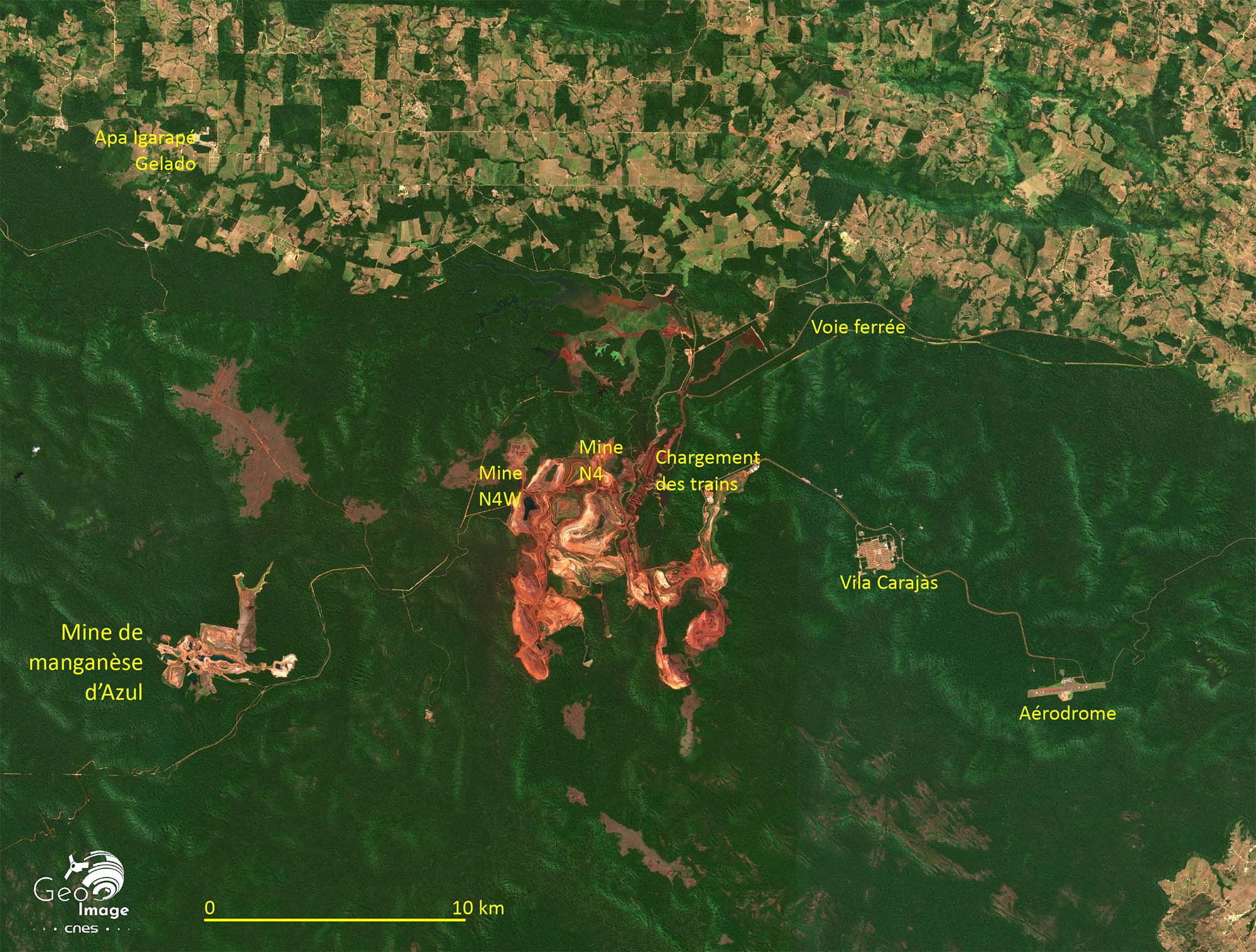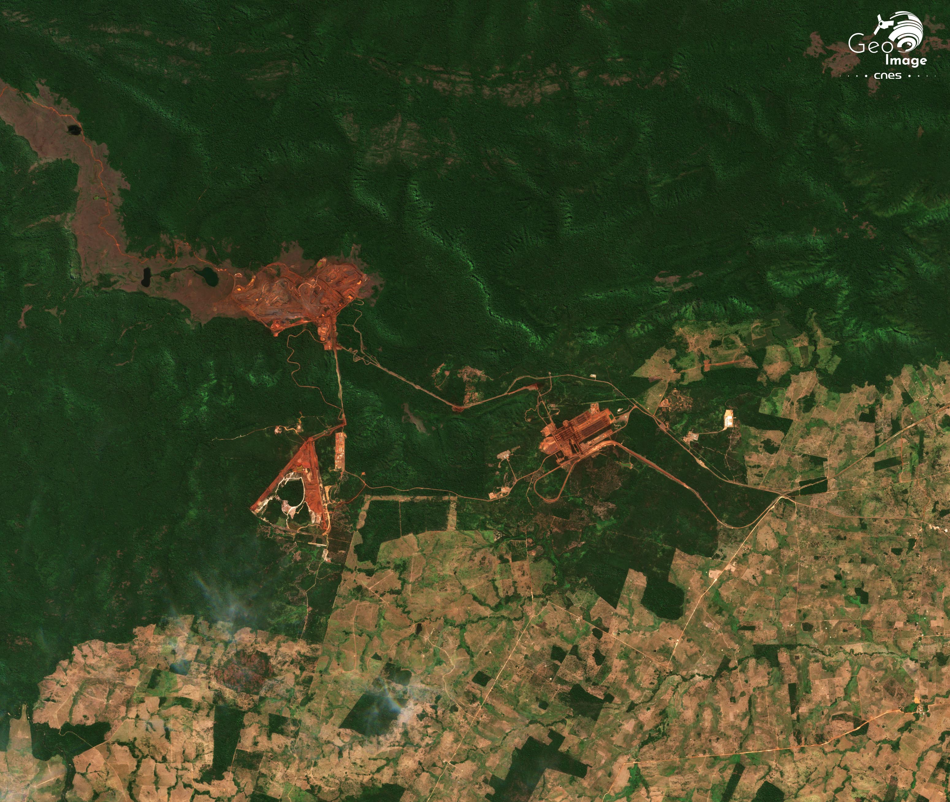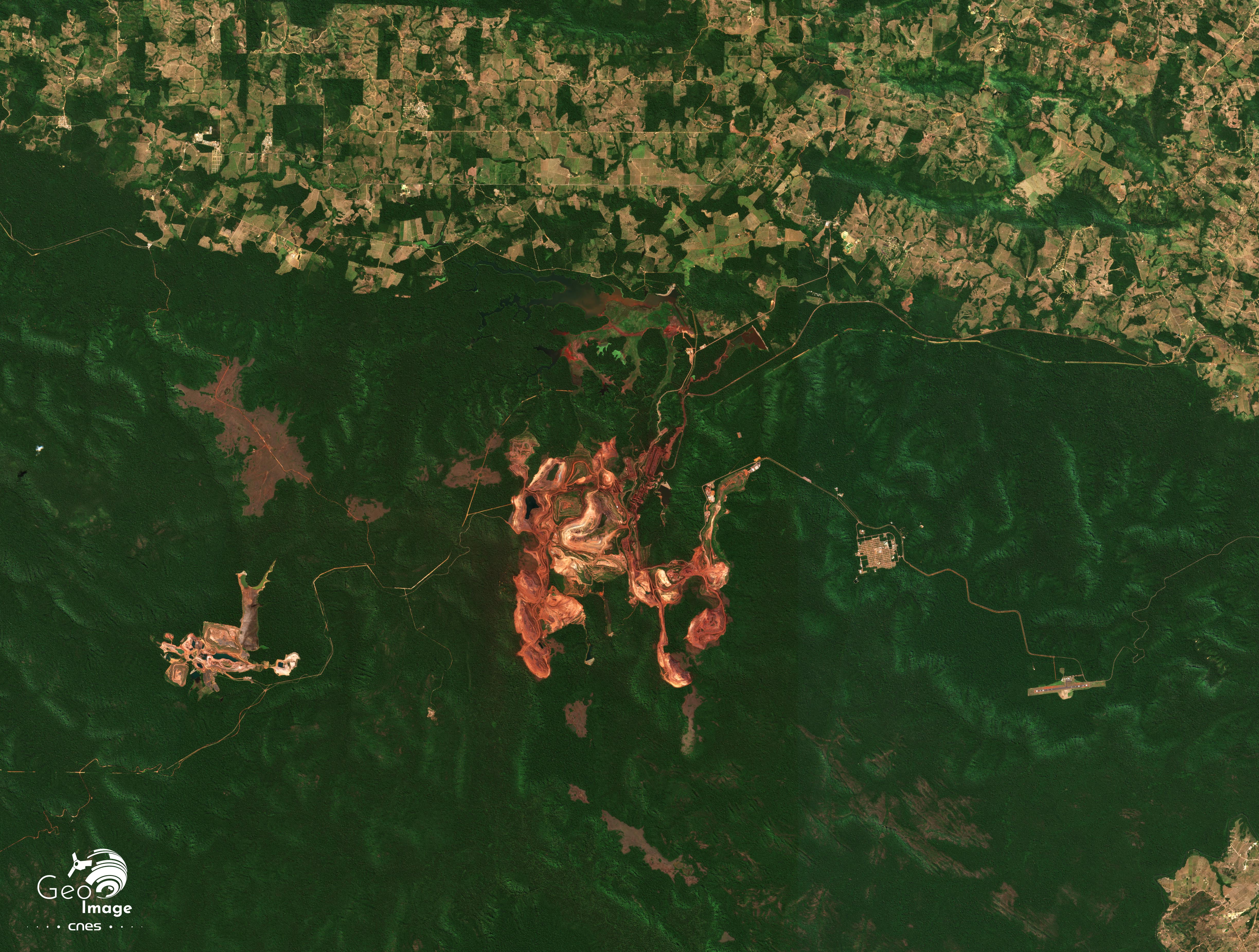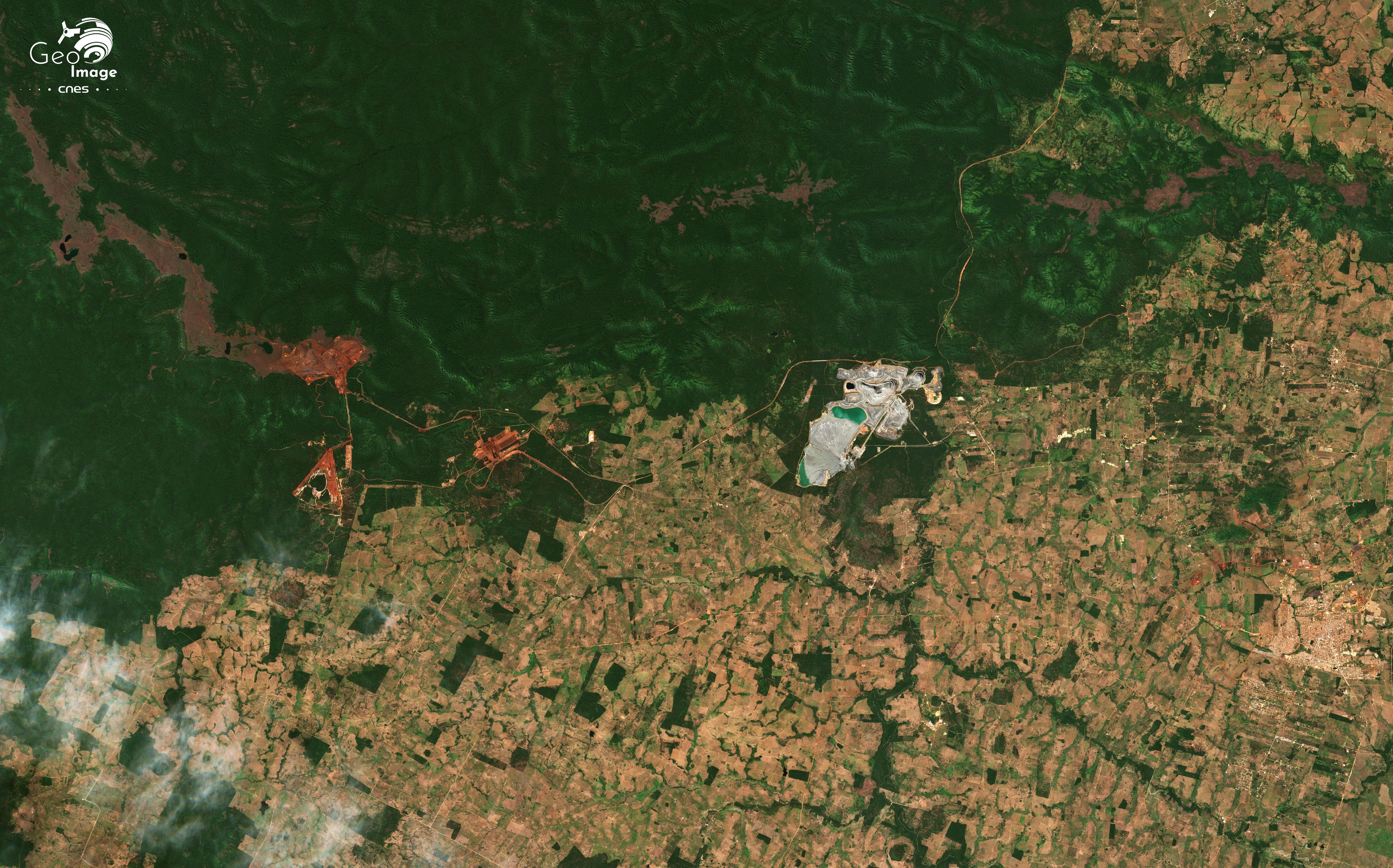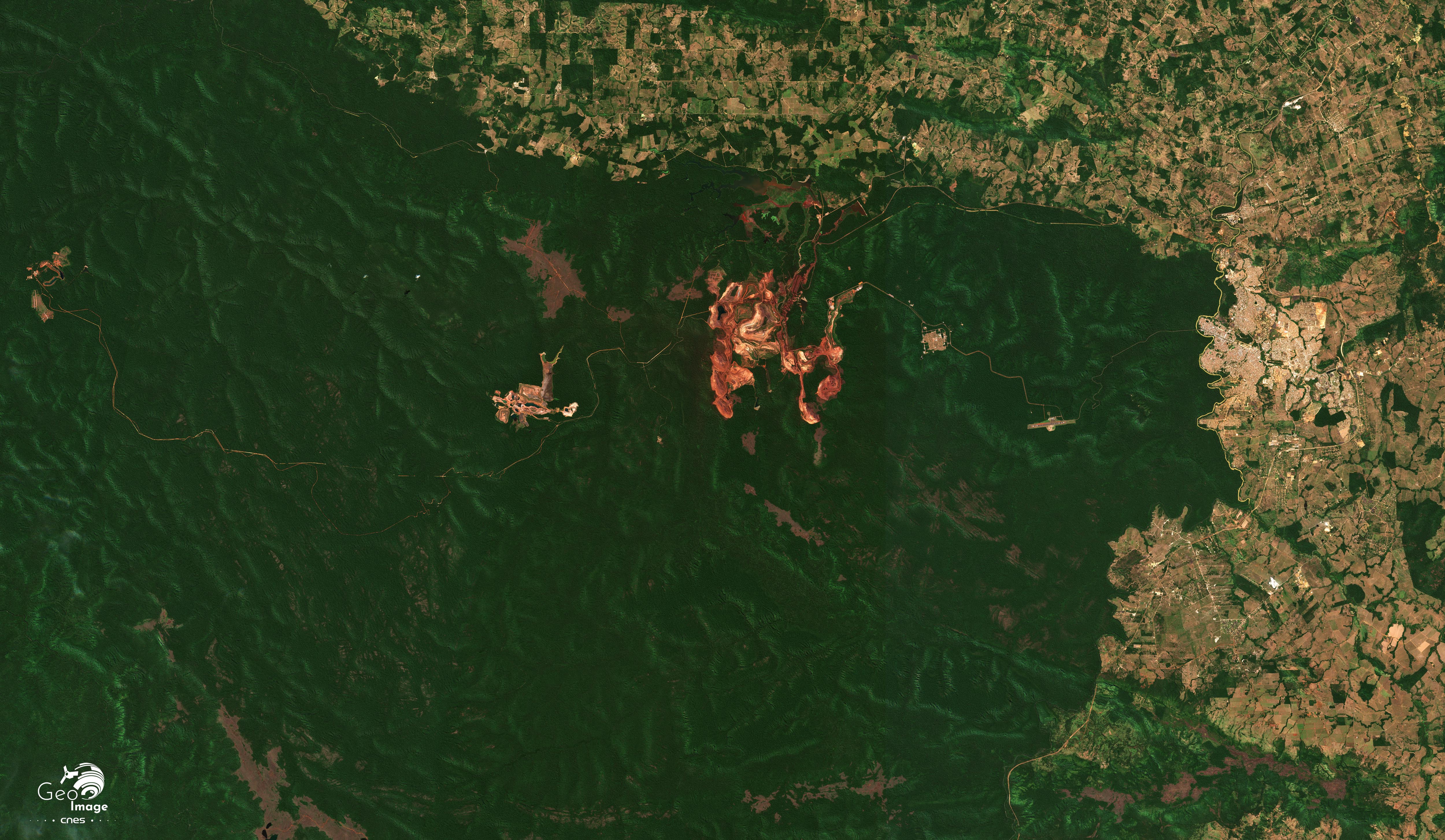 La « Province Minière de Carajás » (Província Mineral Carajás) est située dans l'État du Pará, en Amazonie brésilienne. C'est l'une des plus importantes régions minières au monde et la principale du Brésil. Non seulement c’est la deuxième du pays pour le minerai de fer, juste derrière le « Quadrilatère de fer » du Minas Gerais, mais elle recèle en outre une grande diversité d’autres minerais : cuivre, nickel, manganèse... La transition énergétique aboutit à une explosion de la demande mondiale qui se traduit régionalement par l’accélération des activités minières et l’essor d’un front pionnier minier vers l’ouest. L’image principale montre bien ces mines, d’autant mieux qu’elles se détachent nettement sur un fond de forêt amazonienne, étant situées dans un vaste ensemble forestier préservé, formé de réserves naturelles ou de terres amérindiennes.