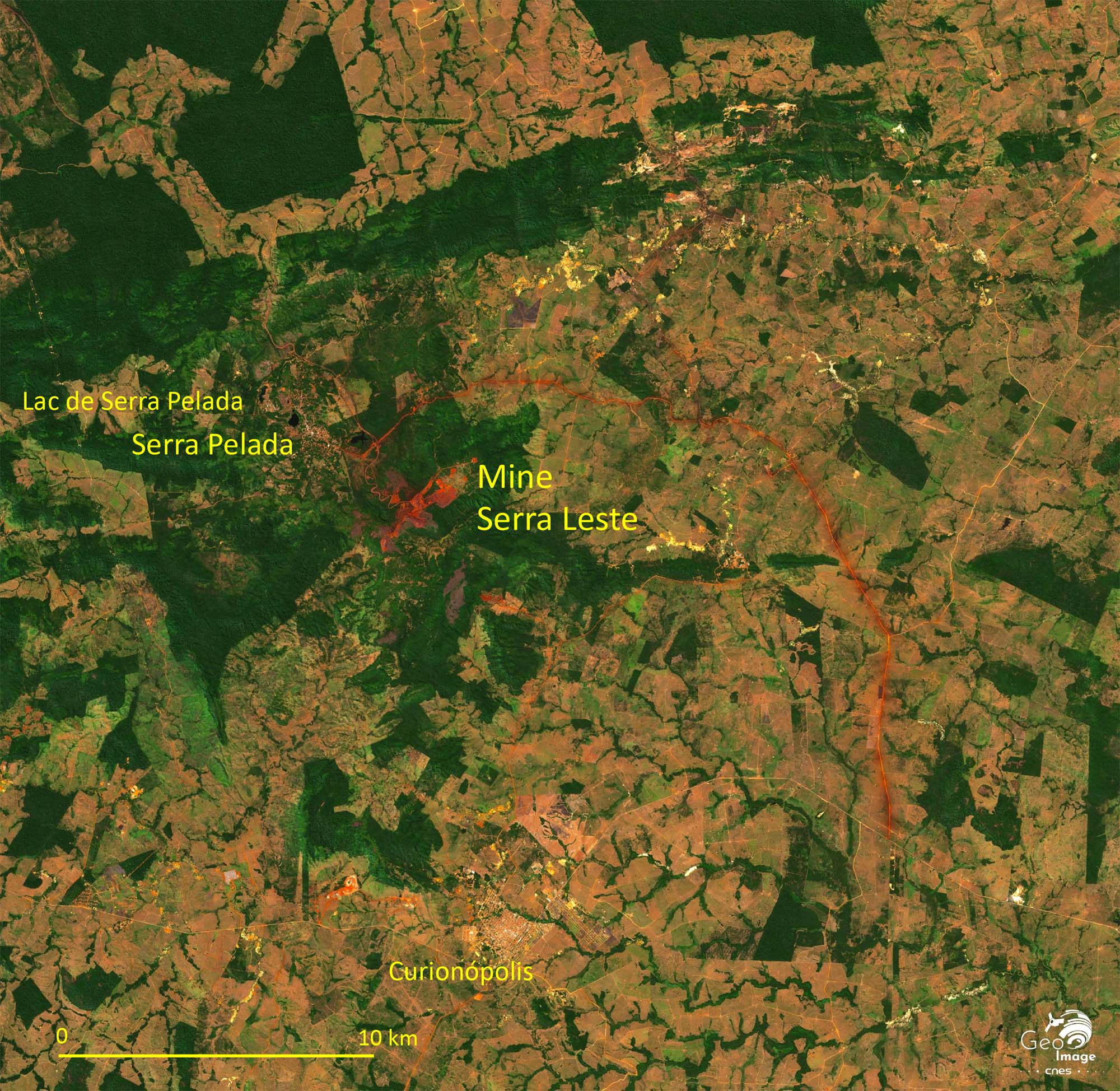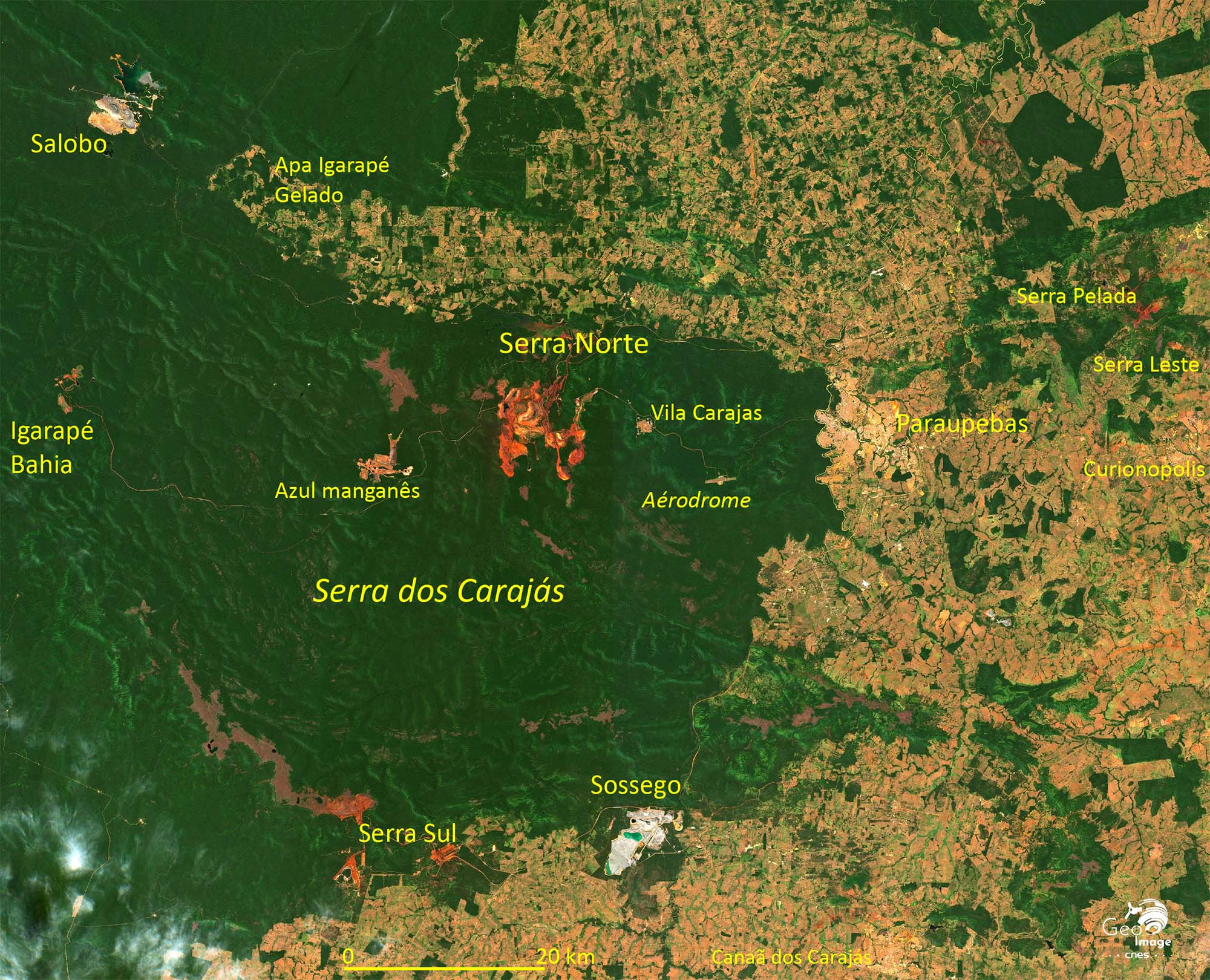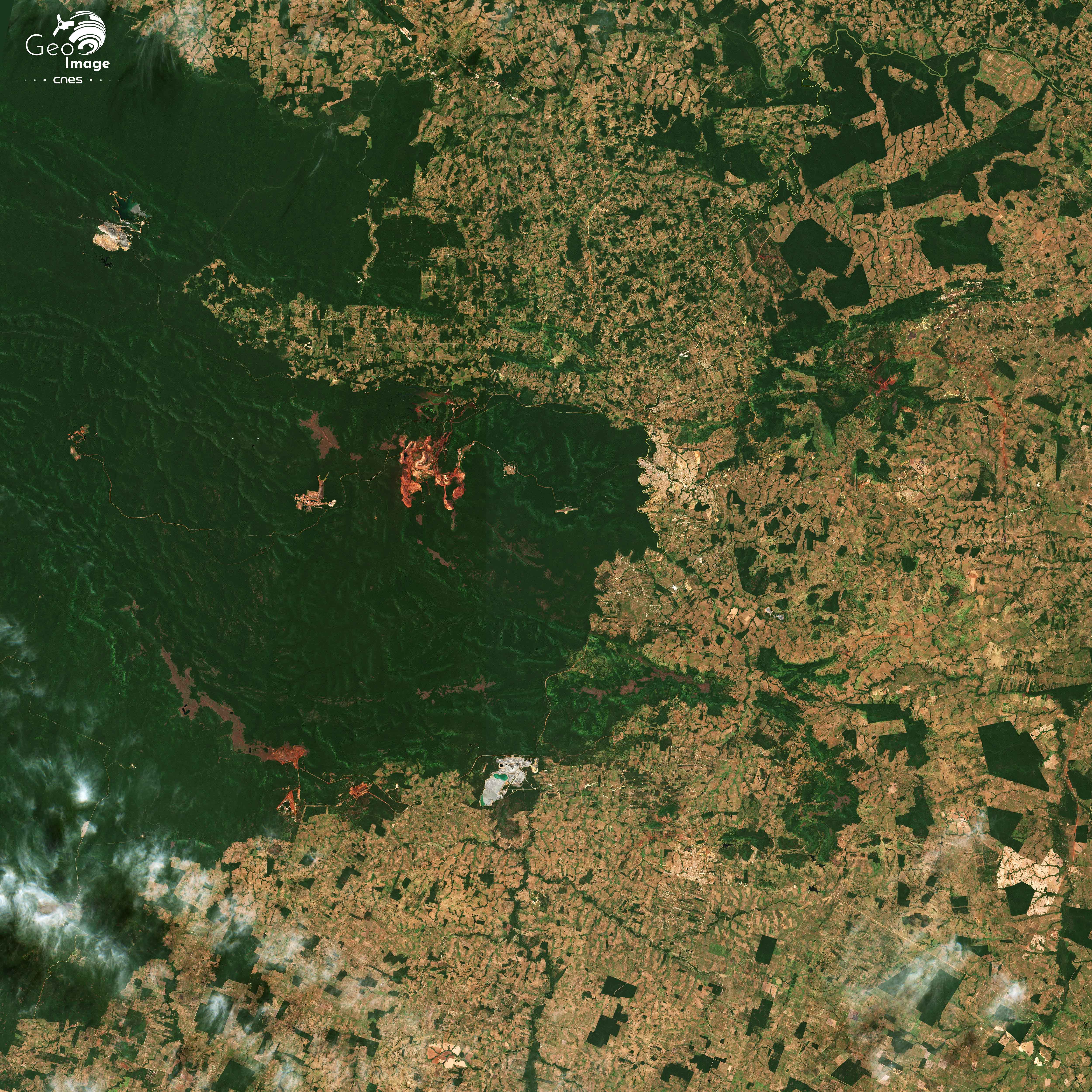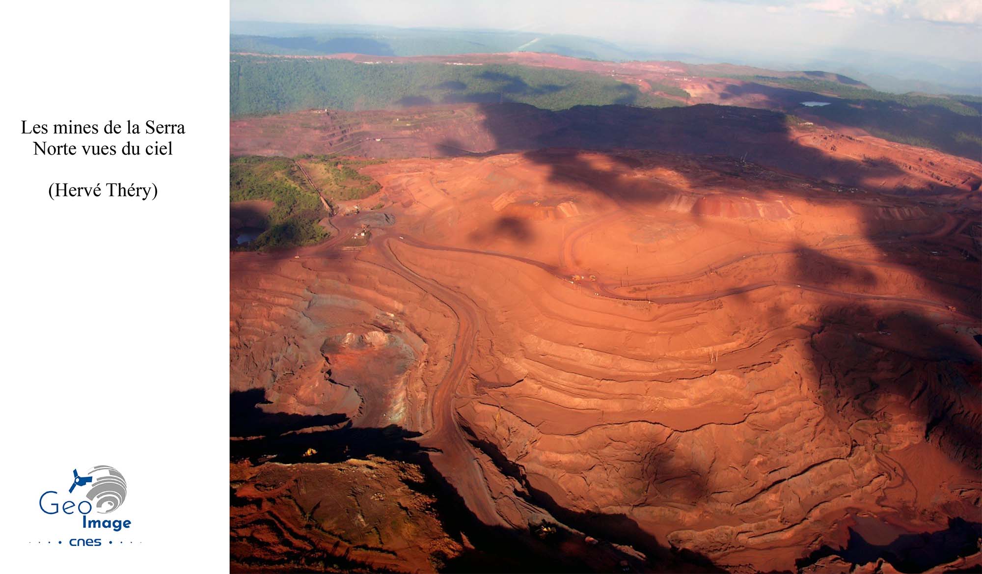 La « Province Minière de Carajás » (Província Mineral Carajás) est située dans l'État du Pará, en Amazonie brésilienne. C'est l'une des plus importantes régions minières au monde et la principale du Brésil. Non seulement c’est la deuxième du pays pour le minerai de fer, juste derrière le « Quadrilatère de fer » du Minas Gerais, mais elle recèle en outre une grande diversité d’autres minerais : cuivre, nickel, manganèse... La transition énergétique aboutit à une explosion de la demande mondiale qui se traduit régionalement par l’accélération des activités minières et l’essor d’un front pionnier minier vers l’ouest. L’image principale montre bien ces mines, d’autant mieux qu’elles se détachent nettement sur un fond de forêt amazonienne, étant situées dans un vaste ensemble forestier préservé, formé de réserves naturelles ou de terres amérindiennes.