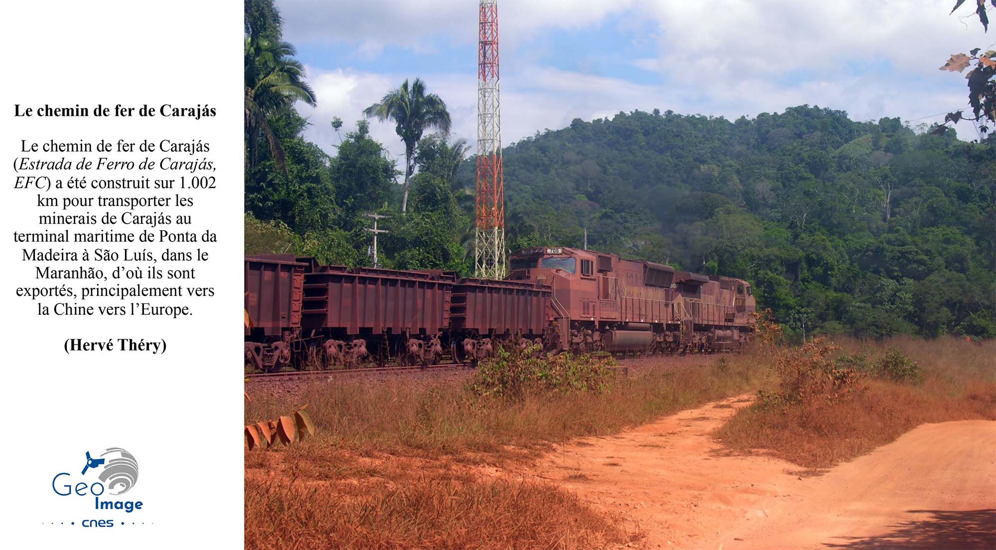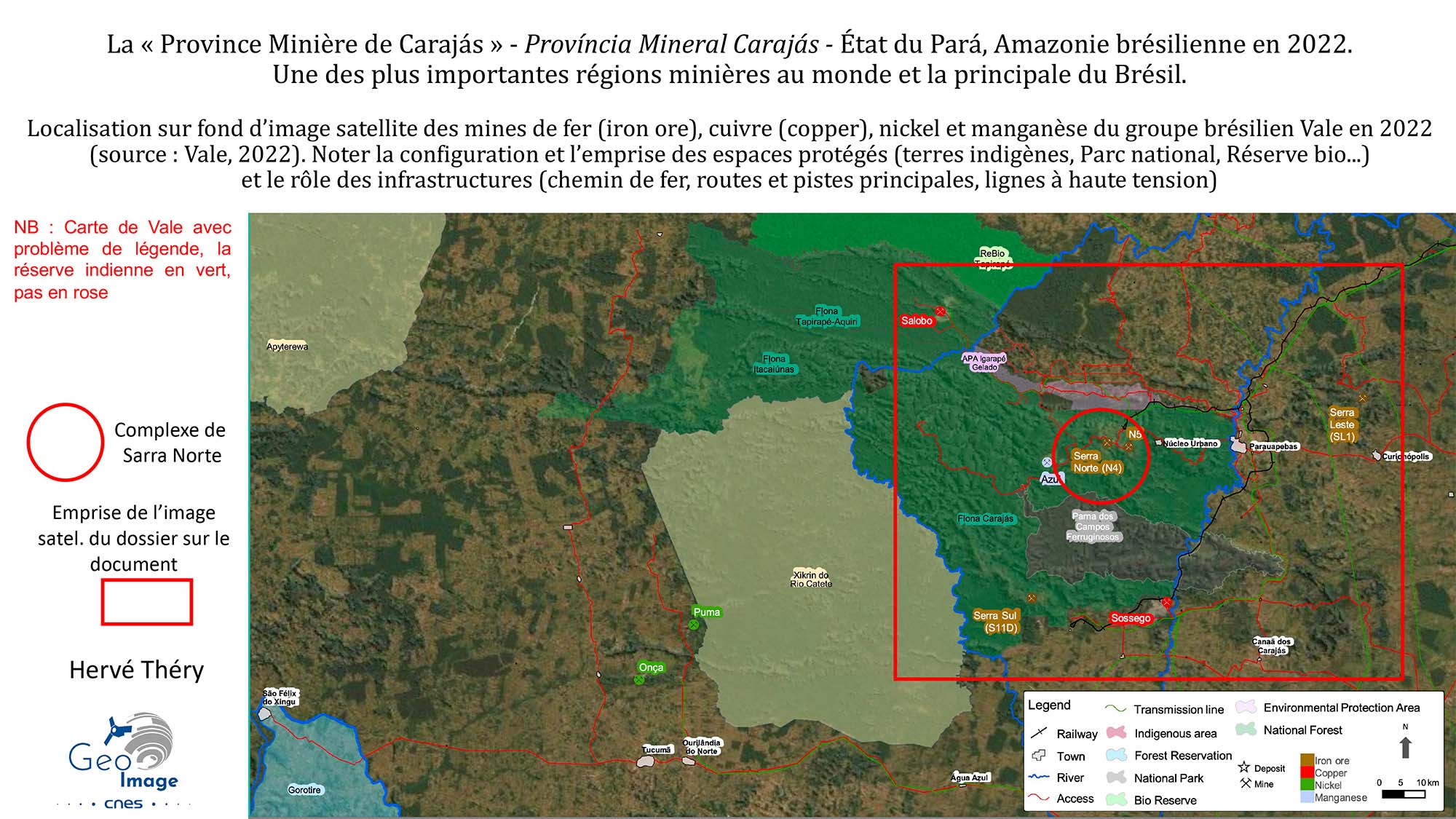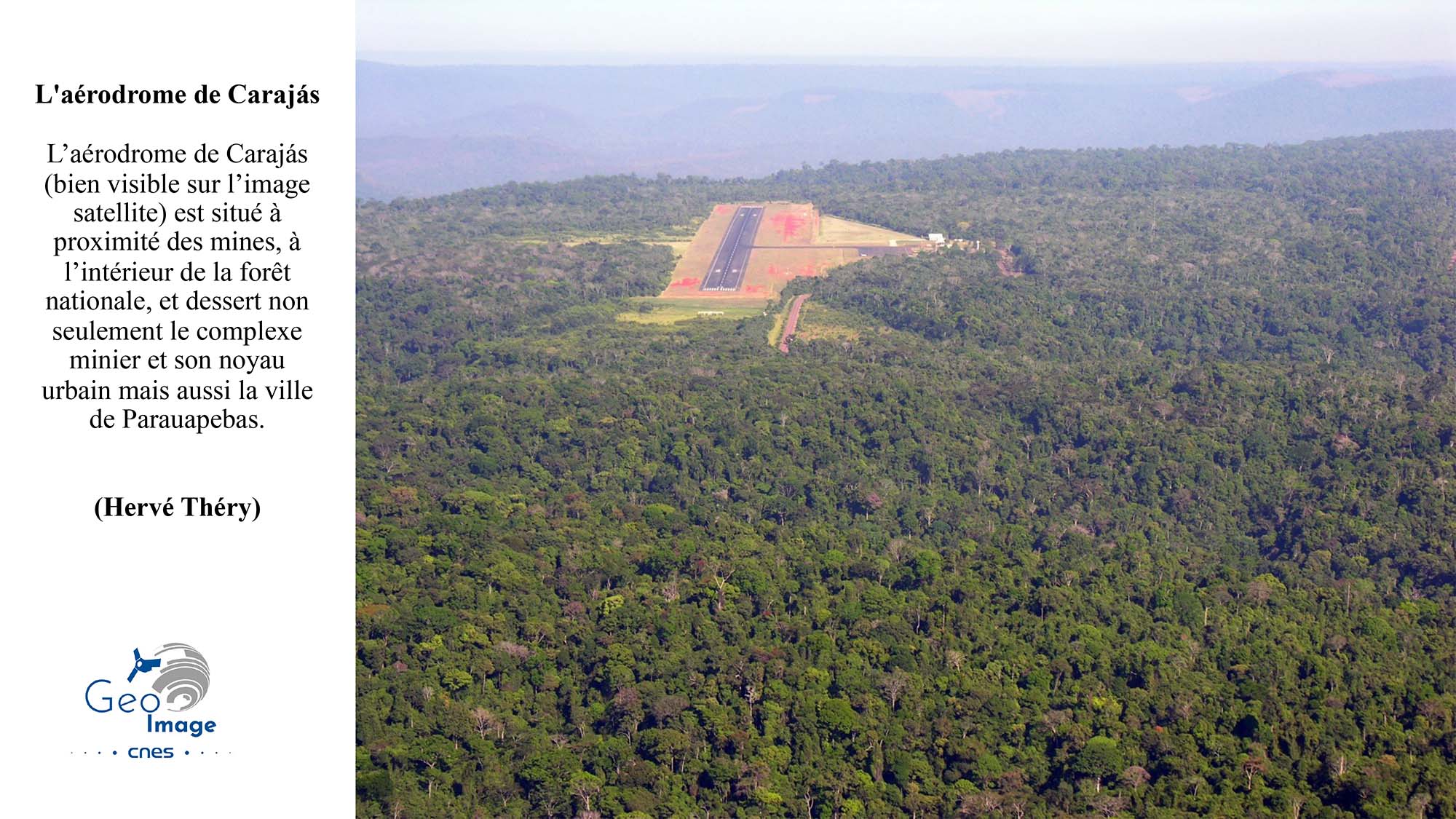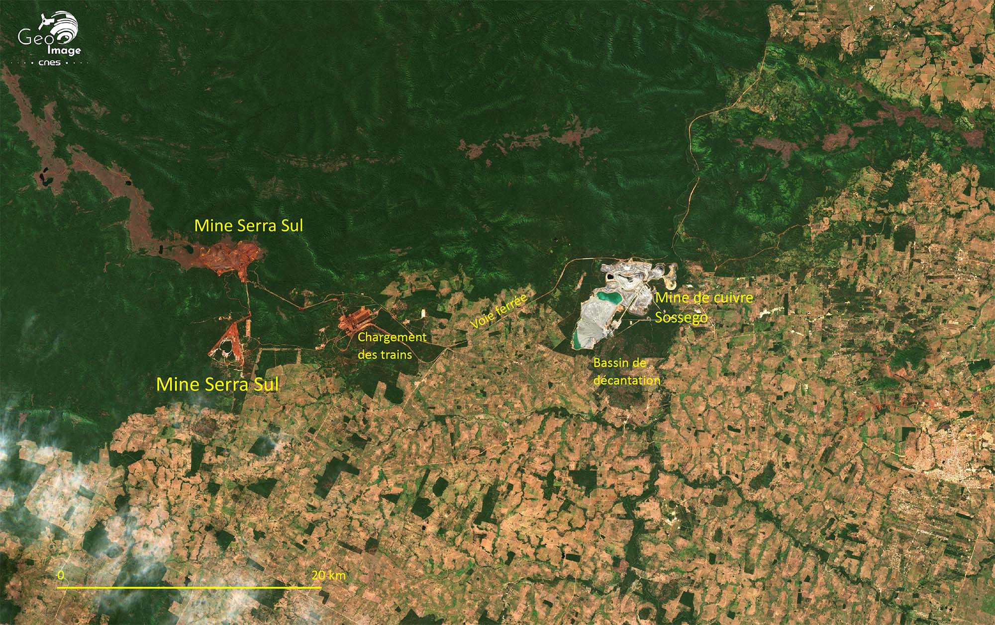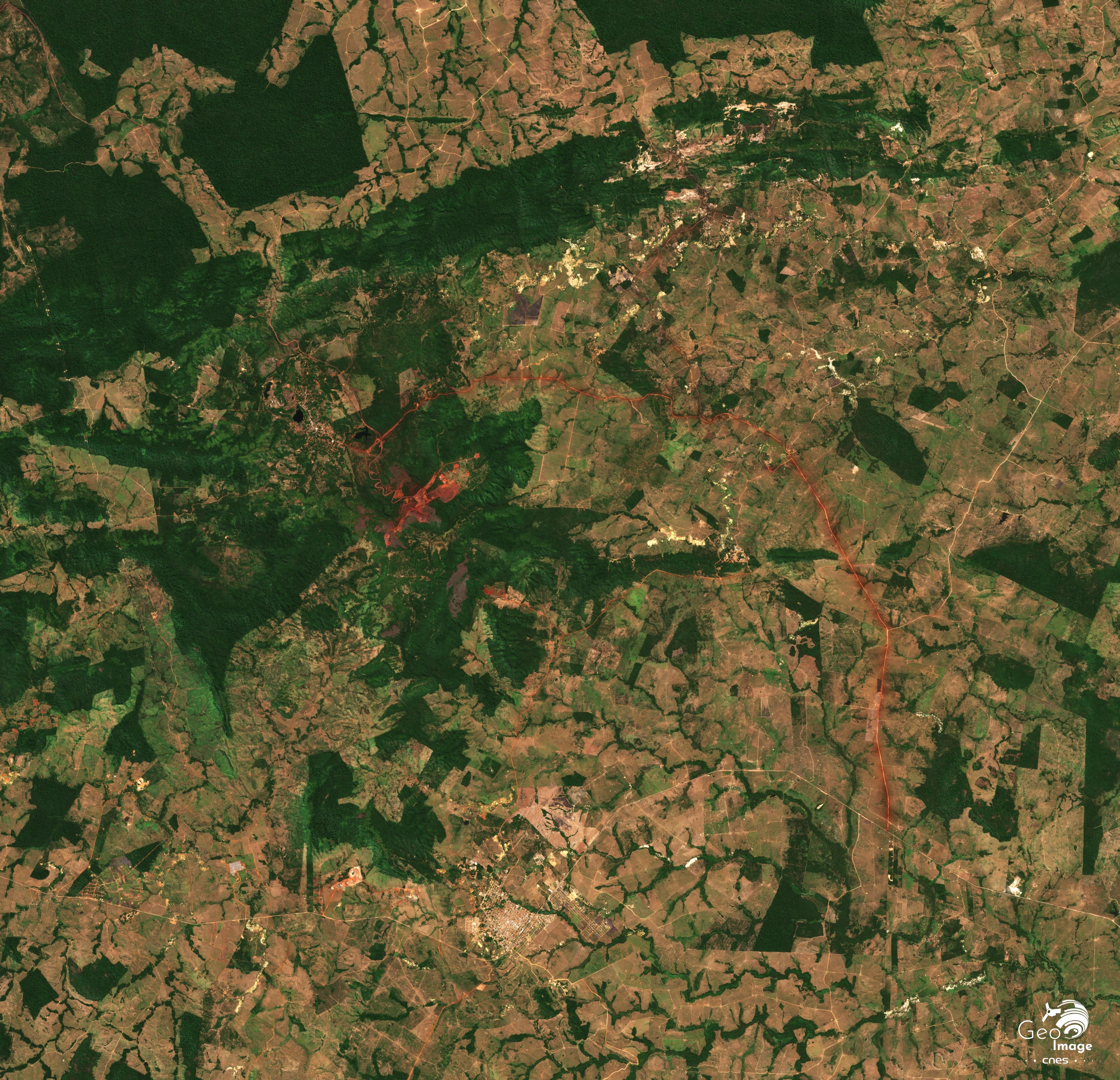La « Province Minière de Carajás » (Província Mineral Carajás) est située dans l'État du Pará, en Amazonie brésilienne. C'est l'une des plus importantes régions minières au monde et la principale du Brésil. Non seulement c’est la deuxième du pays pour le minerai de fer, juste derrière le « Quadrilatère de fer » du Minas Gerais, mais elle recèle en outre une grande diversité d’autres minerais : cuivre, nickel, manganèse... La transition énergétique aboutit à une explosion de la demande mondiale qui se traduit régionalement par l’accélération des activités minières et l’essor d’un front pionnier minier vers l’ouest. L’image principale montre bien ces mines, d’autant mieux qu’elles se détachent nettement sur un fond de forêt amazonienne, étant situées dans un vaste ensemble forestier préservé, formé de réserves naturelles ou de terres amérindiennes.