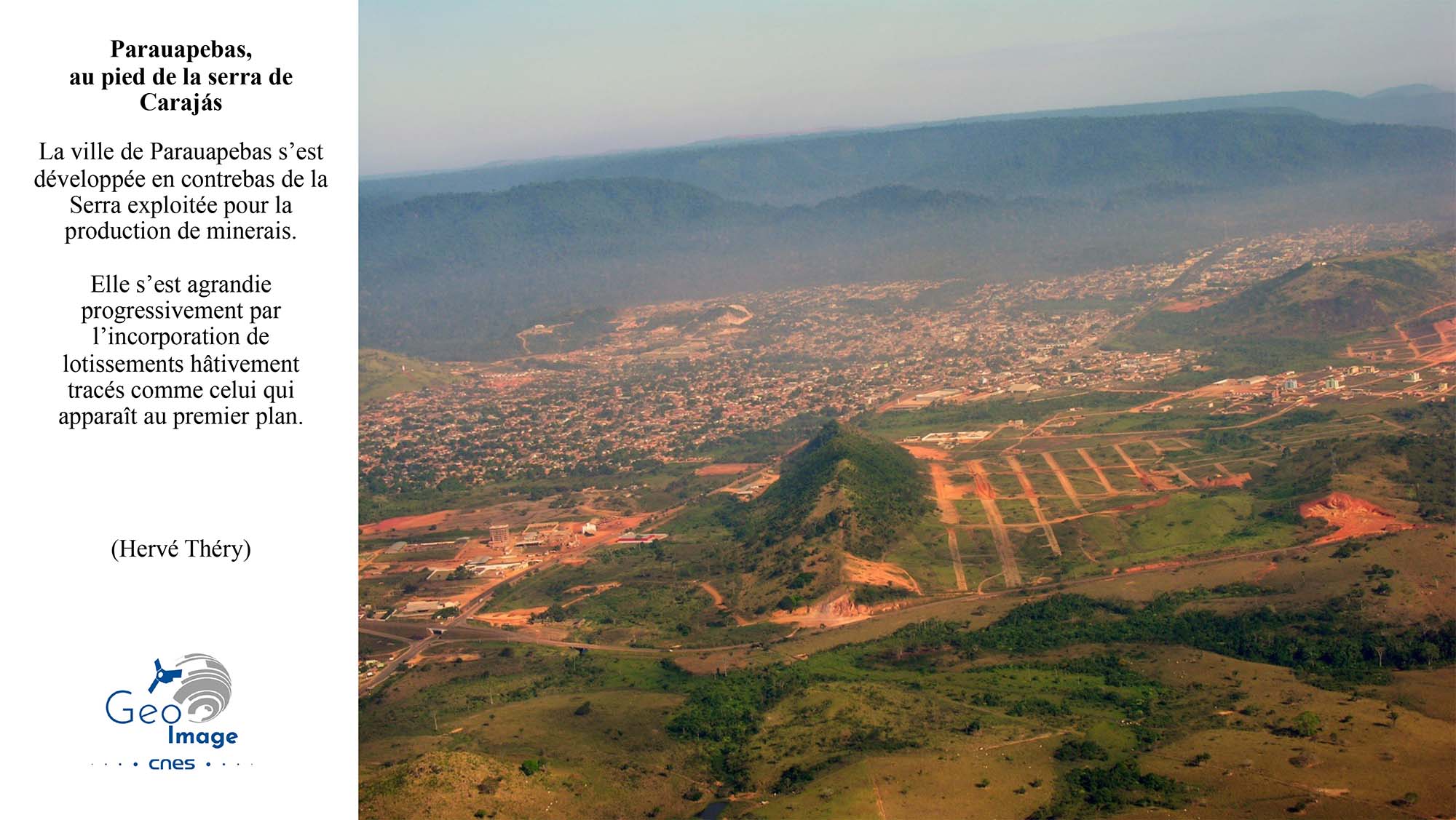La ville de Parauapebas s’est développée en contrebas de la Serra exploitée pour la production de minerais et s’est agrandie progressivement par l’incorporation de lotissements hâtivement tracés comme celui qui apparaît au premier plan. On peut suivre les étapes de sa croissance, en parallèle avec le développement du complexe minier, sur des images de Google Earth, grâce à son module « historique » (cf. « La Province Minière Carajás, 1985-2020 », Théry H ; 2022, ).