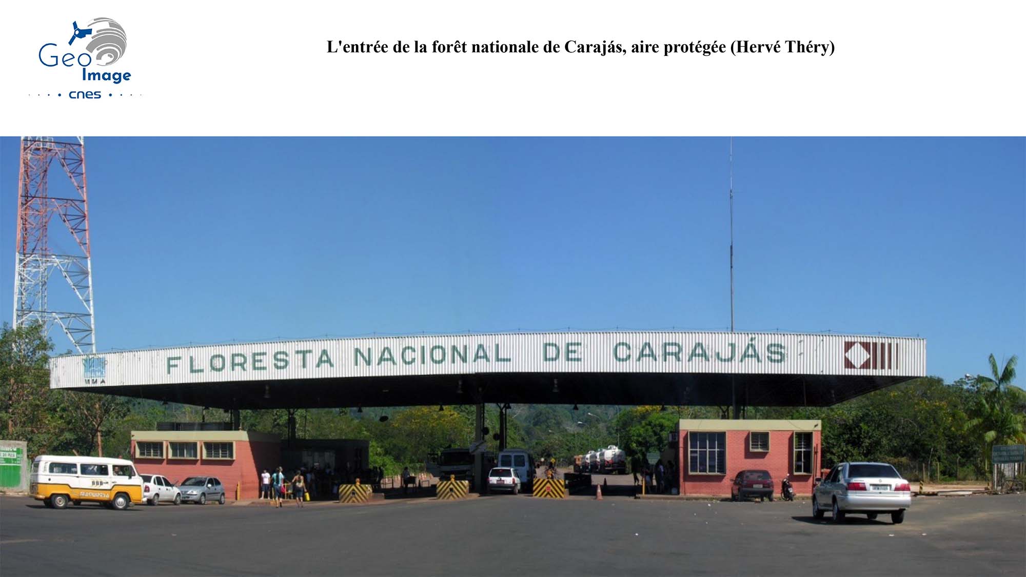 L’entrée dans la forêt nationale de Carajás est contrôlée et réservée à ceux qui travaillent dans le complexe minier, ou aux passagers qui se rendent à l’aéroport. On remarque qu’aux deux extrémités du bandeau qui porte le nom de la forêt figure les logos de l’organisme de protection environnementale (à gauche) et de la compagnie minière (à droite).
