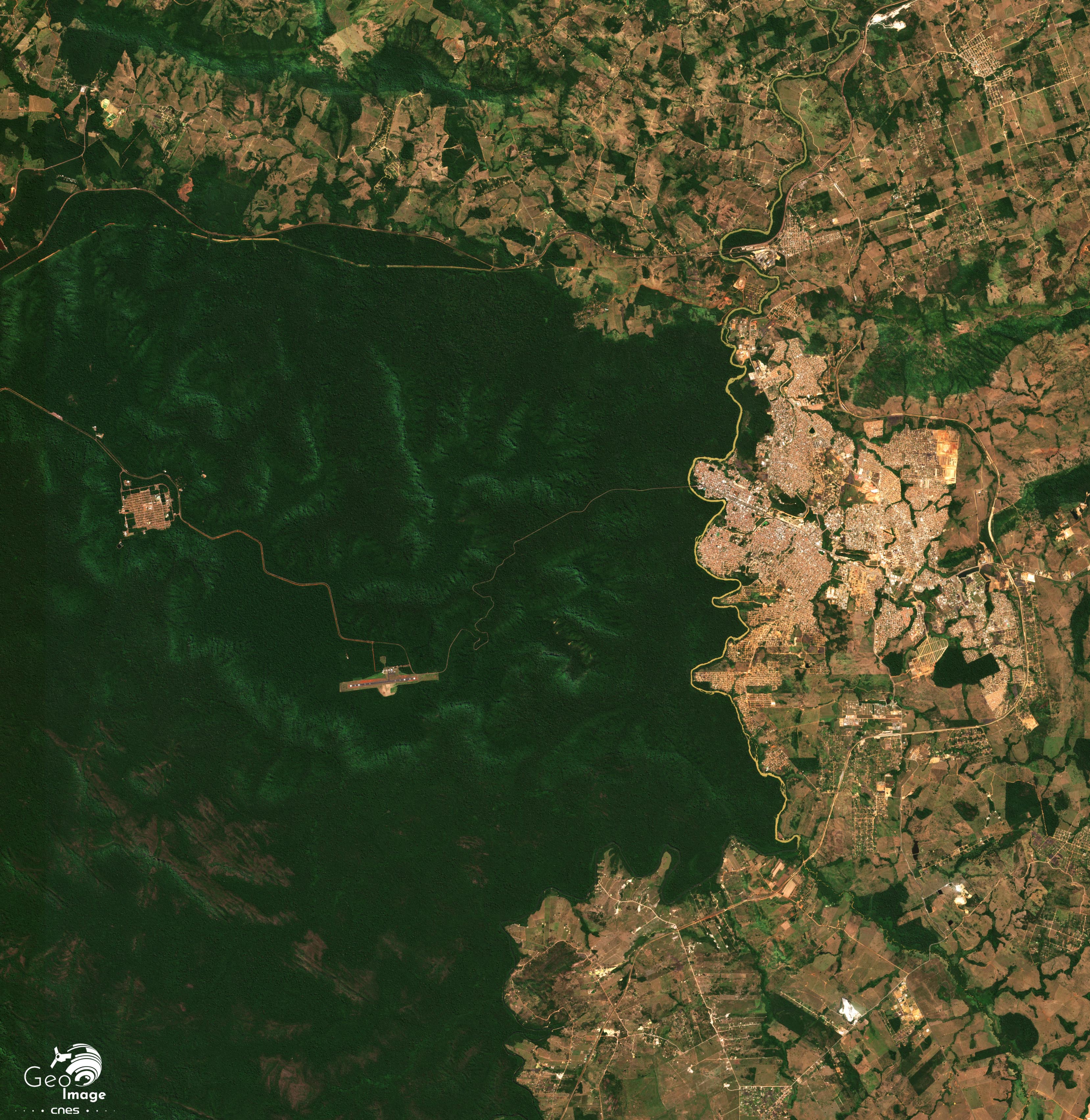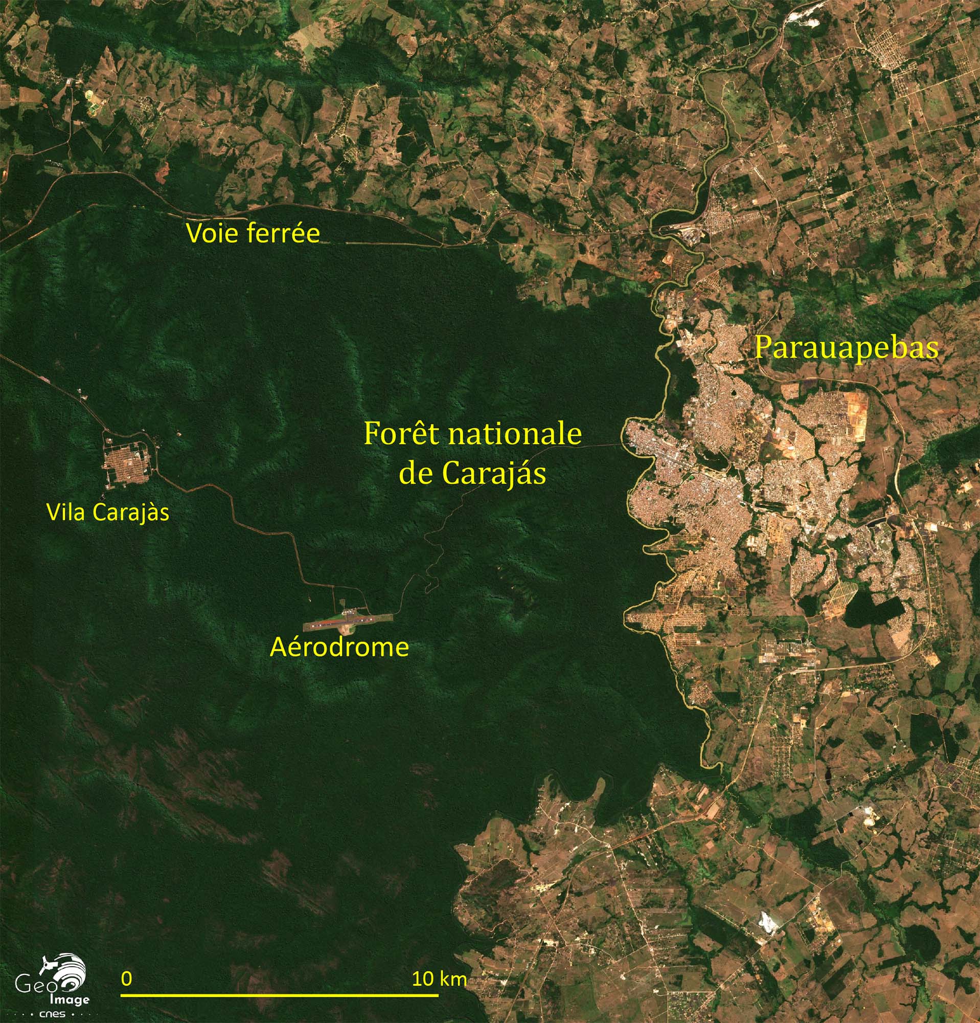 L’aéroport de Carajás (bien visible sur l’image satellite) est situé à proximité des mines, à l’intérieur de la forêt nationale, et dessert non seulement le complexe minier et son noyau urbain mais aussi la ville de Parauapebas.