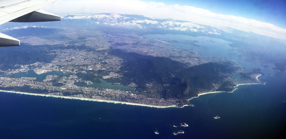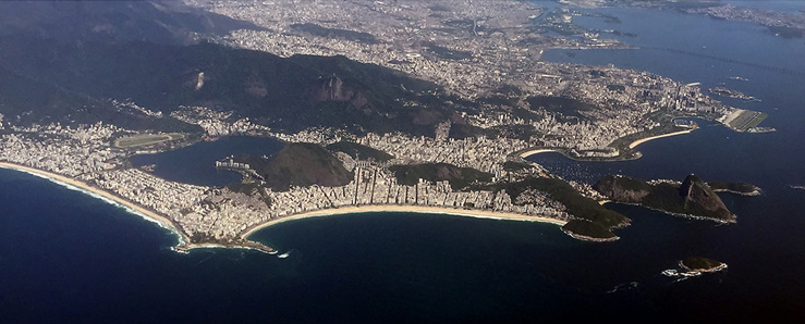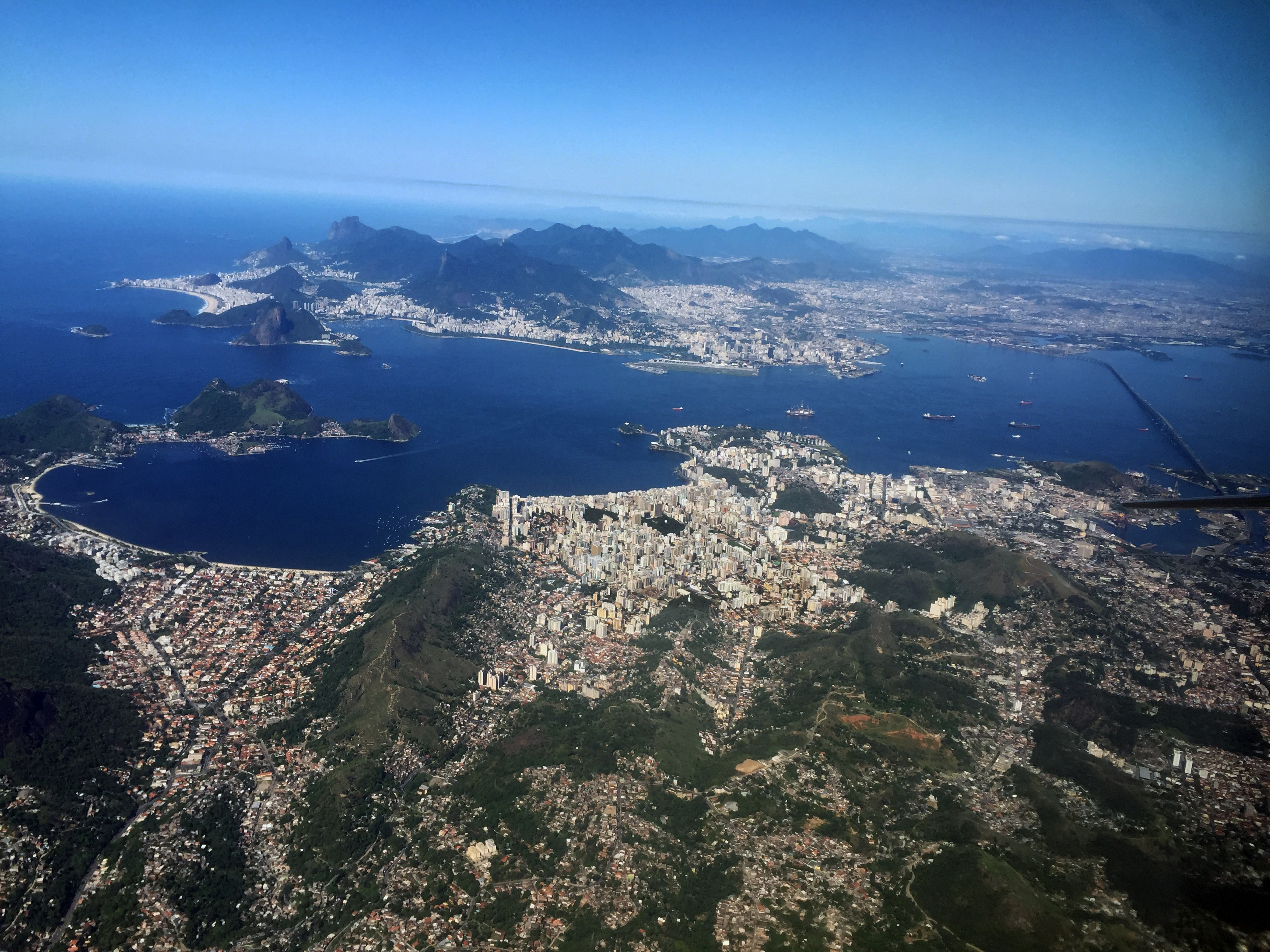 Une vue aérienne complète bien le zoom sur l’image satellitaire et le relie au zoom précédent : au premier plan Niteroi, au-delà de la baie le centre historique, à droite le pont Rio-Niteroi et la Zona Norte, à gauche le Pain de Sucre, le goulet d’entré de la baie et la Zona Sul, en arrière-plan les massifs montagneux de la Tijuca et de la Pedra Branca.