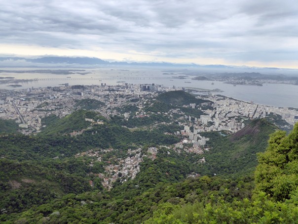 Une vue prise depuis le morne du Corcovado - couronné par la fameuse statue du Christ rédempteur - montre, au-delà des zones résidentielles construites sur ses flancs, le centre historique devenu centre des affaires, bien identifiable avec ses buildings de bureaux, la baie de Guanabara et, en arrière-plan, les montagnes de la Serra do Mar.