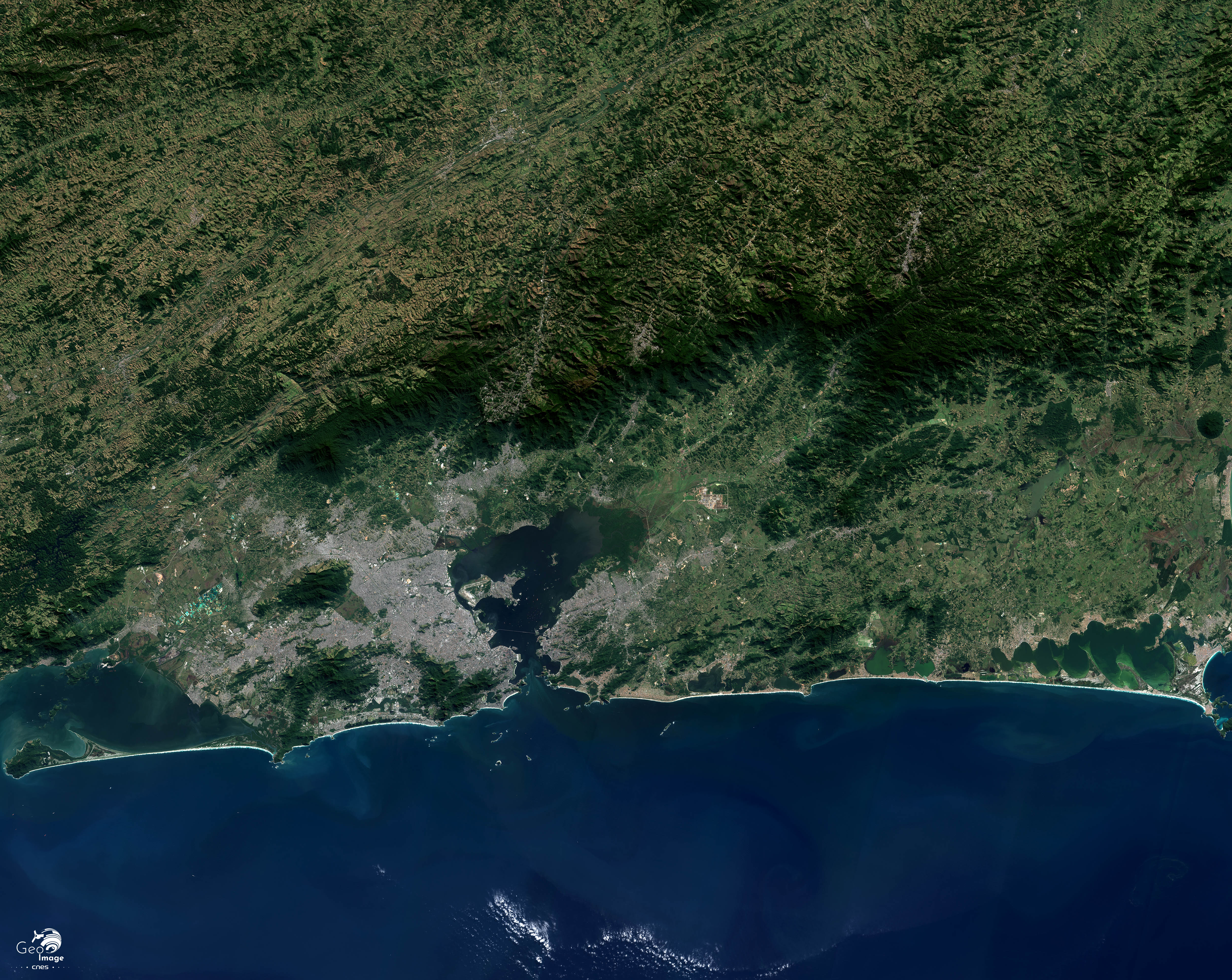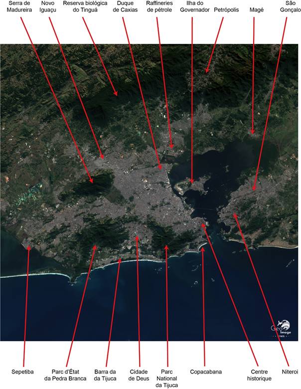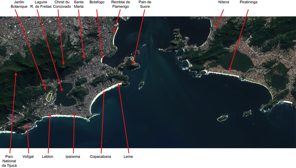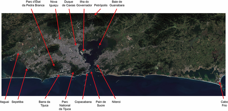 L’image situe Rio de Janeiro dans son cadre régional : prise en profitant d’un rare moment sans aucun nuage, elle montre bien la plaine littorale, la baie et les cordons dunaires qui créent des lagunes littorales et les chaines des montagnes de l’arrière-pays.
