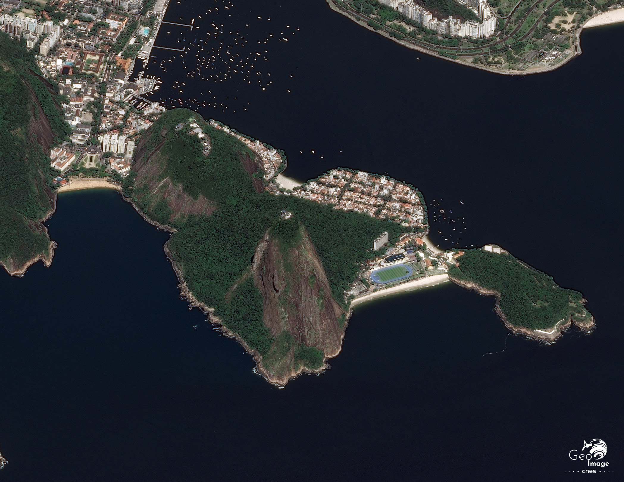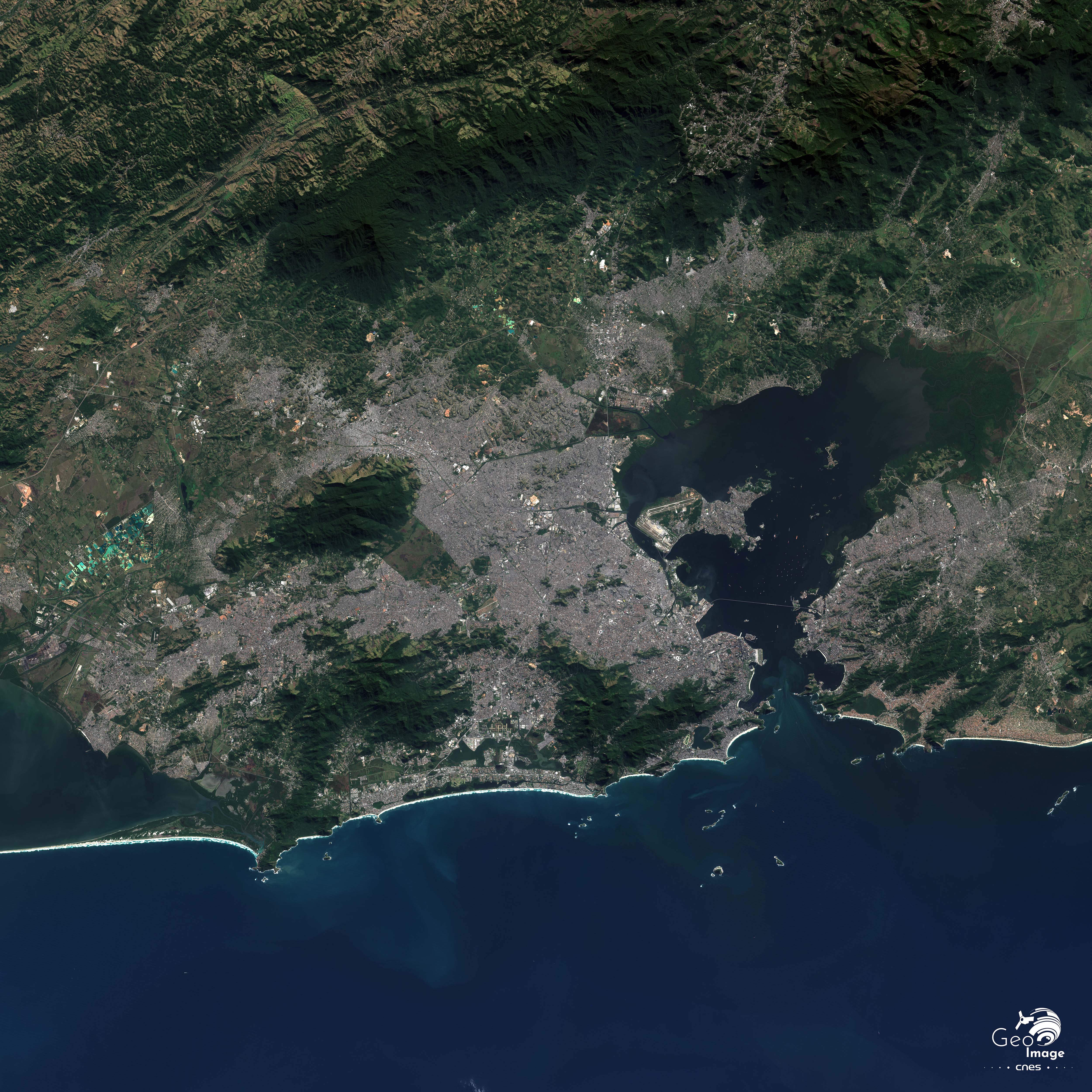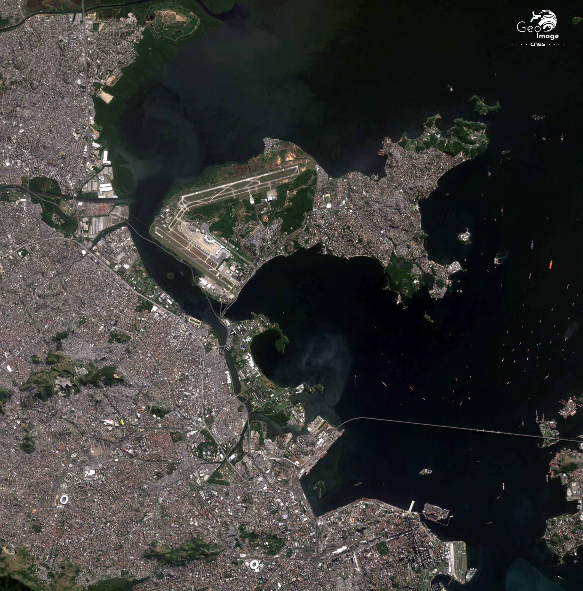 On le voit bien mieux sur une image prise par le satellite Pleiades (partie haute du montage), dont la qualité est telle qu’elle diffère à peine – bien que prise à 694 kilomètres de distance – d’une photographie (partie basse) prise à quelques centaines de mètres d’altitude, juste avant un atterrissage à l’aéroport Santos Dumont.