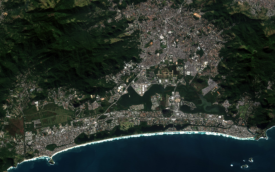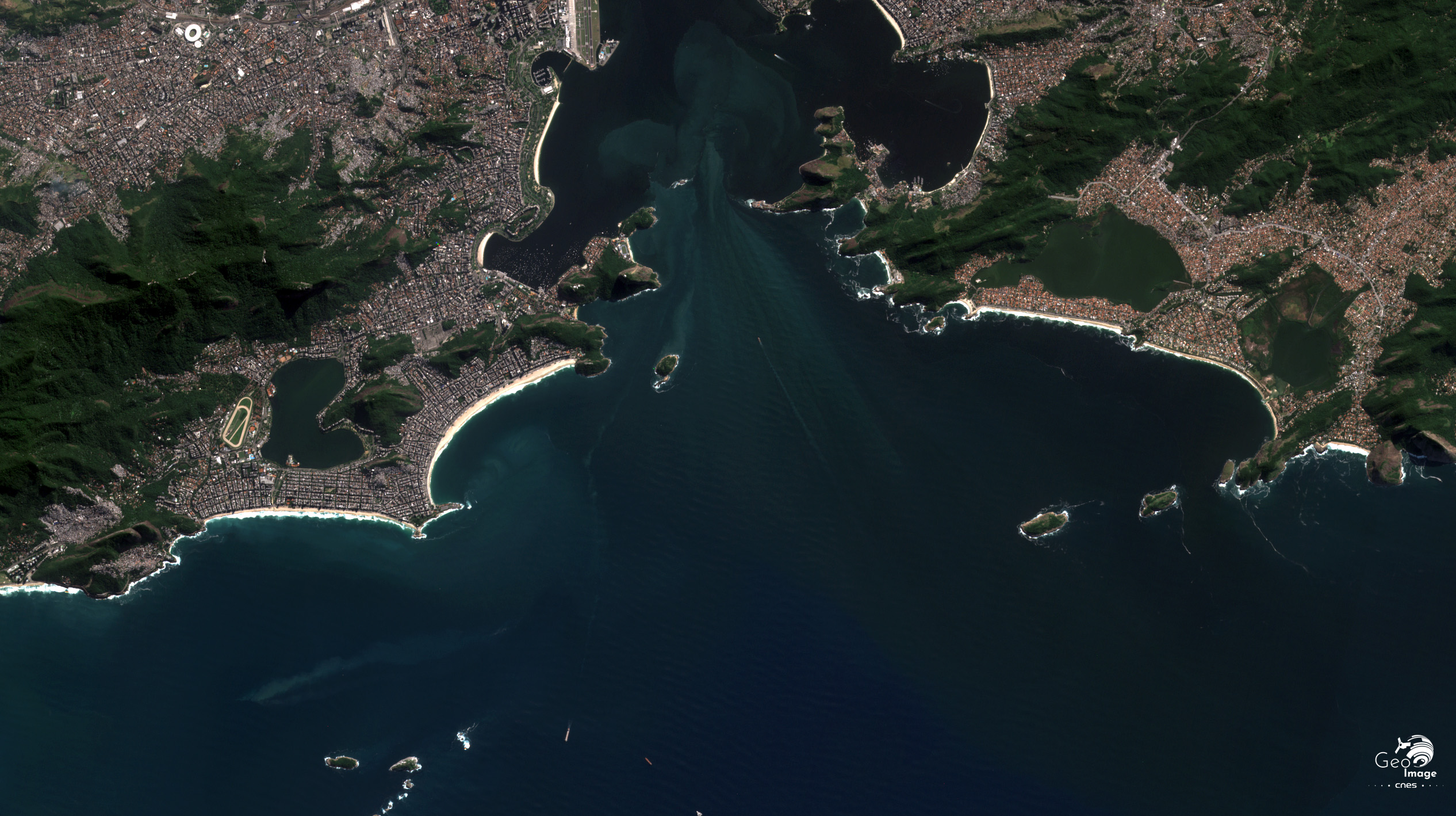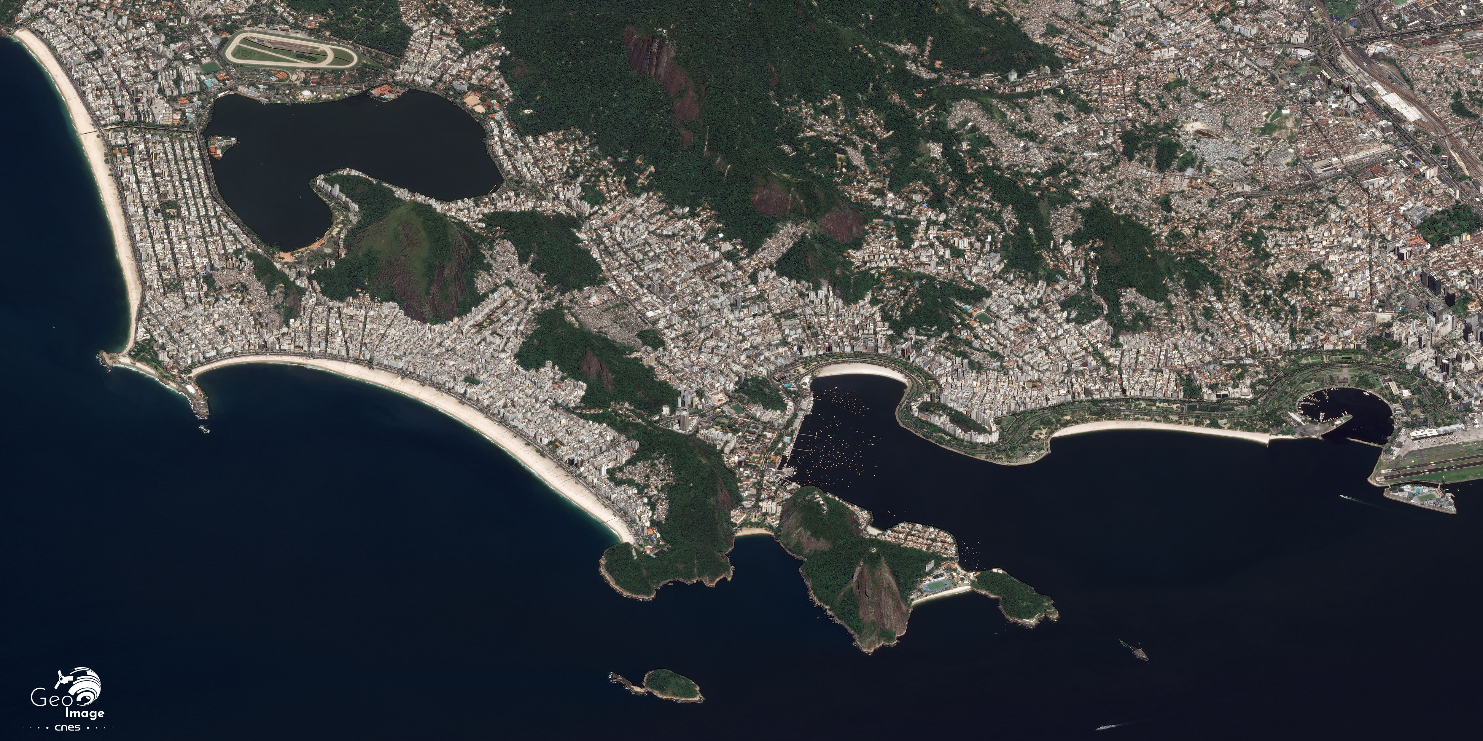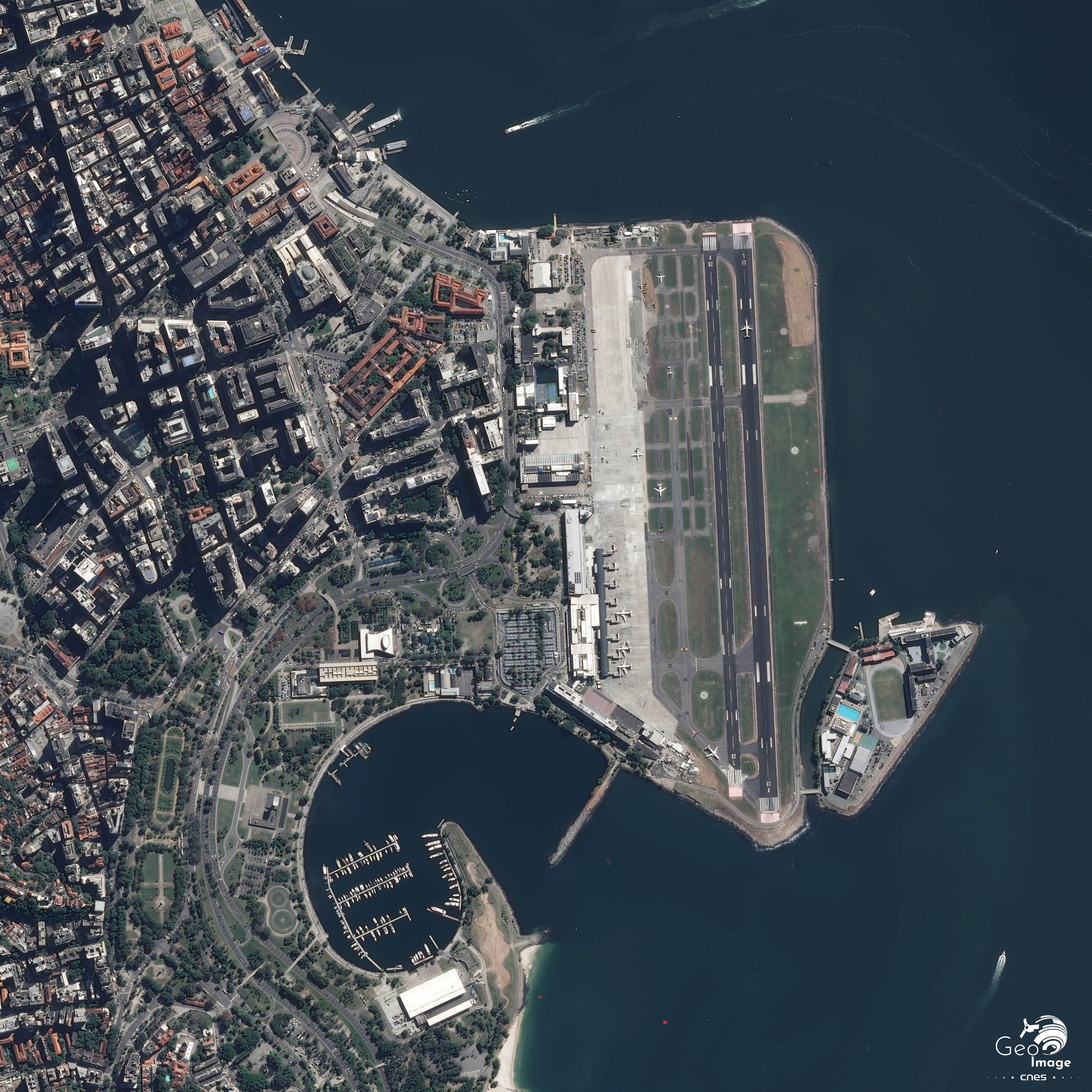On le voit bien mieux sur une image prise par le satellite Pleiades (partie haute du montage), dont la qualité est telle qu’elle diffère à peine – bien que prise à 694 kilomètres de distance – d’une photographie (partie basse) prise à quelques centaines de mètres d’altitude, juste avant un atterrissage à l’aéroport Santos Dumont.