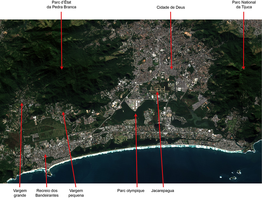Le quartier de la Barra da Tijuca occupe progressivement l’espace compris entre la mer, le Parc National da Tijuca et le Parc d’État de Pedra Branca, l’un de statut fédéral et l’autre géré par l’État de Rio de Janeiro. C’est là qu’ont été implantées quelques-unes des installations sportives et résidentielles des Jeux Olympiques de 2016, en partie sur l’emprise de l’autodrome de Jacarepaguá ou se courait jusqu’en 1989 Le Grand Prix du Brésil de Formule 1 et qui a été démoli en 2012.
