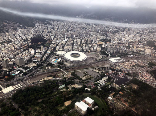 Entre celle-ci et le centre se situe la zone portuaire, où s’amorce le pont qui relie la ville à Niteroi, de l’autre côté de la baie de Guanabara : long de plus de 13 kilomètres il a été inauguré en 1974, une des grandes réalisations dont la dictature militaire (1964-1985) était si fière. Cette zone portuaire, très dégradée, a été l’objet d’un vaste réaménagement pour les Jeux Olympiques de 2016, dont un des fleurons est le Museu do Amanhã (Musée de Demain), visible sur l’image. On y distingue aussi le stade football Maracanã, lui aussi réformé à cette occasion.