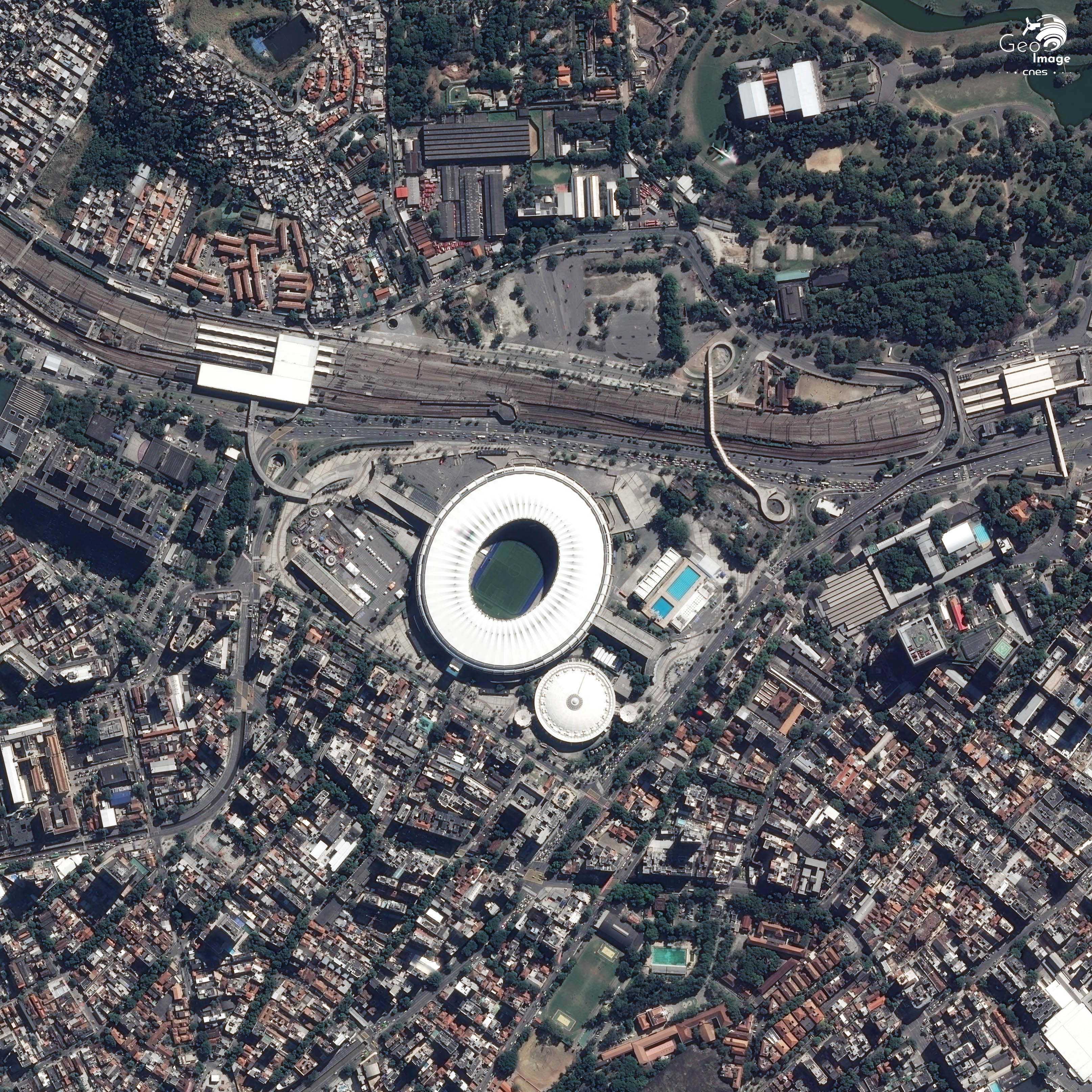 La juxtaposition comparée d’une image prise par un satellite Pleiade (7 août 2019) et d'une photo aérienne du stade de football Maracana.