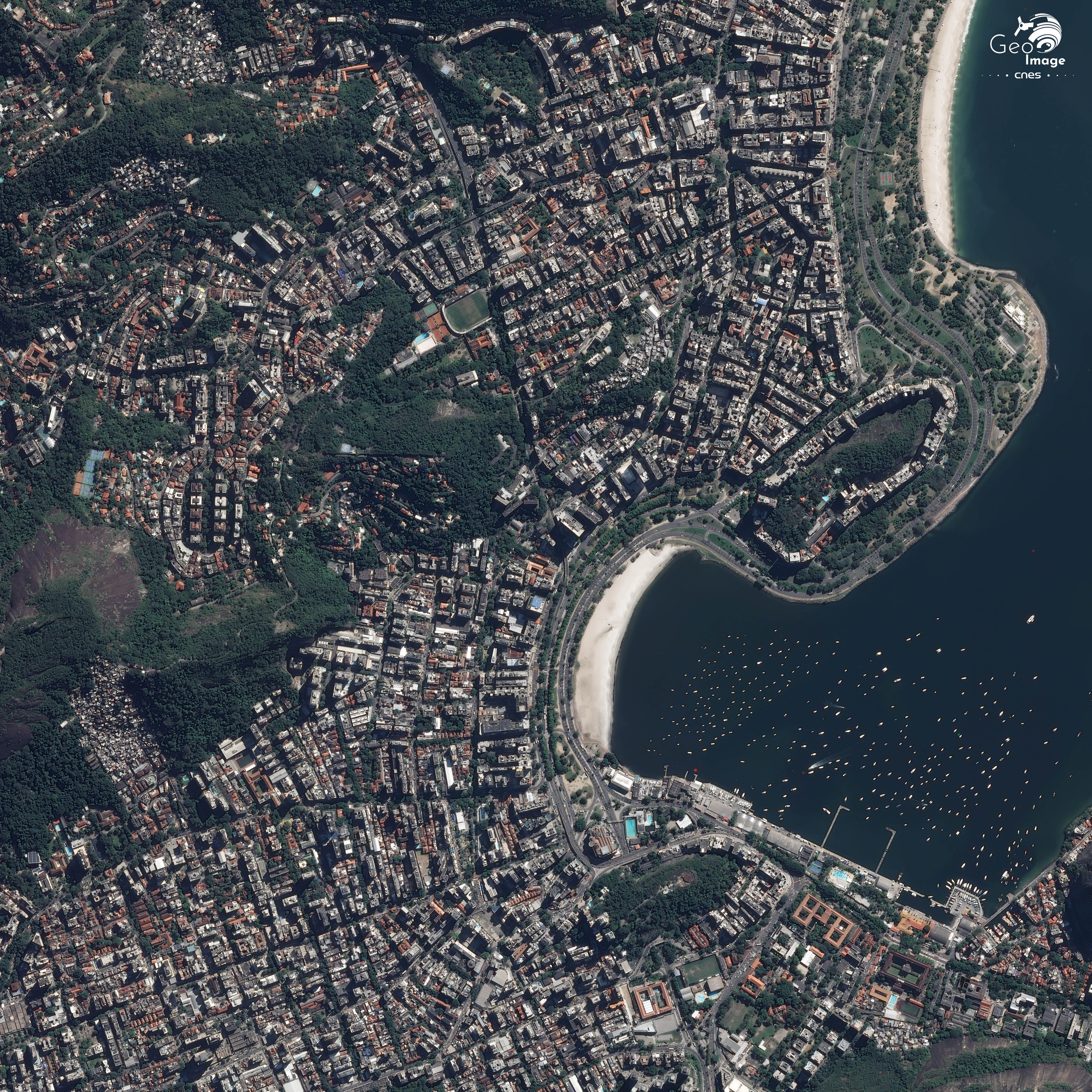 Ici encore l’image prise par le satellite Pléiades (en haut) est à peine reconnaissable de la photo aérienne (en bas) : sur l’une et l’autre on reconnait le Pain de Sucre, l’aéroport Santos Dumont, les courbes des remblais du quartier Flamengo, aménagés au bord de la baie, et l’arc des plages de Copacabana et Ipanema, séparés par la Ponta do Arpoador (Pointe du Harponneur).