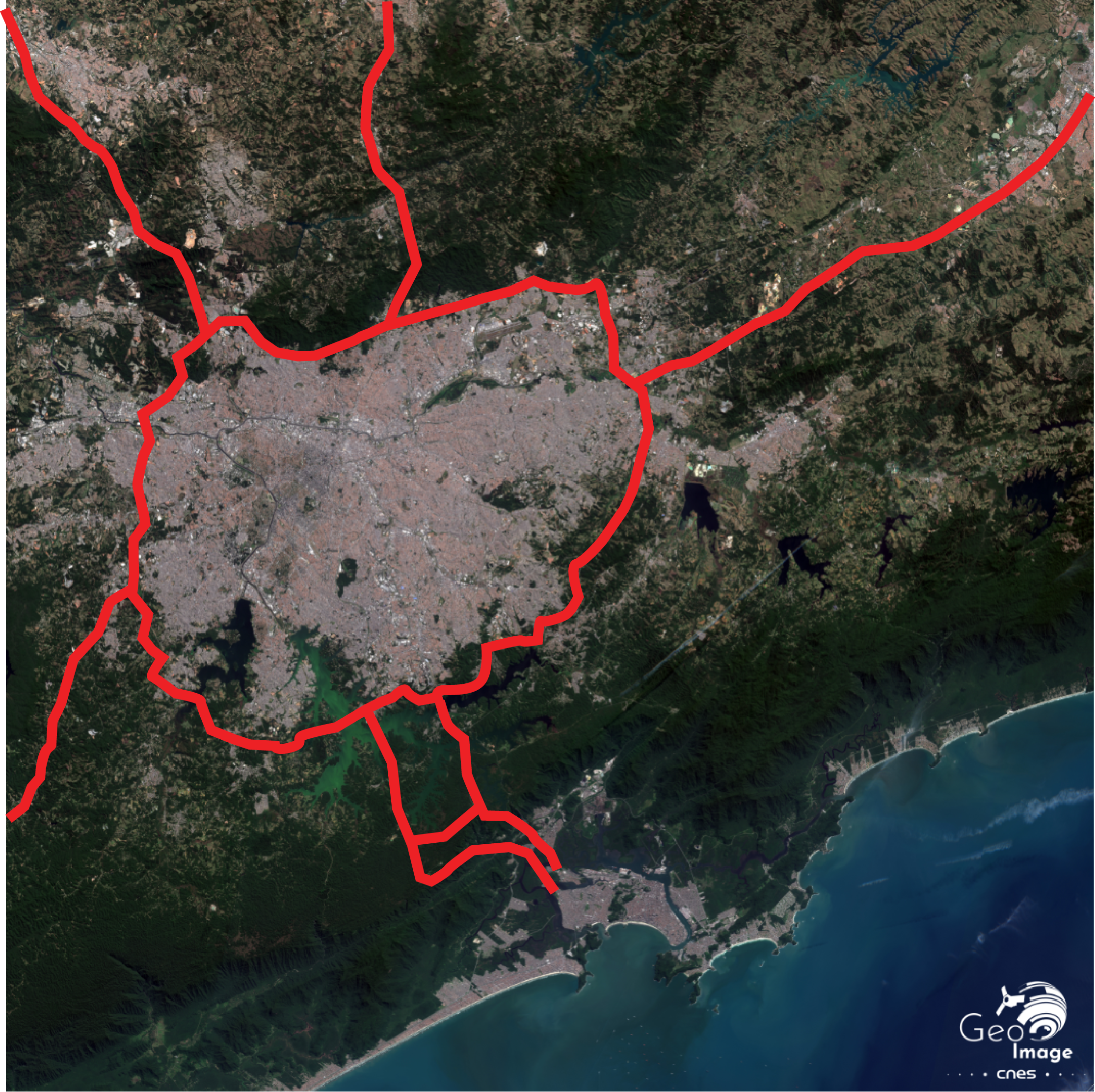 On y observe également les réservoirs créés à l'origine pour produire de l'hydroélectricité en profitant de la dénivellation de plus de 700m. Puis, plus tard, qui vont de plus en plus servir de réserve d'eau potable à la ville, avant qu'on y renonce à cause de leur pollution. D’ailleurs, sur l'image satellitaire, les deux principaux - Billings et Guarapiranga - ont des couleurs différentes, noir et vert, en fonction de la qualité de leurs eaux.
