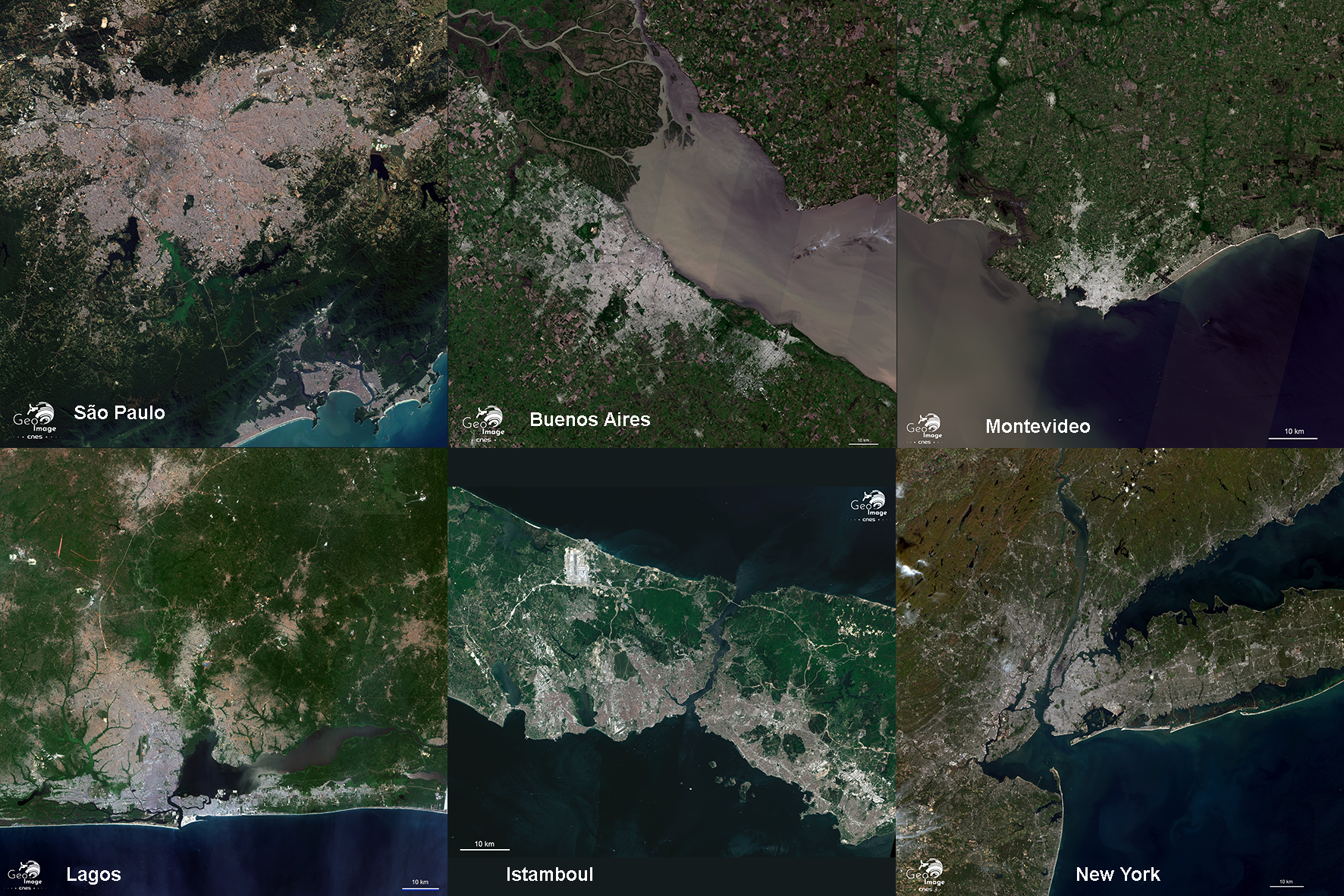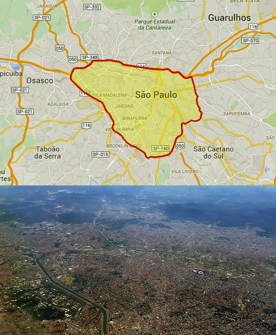 Pour mieux apprécier l'étendue de la zone urbanisée, on peut comparer São Paulo à d'autres métropoles mondiales choisies pour leurs similitudes de configuration liées à la proximité avec le littoral, même si celui-ci ne se situe pas forcément dans la même direction.