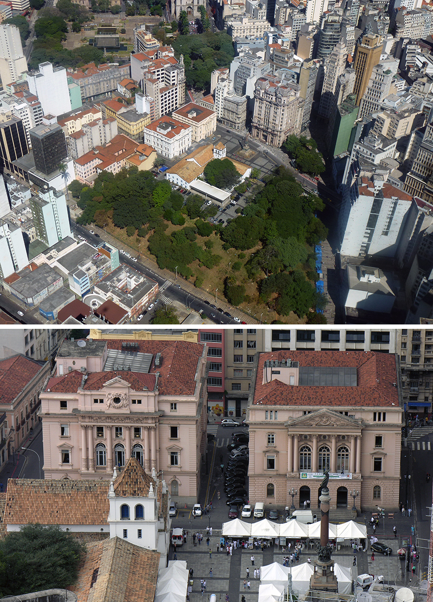 Le Pátio do Colégio est la place où se situait le collège construit par les Jésuites en 1554, l'acte fondateur de la ville de São Paulo. Il est peu visible sur l'image satellitaire, comme tout le centre historique mais en vue aérienne ou du haut des immeubles voisins (Fig. 13), on perçoit bien en quoi cette place résume l'histoire de la ville : alors que les bâtiments initiaux - remis dans leur état initial présent longtemps abrité le palais du gouverneur - étaient de style portugais, ceux qui les jouxtent au Nord, construits au XIXe siècle, sont de style néoclassique européen et les gratte-ciel qui lui font face sont clairement inspirées de modèles nord-américains.