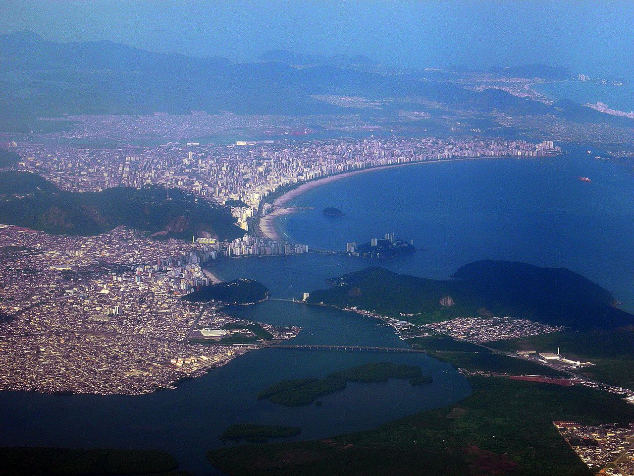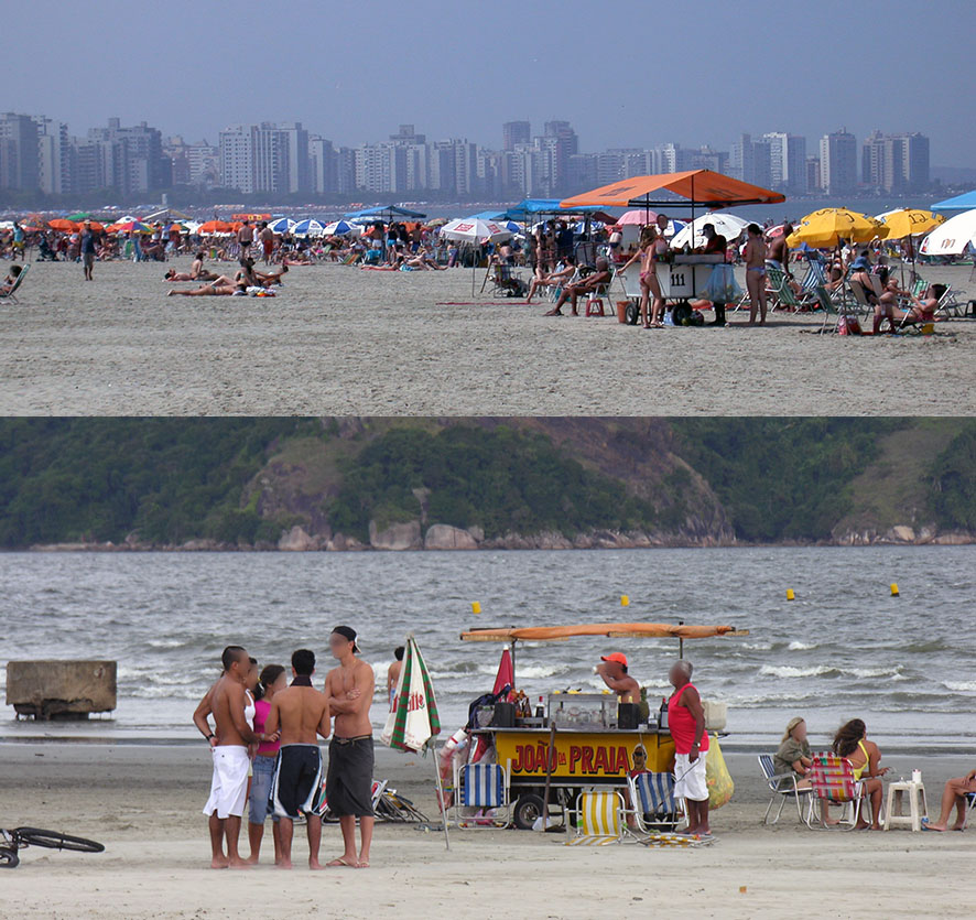 La cohabitation est également problématique avec une autre des activités majeures de la région, le tourisme balnéaire de masse, dans des stations très fréquentées par la population de São Paulo (Fig. 30). Toute une série d'entre elles se succèdent au long du littoral, vers le sud-est comme Praia Grande, ou vers le nord-ouest, comme Guarujá, la première d'une longue succession de stations qui s'étend désormais bien au-delà de l'image jusqu'à la frontière de l'État de Rio.
