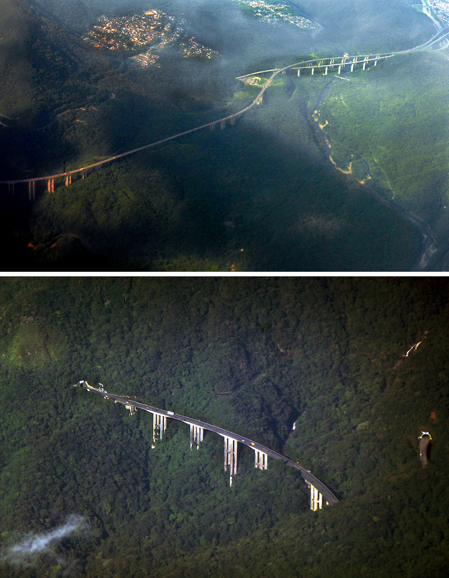 Aujourd'hui, les liaisons sont assurées par deux autoroutes : l'une plus ancienne, la rodovia (route) Anchieta, et l'autre plus récente, la rodovia Imigrantes (Fig. 27). La première, baptisée du nom du jésuite qui fonda le collège d'où est née São Paulo, a été construite entre 1939 et 1947. Le nom de la seconde rend hommage aux immigrants arrivés par Santos et qui ont colonisé l'intérieur de l'État de São Paulo pour produire le café qui a fait sa fortune. Sa construction, de 1974 1976, à une époque où l'on se souciait déjà davantage de préserver l'environnement, s'est faite en utilisant au maximum viaducs et tunnels, de façon à préserver le plus possible les forêts qui couvrent encore le revers de la serra do Mar. On n'a hélas pas pu empêcher que certains des campements ouverts au moment de la construction ne se transforment en invasions permanentes, notamment autour de la cota 200, ainsi nommé en raison altitude à laquelle se situe.