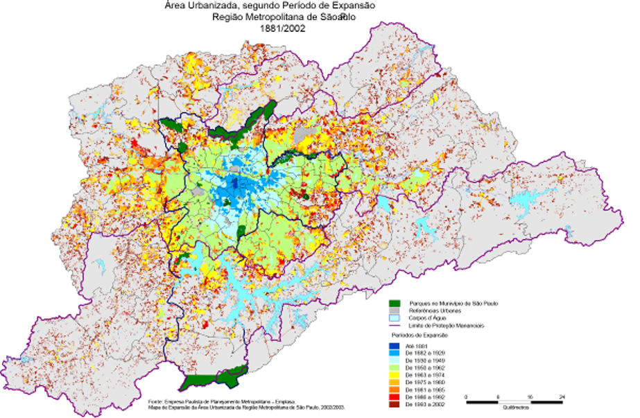La croissance démographique et économique a entraîné une explosion de la zone bâtie, qui a rapidement dépassé les limites de la commune de São Paulo, si bien que, pour la gérer tant bien que mal, il a fallu créer la région métropolitaine, laquelle regroupe aujourd'hui une quarantaine de communes (fig. 4).