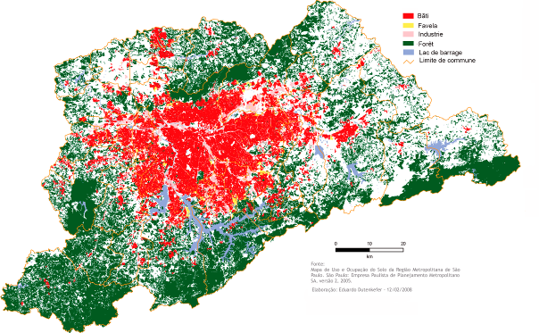 Il s'en faut donc de beaucoup que l'ensemble de la région métropolitaine soit occupé par les zones résidentielles ou industrielles : la figure 8 montre que si elles occupent largement son centre, représenté en rouge, jaune et rose sur la figure, il reste sur ses périphéries des espaces boisés, au sud la serra do Mar, qui occupe le revers du plateau séparant la ville de la mer, et au nord la serra da Cantareira.
