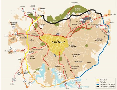 On les suit bien sûr l'image satellitaire sur laquelle elles sont soulignées (Fig. 10). On estime que quand elle sera totalement achevée, cette infrastructure diminuera de 40 % la circulation sur les voies sur berges en les déchargeant du trafic se dirigeant vers le port de Santos ou reliant entre elles des villes extérieures, sans avoir besoin de passer par São Paulo.