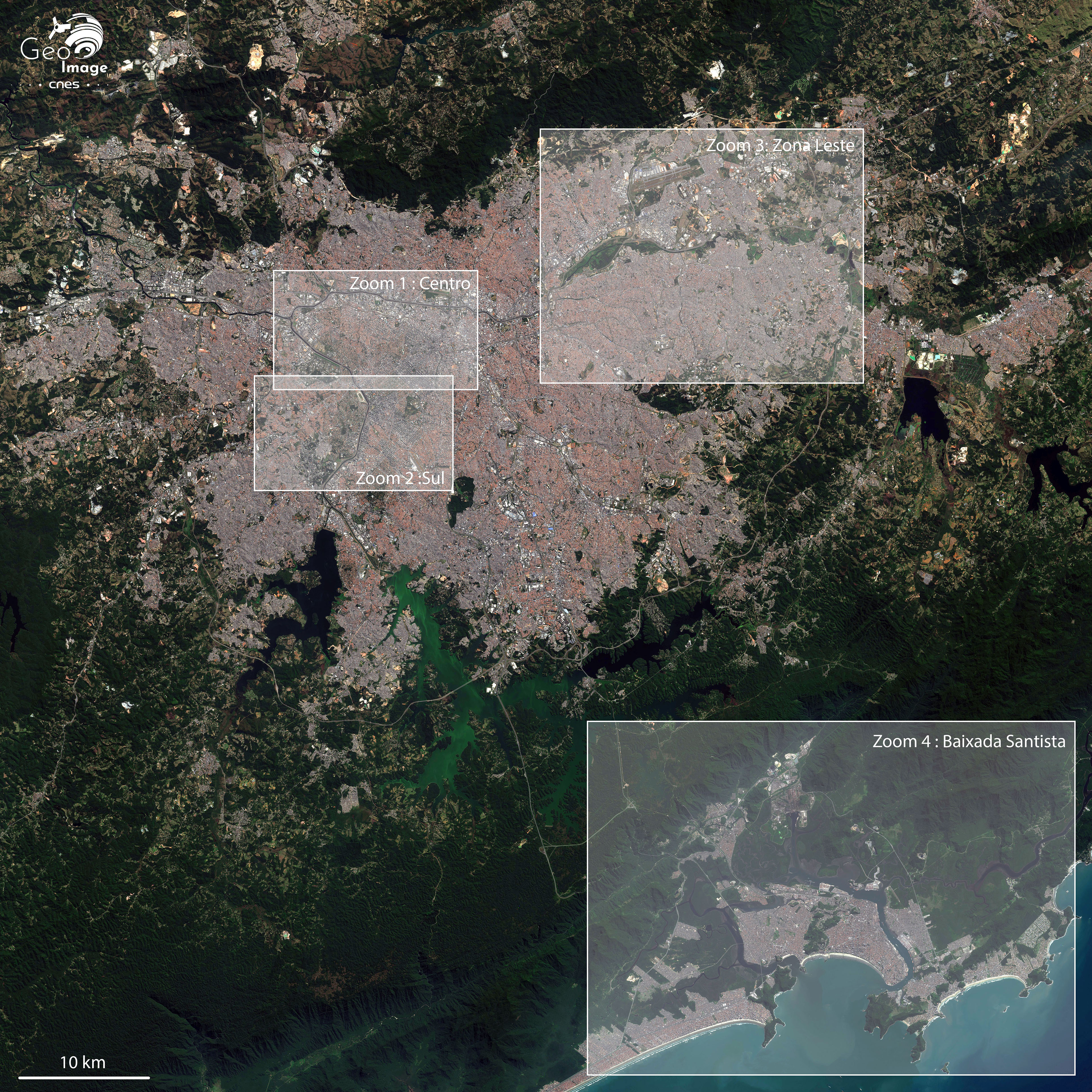 Les zooms d'étude choisis portent sur le centre-ville, les beaux quartiers de l'ouest, la périphérie populaire de l'est – ou Zona Leste, et la région portuaire et balnéaire de Santos, ou Baixada santista.