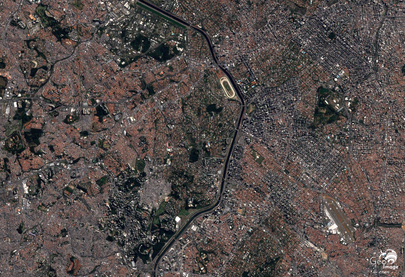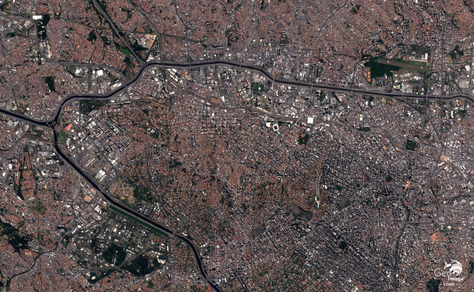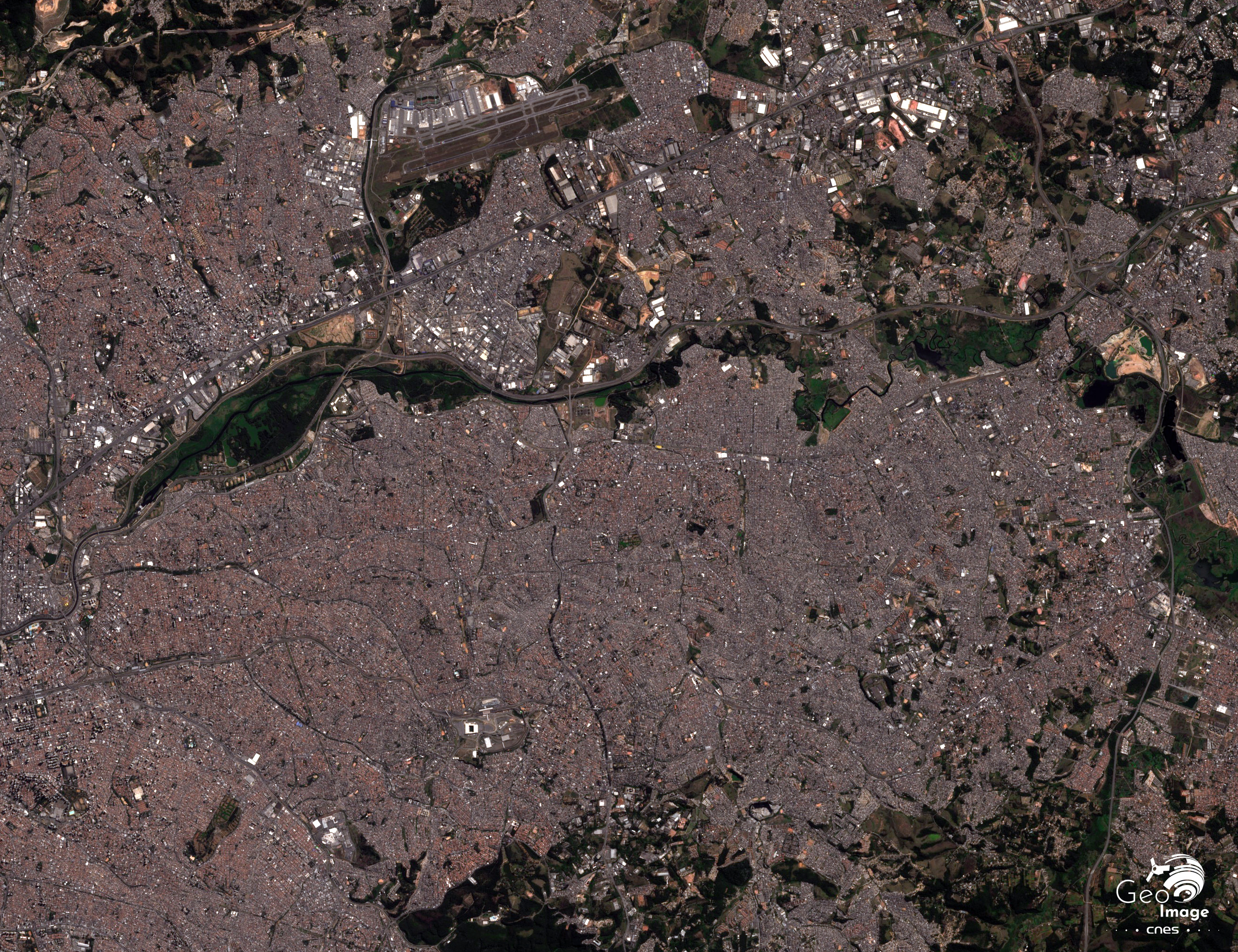 Ce qui saute aux yeux, sur le zoom comme sur la vue aérienne (Fig. 21), c’est l’absence d’axes structurants et d’espaces verts susceptibles de rompre le moutonnement de constructions basses s’étendant à perte de vue. Les seuls éléments facilement repérables sont la vallée du Tietê (notamment son parc écologique, cf. infra) et l’aéroport international de Guarulhos, situé dans la partie supérieure de l’image satellitaire.