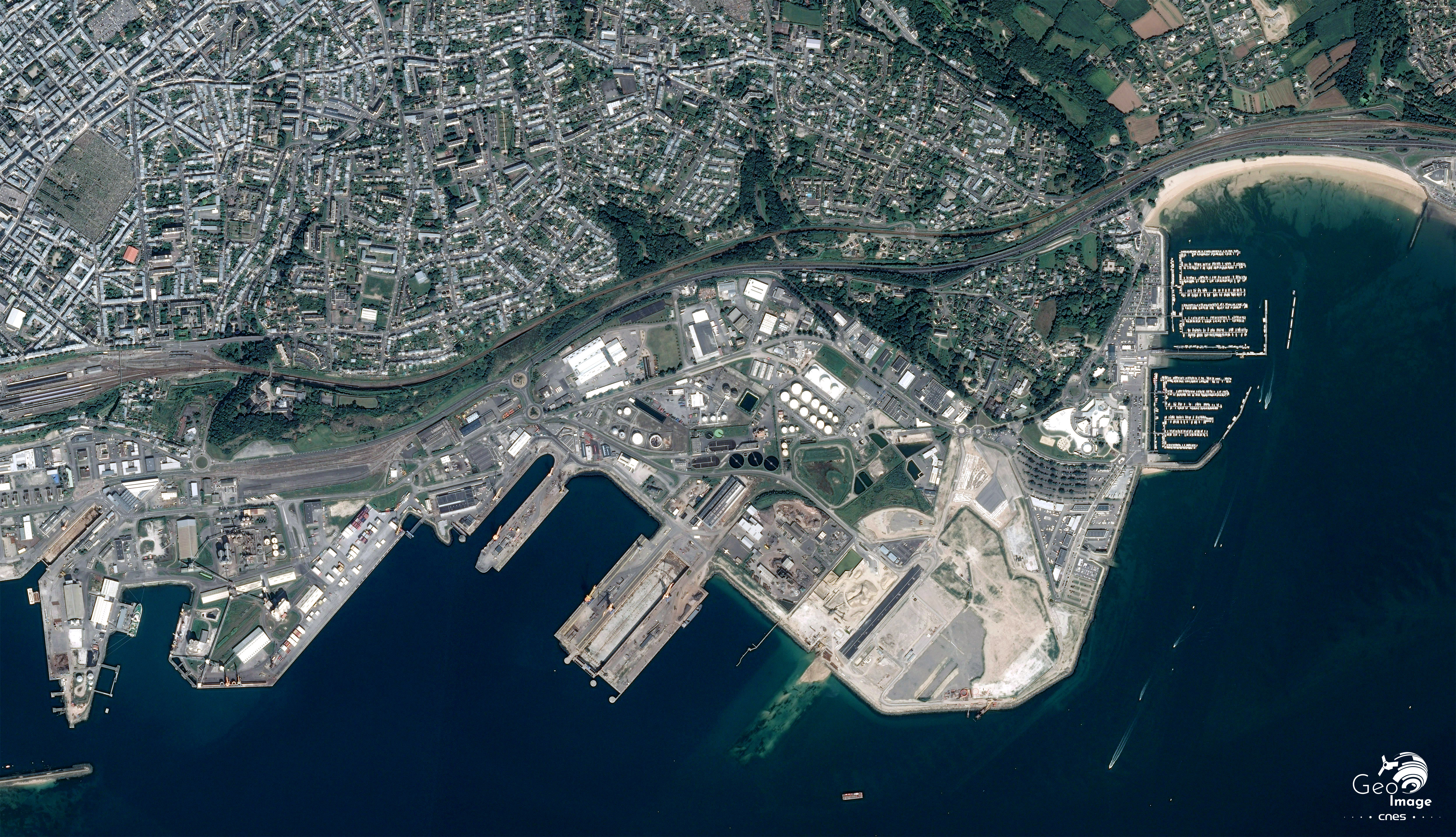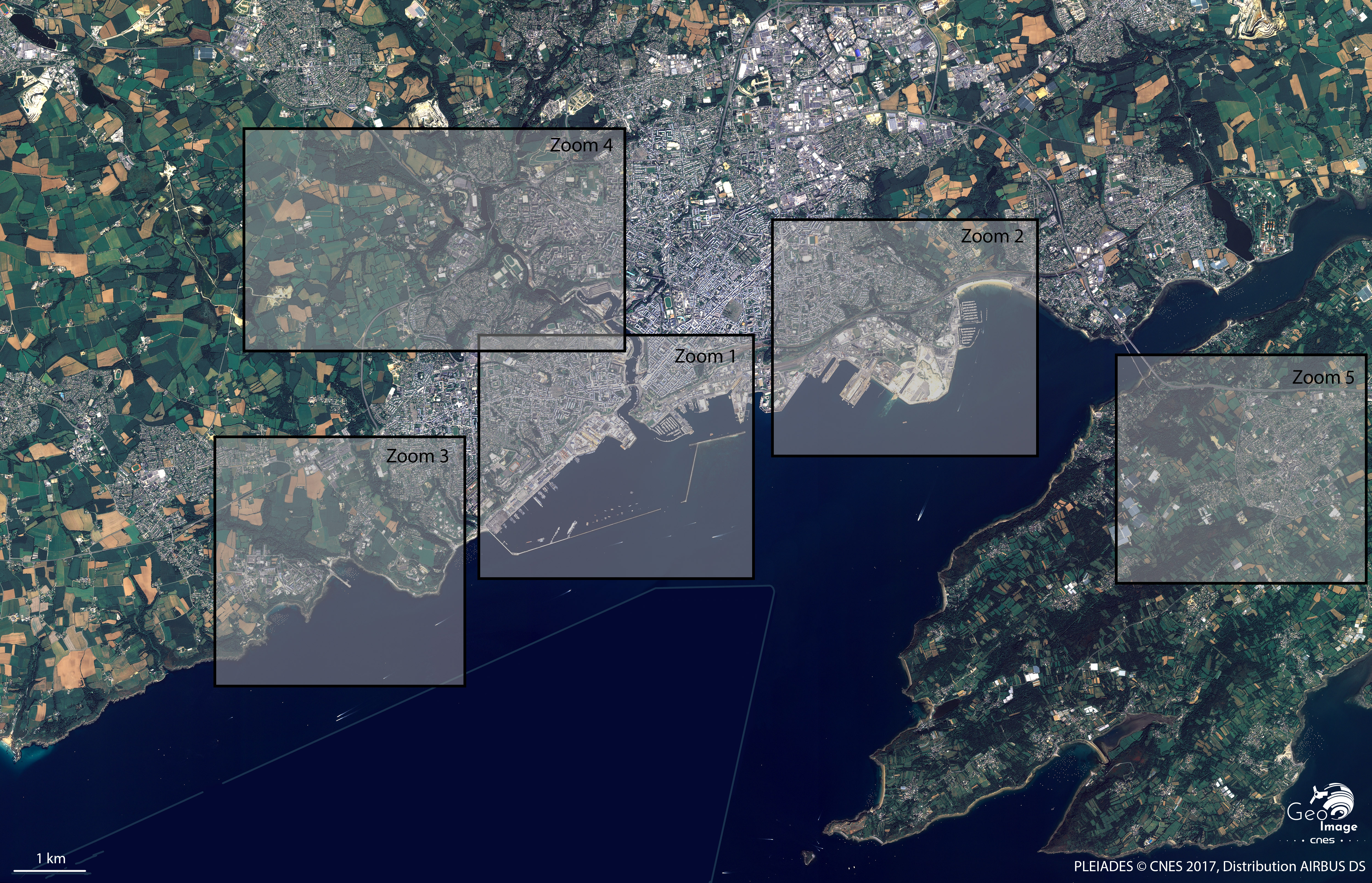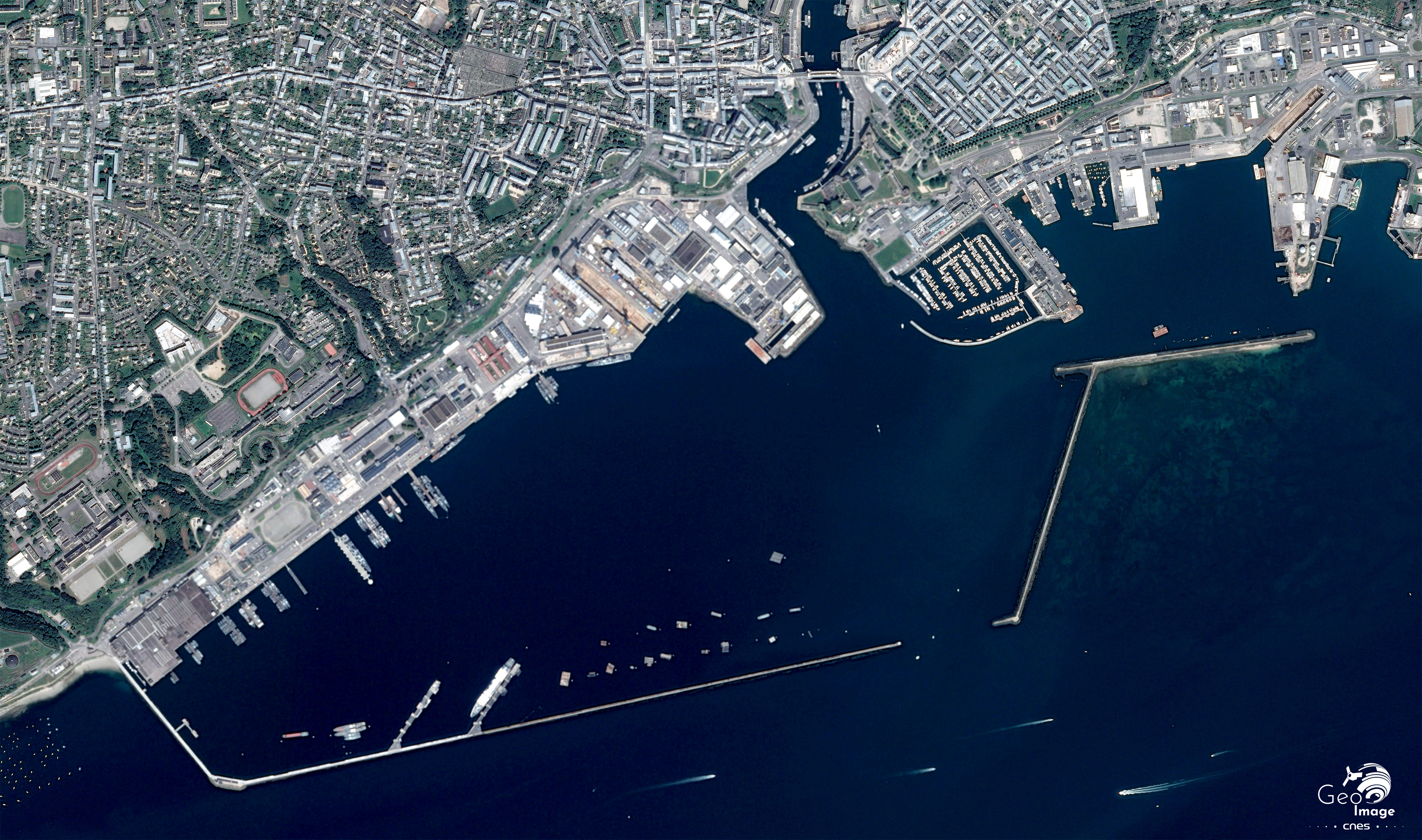 Cette image de Brest, ville portuaire bretonne, a été prise par un satellite Pléiades, le 27 aout 2017. Il s’agit d’une image de résolution native à 0,70m, ré-échantillonnée à 0,5m.