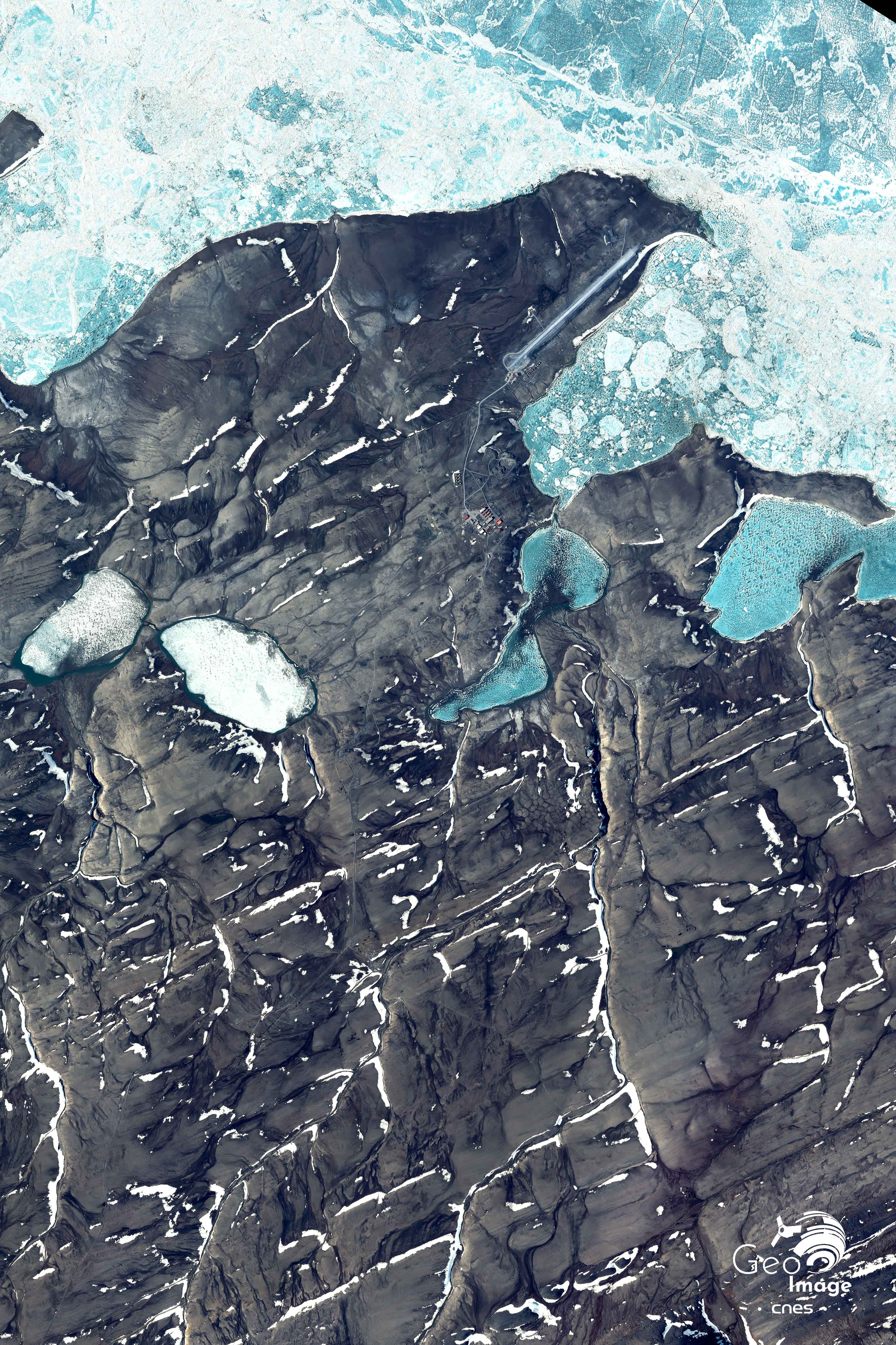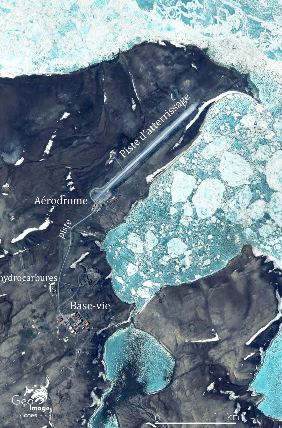 Dans cette immensité glacée, l’image témoigne de la précarité de cette petite base posée sur un cap bordé à l’est par une baie. À une situation géostratégique exceptionnelle répond un site de relative qualité, car relativement stable et protecteur. En emboîtant les échelles d’analyse géographique, géopolitique et géostratégique, on ne peut qu’être frappé par le décalage existant entre cette petite piste d’avion, ces quelques bâtiments et les fonctions et responsabilités qui sont les leurs à l’échelle mondiale.