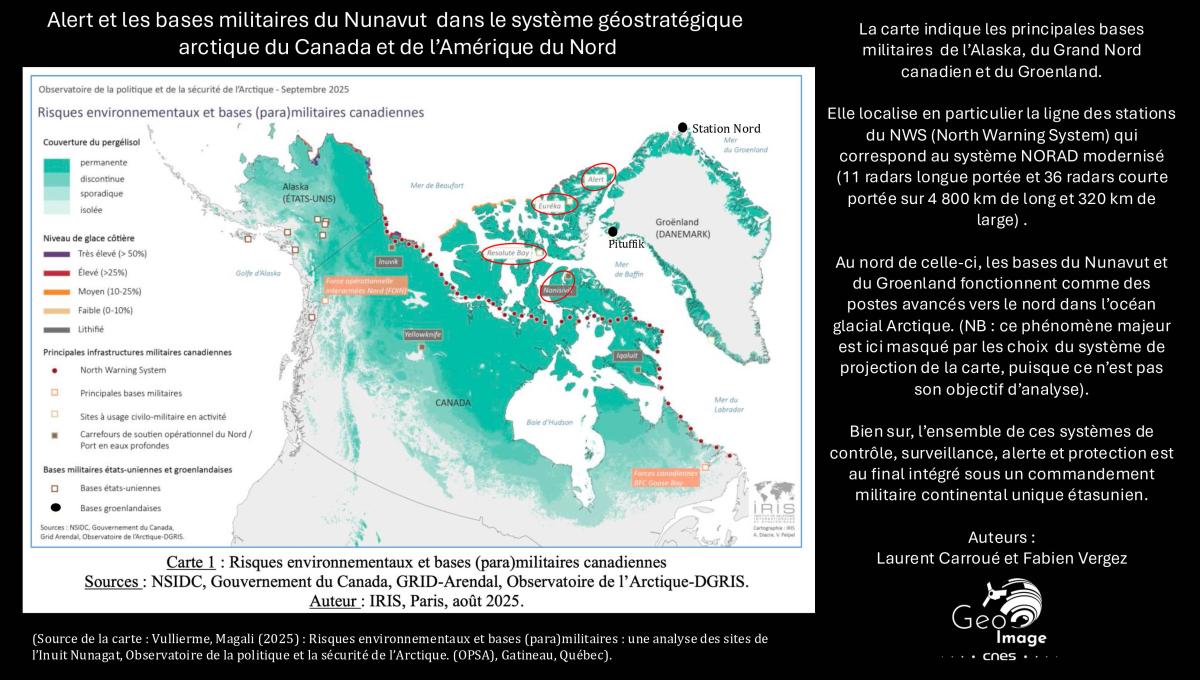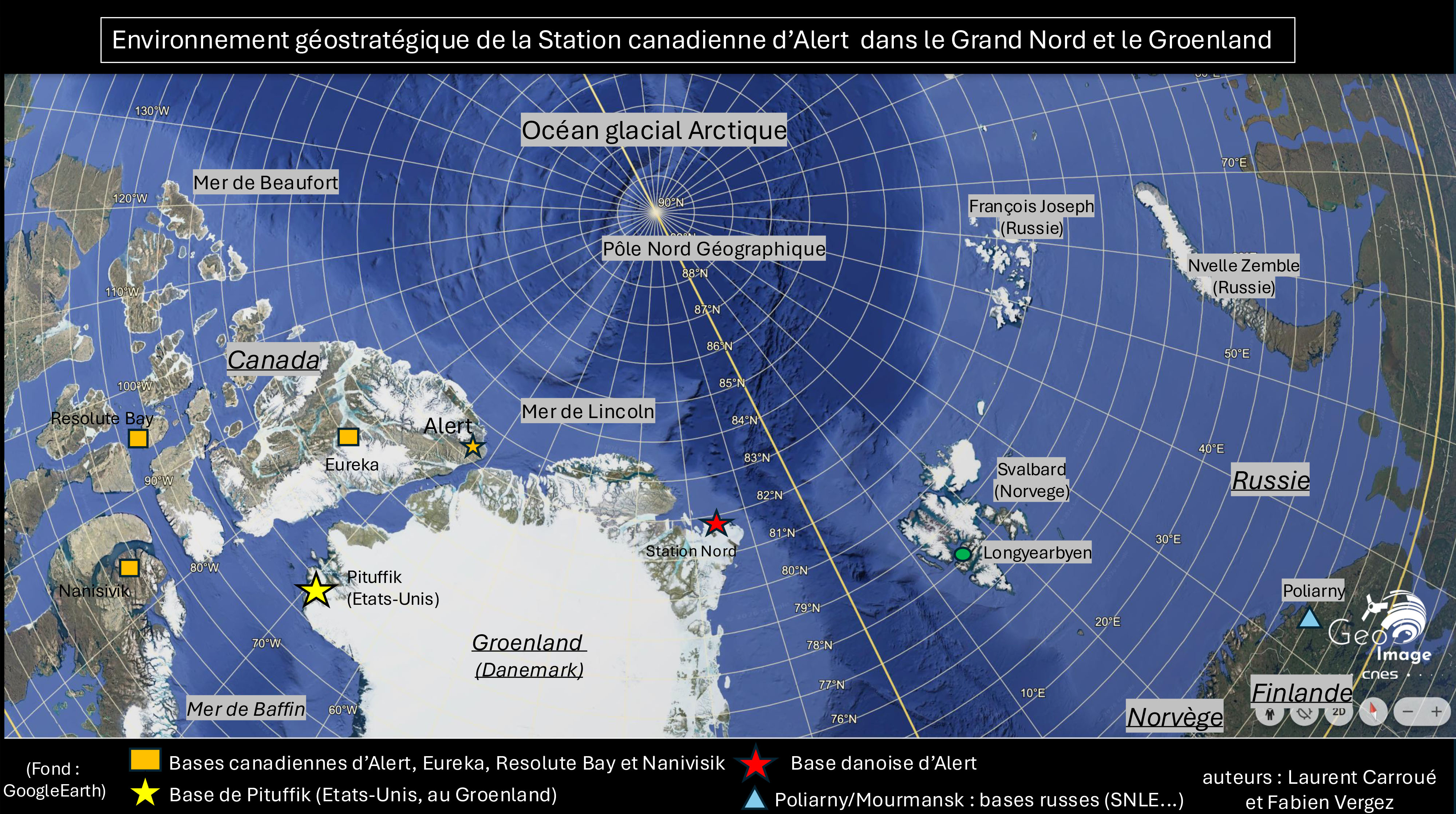 Ouverte en 1950 en pleine Guerre froide, la Station des Forces Canadiennes (SFC) Alert, au bord de l’océan Glacial Arctique, est la base militaire la plus proche du pôle Nord. Avec les sites d’Eureka, Resolute Bay et Nanisivik au Nunavut canadien d’un côté, et Pituffik et la station Nord au Groenland de l’autre, la base d’Alert appartient au système de défense, de contrôle et d’alerte le plus avancé en Amérique du Nord dans l’Arctique face à la Russie. Elle symbolise aussi l’affirmation de la souveraineté du Canada dans cet immense espace désertique glacé des hautes latitudes. Alors que l’Arctique est redevenu une zone de compétition stratégique majeure, la nouvelle course aux armements s’accompagne d’une modernisation lancée en 2022 des infrastructures, en lien avec le NORAD (38,6 milliards de dollars canadiens sur vingt ans). Mais la volonté affirmée dès 2025 des Etas-unis d’annexer le Canada, comme nouvel État fédéré, puis le Groenland, sous souveraineté danoise, bouscule les équilibres géostratégiques entre alliés occidentaux.
