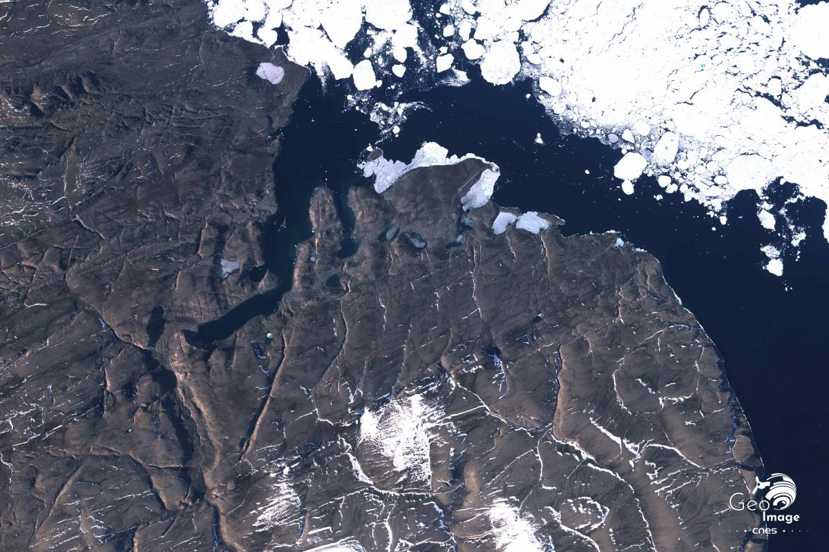 Sur le plan maritime, la base d’Alert est bordée par la mer de Lincoln qui couvre 64 000 km² entre le cap Columbia sur l’île d’Ellesmere à l’ouest et le cap Morris Jesup au Groenland à l’est. Sa relativement faible profondeur (- 100 à - 300 m) facilite le développement de la banquise ; elle est donc couverte de glace quasiment toute l’année, comme l’indique cette image prise à la fin du mois de mai.