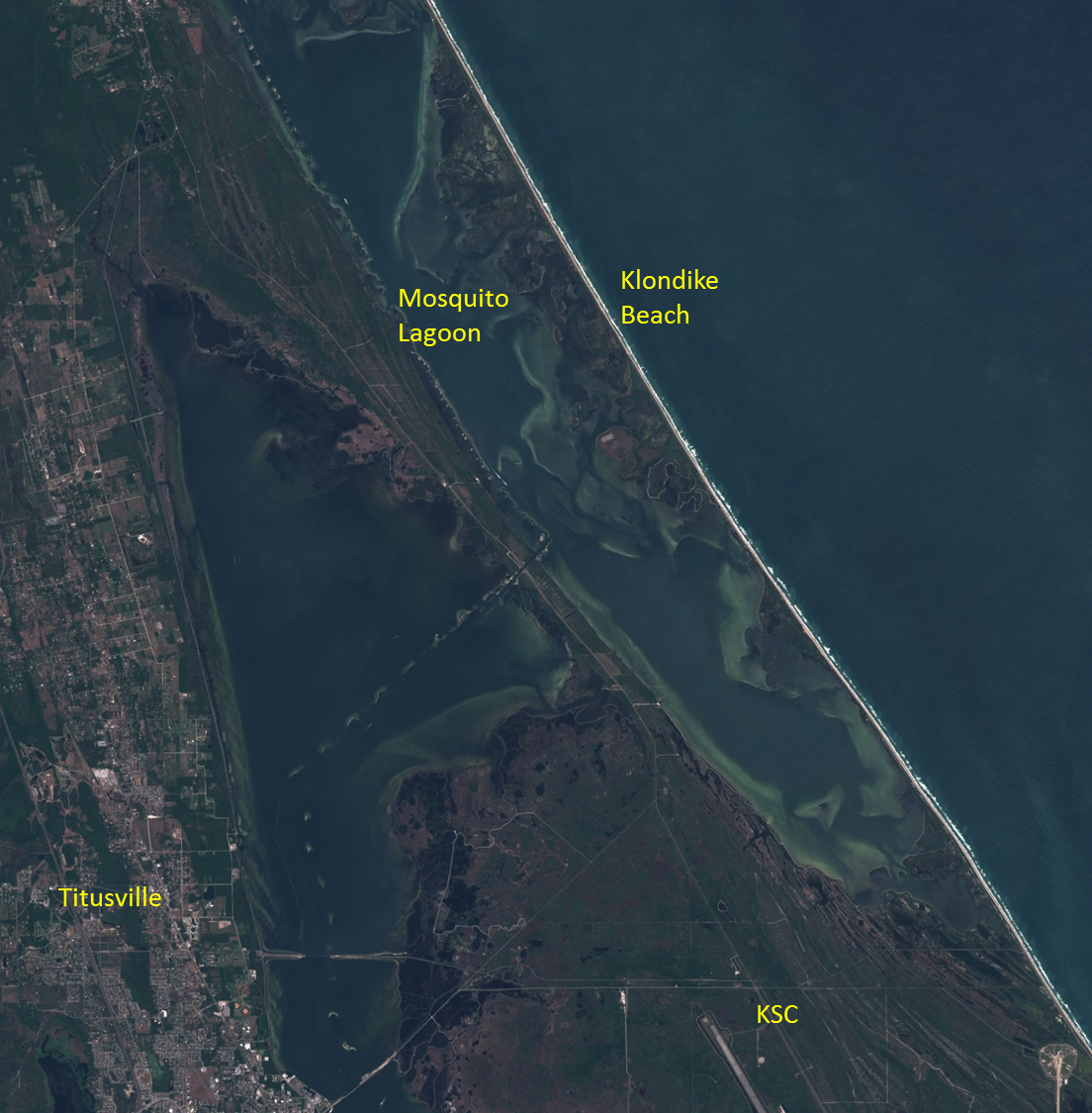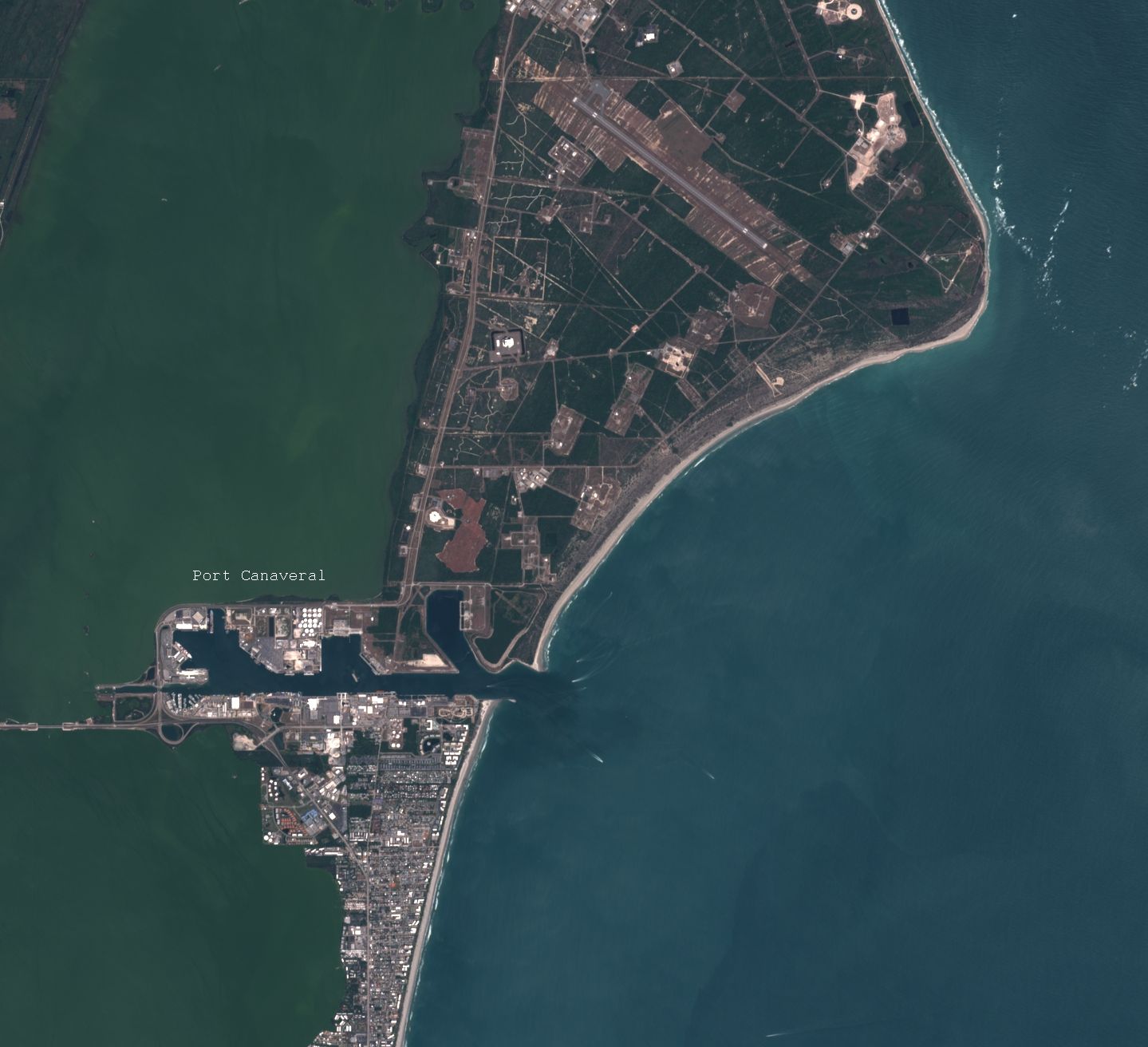 L’image prise par le satellite Sentinel-2 permet de bien mettre en évidence les différents sites de la base du Cap Canaveral. Sur l’océan Atlantique, le Cap Canaveral en lui-même regroupe les installations militaires du CCAFS : on y relève les complexes de tir 34 et 37 qui ont permis le lancement de fusées Saturn pour le programme Mercury ainsi que dans le domaine militaire le pas de tir des fusées Pershing 1 (1960/1963) dont le nom évoque à lui tout seul la course aux armements liée à la Guerre Froide.