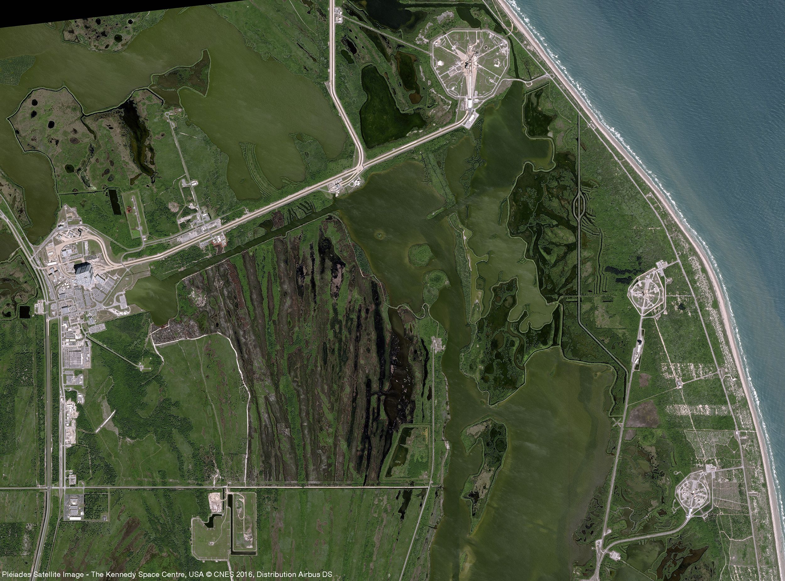 Par sa résolution à 0,5m, l’image prise par un des satellite Pléiades permet de mettre en évidence le Vehicle Assembling Building. Le VAB est un des plus grands bâtiments industriels construit au monde, il permettait l’assemblage vertical des fusées Saturn 5 dont la hauteur dépassait les 110m. Les dimensions du VAB sont exceptionnelles : il couvre une surface au sol de 3,25 hectares, il mesure 160 m de haut, 218 m de long et 158 m de large. Son volume intérieur est de 3,7 millions de m3. Il est aujourd’hui le bâtiment le plus emblématique de tout le site de Cap Canaveral avec son drapeau américain de 65m sur 33m réalisé en 1976 année du bicentenaire de la Déclaration d’Indépendance américaine.