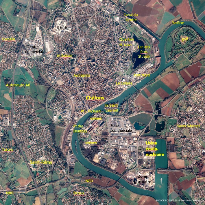Chalon bénéficie de véritables atouts, dans la mesure où sa position centrale, sur un axe de communication majeur en fait un passage obligé pour les flux Nord-Sud ou Sud-Nord. Sur l’image satellite, on peut ainsi noter, à l’ouest, les lignes de chemin de fer, mais aussi l’autoroute A6, ainsi qu’une départementale qui longe la Saône en direction de Lyon. La ville est aussi bien reliée aux principales aires urbaines qui l’entourent, on peut penser notamment à la N80 au sud-ouest de l’image qui permet aux Chalonnais de rejoindre le Creusot en 40 minutes, ou la gare TGV de Montchanin en 35 minutes.